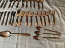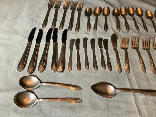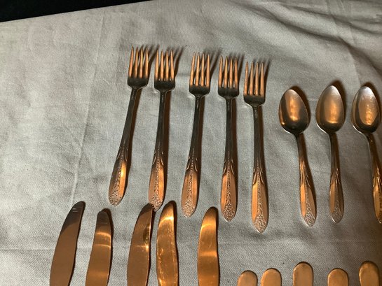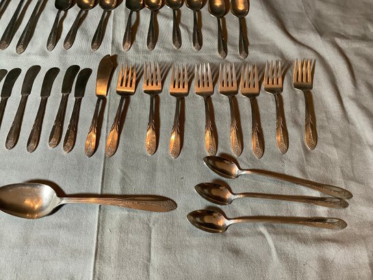 5 pcs each dinner forks and knives, 9 tea spoons, 8 salad forks, 6 butter knives, 3 ice tea spoons, 2 soup spoons and 1 each large spoon and butter knife.