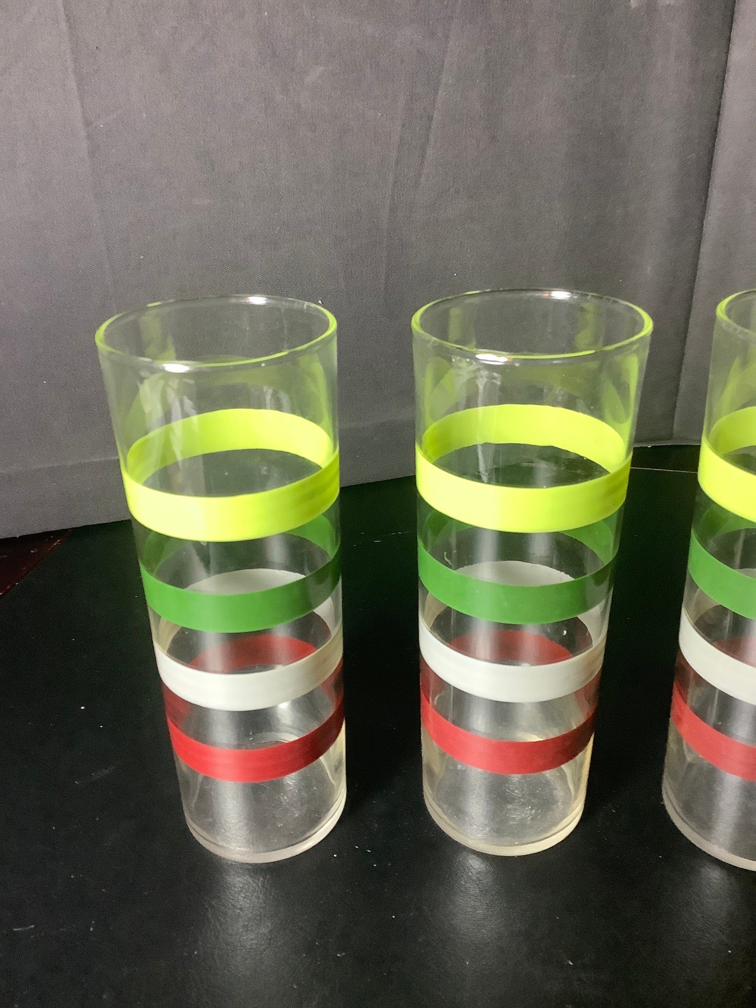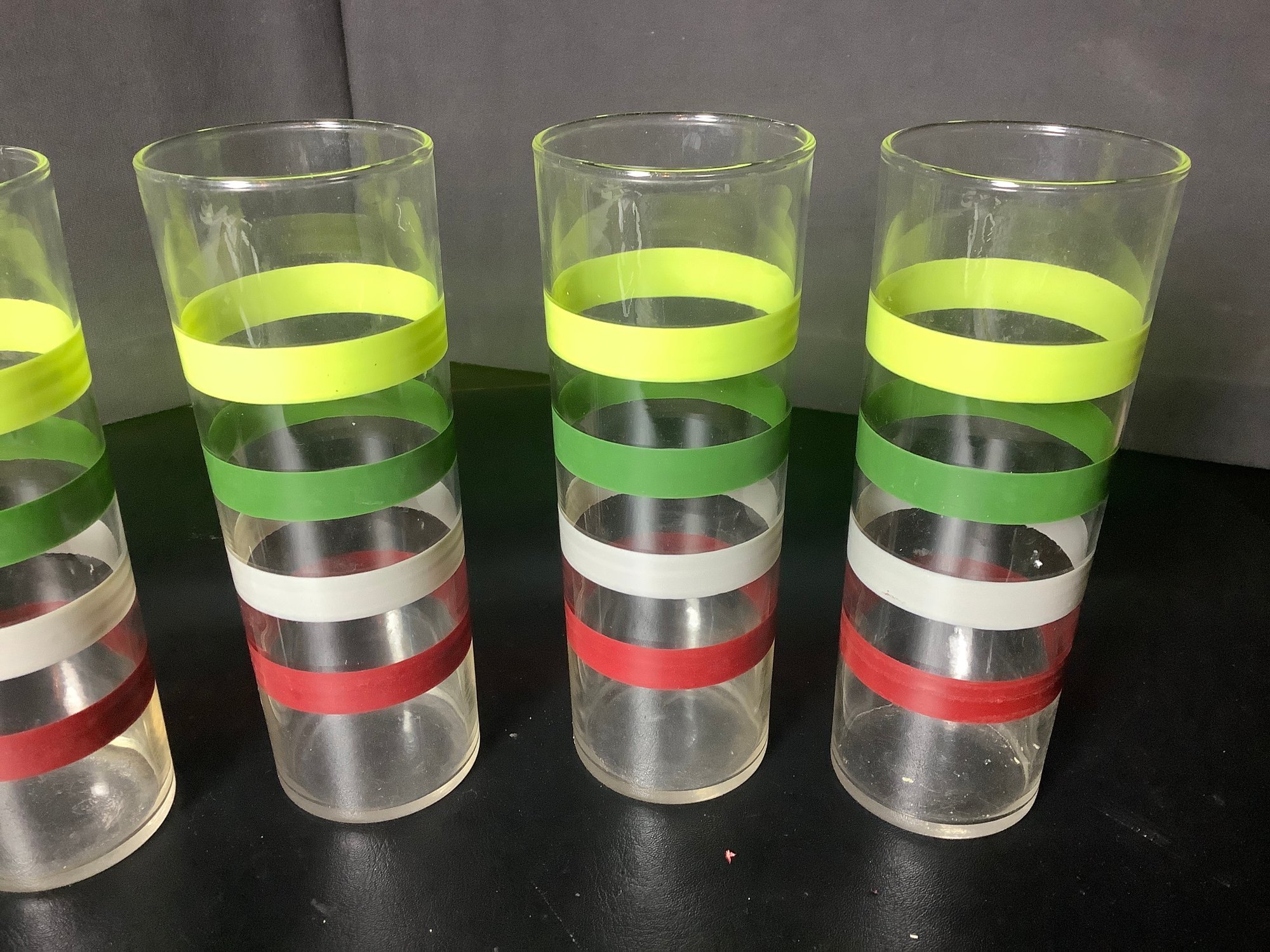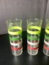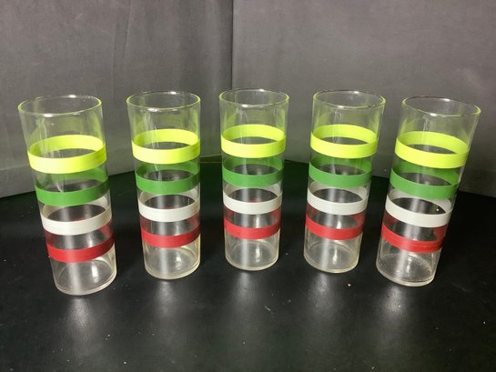 5 pieces of MCM 1950’s Fiesta Striped Glasses. Size 2-1/4” diameter x 6-3/4” tall. Photos are part of the description. Pre-owned. NO SHIPPING !!!!