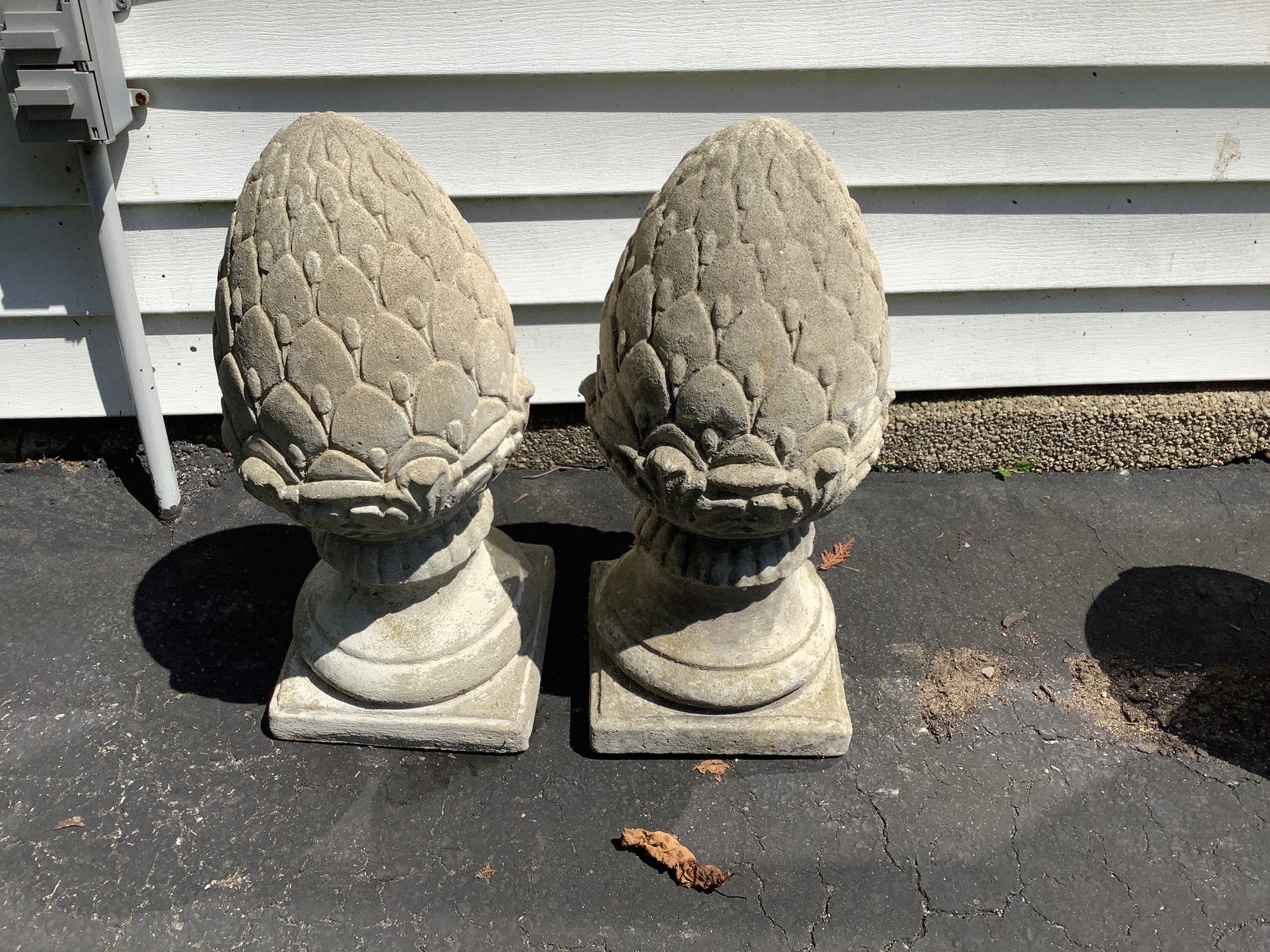2 cement pineapples. Size 18-1/2” tall. Heavy bring help to move!!!Located in back yard. Photos are part of the description. Preowned . NO SHIPPING.