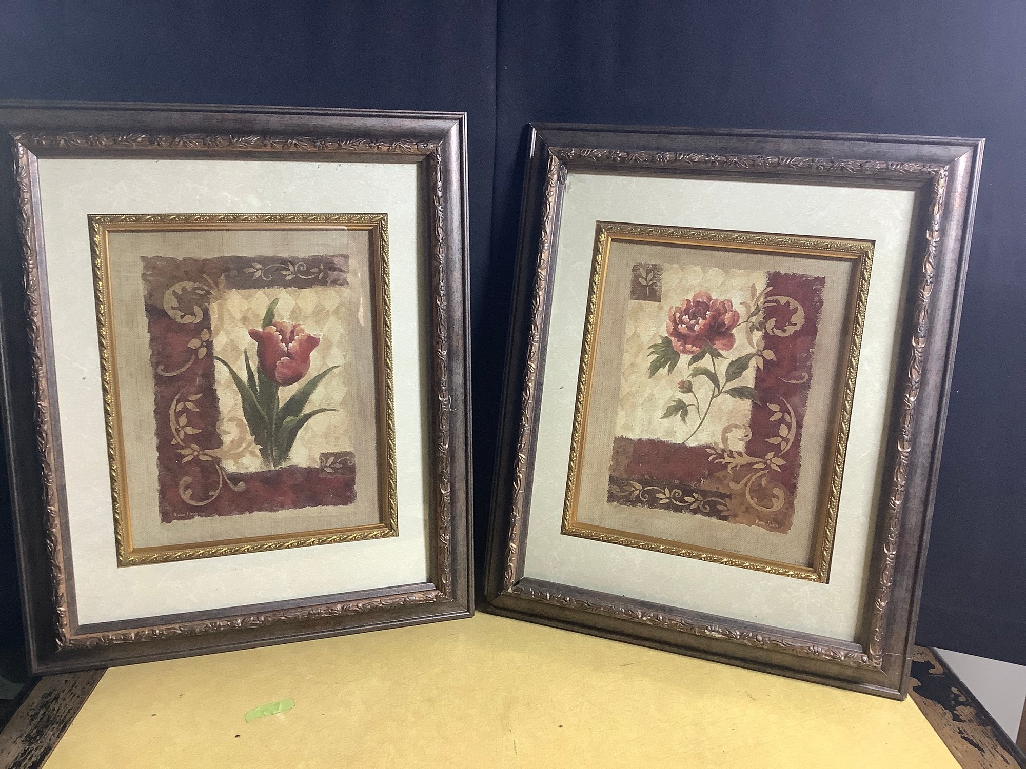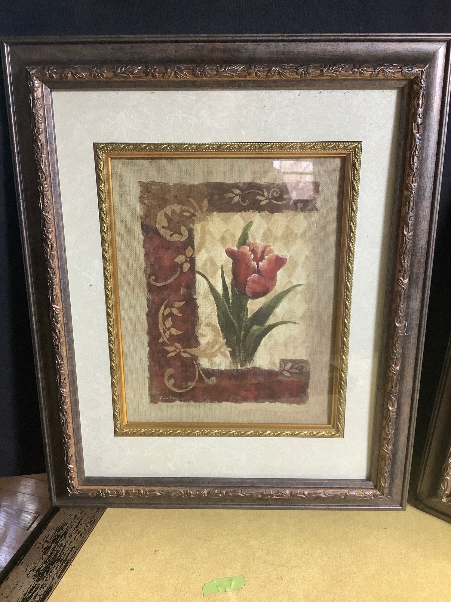2 Framed Floral prints by Vivian Flasch. Size 14” x 17”. Preowned. Photos are part of the description. NO SHIPPING!!!