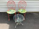 2 Outdoor metal chairs with table Chair size 15” x 16” x 33” tall. And table 16” x 16” x 18”. Photos are part of the description. No shipping. Pre-owned.