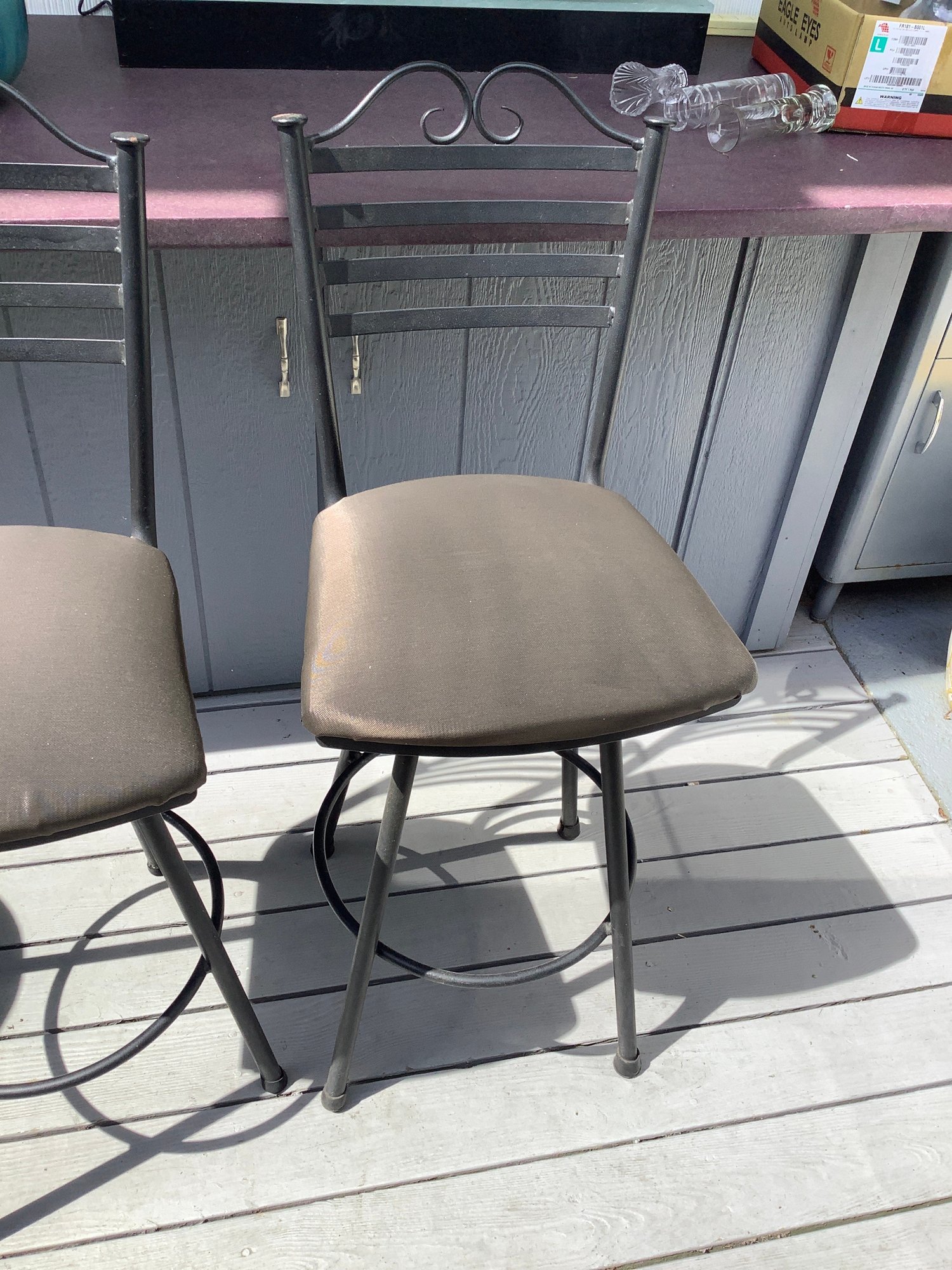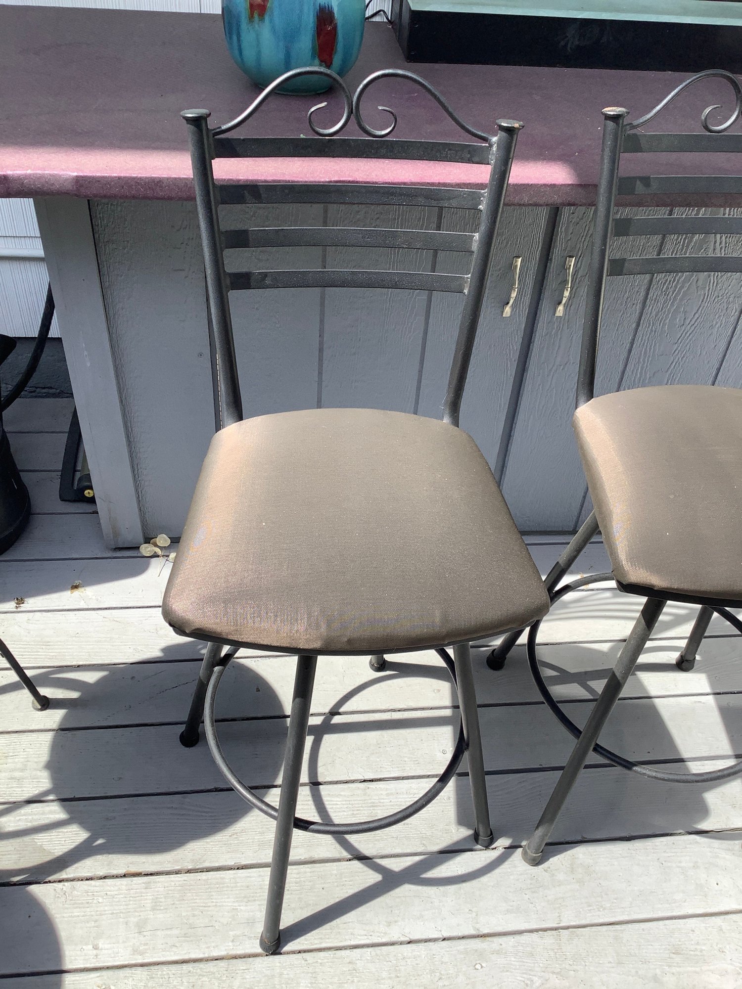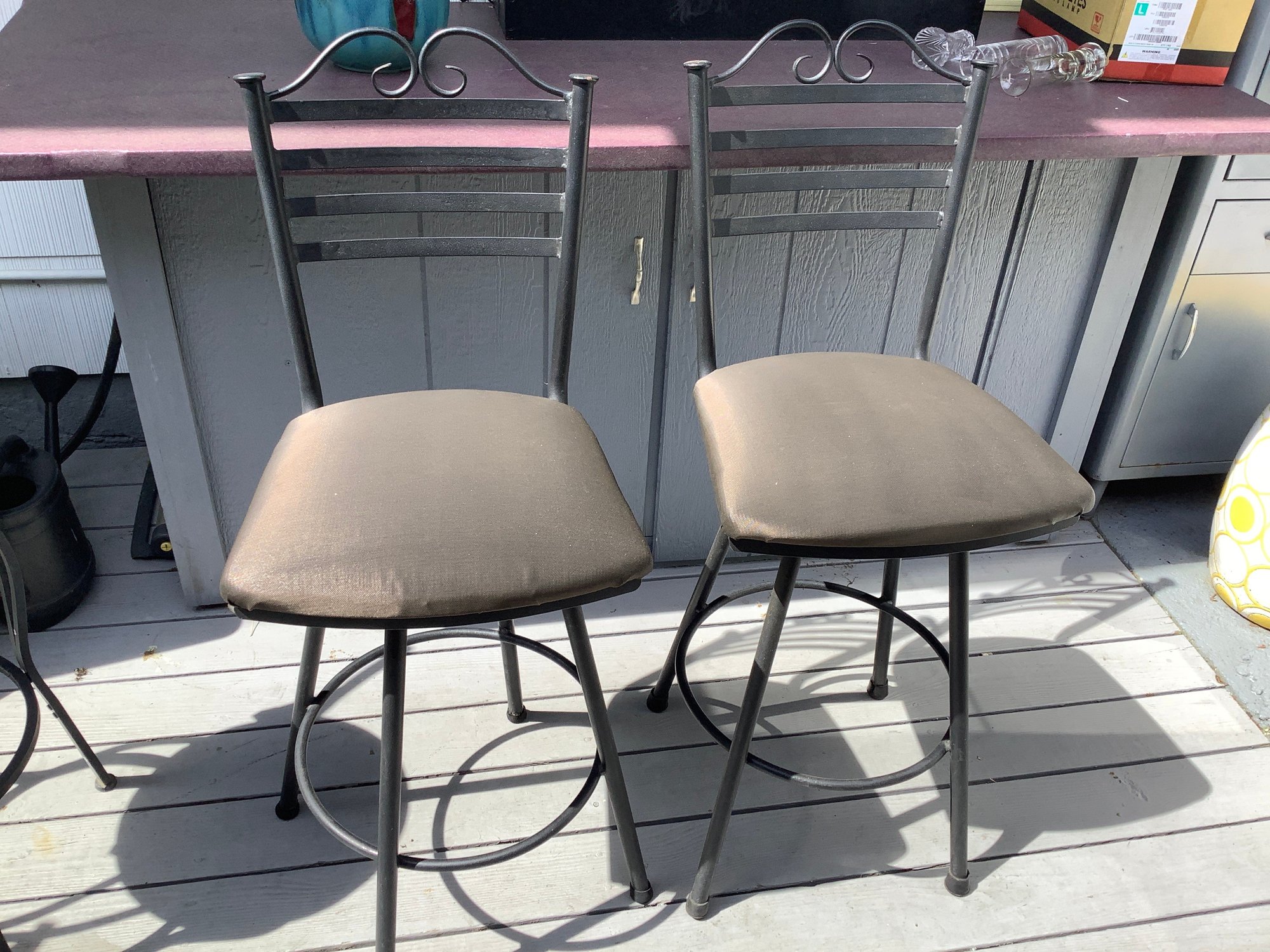 2 outdoor cushioned bar stools . Size 24” x 24” x 45” tall. Great condition. Cushion is 18” x 18”. Photos are part of the description. Pre-owned. No shipping.