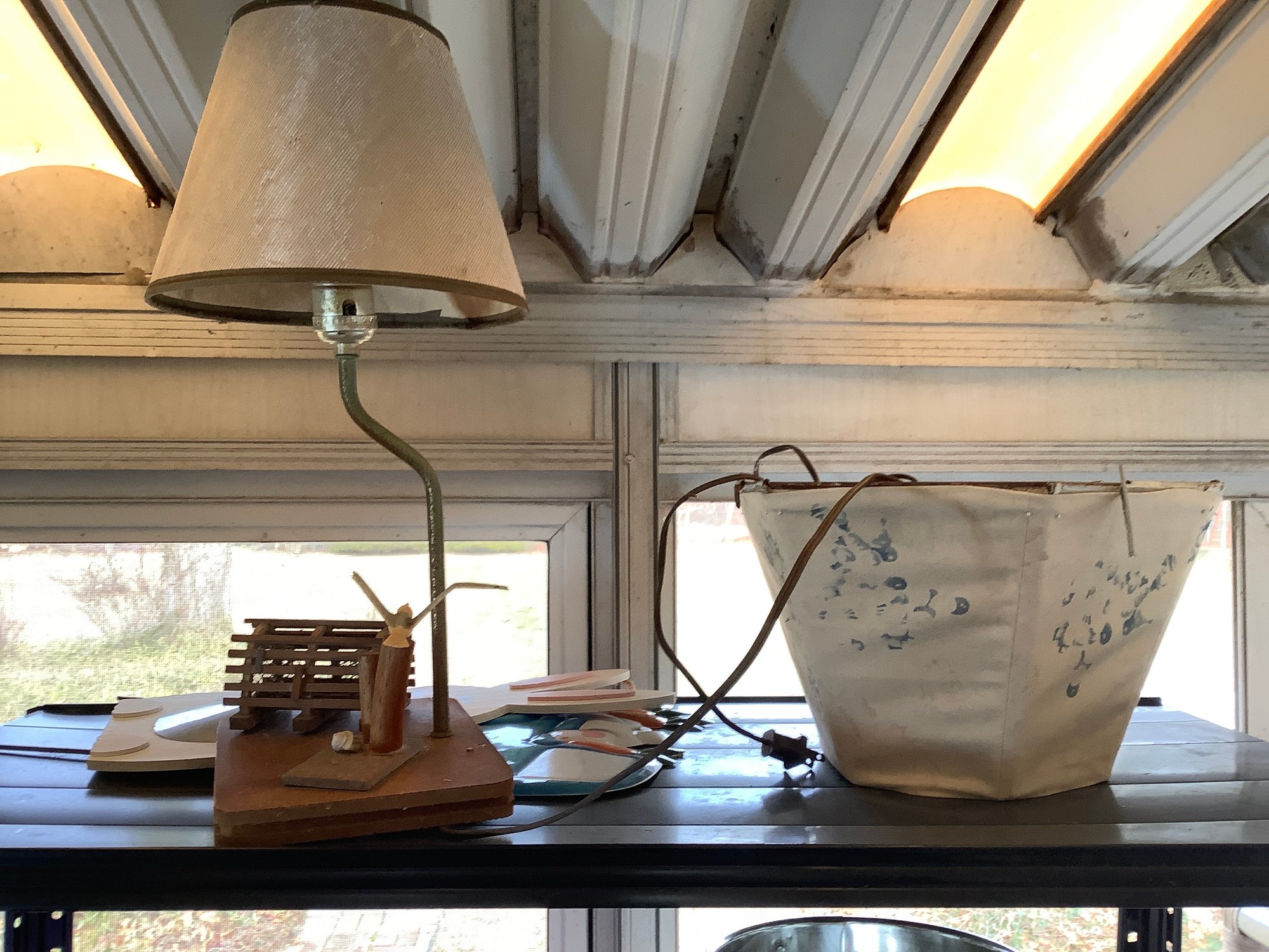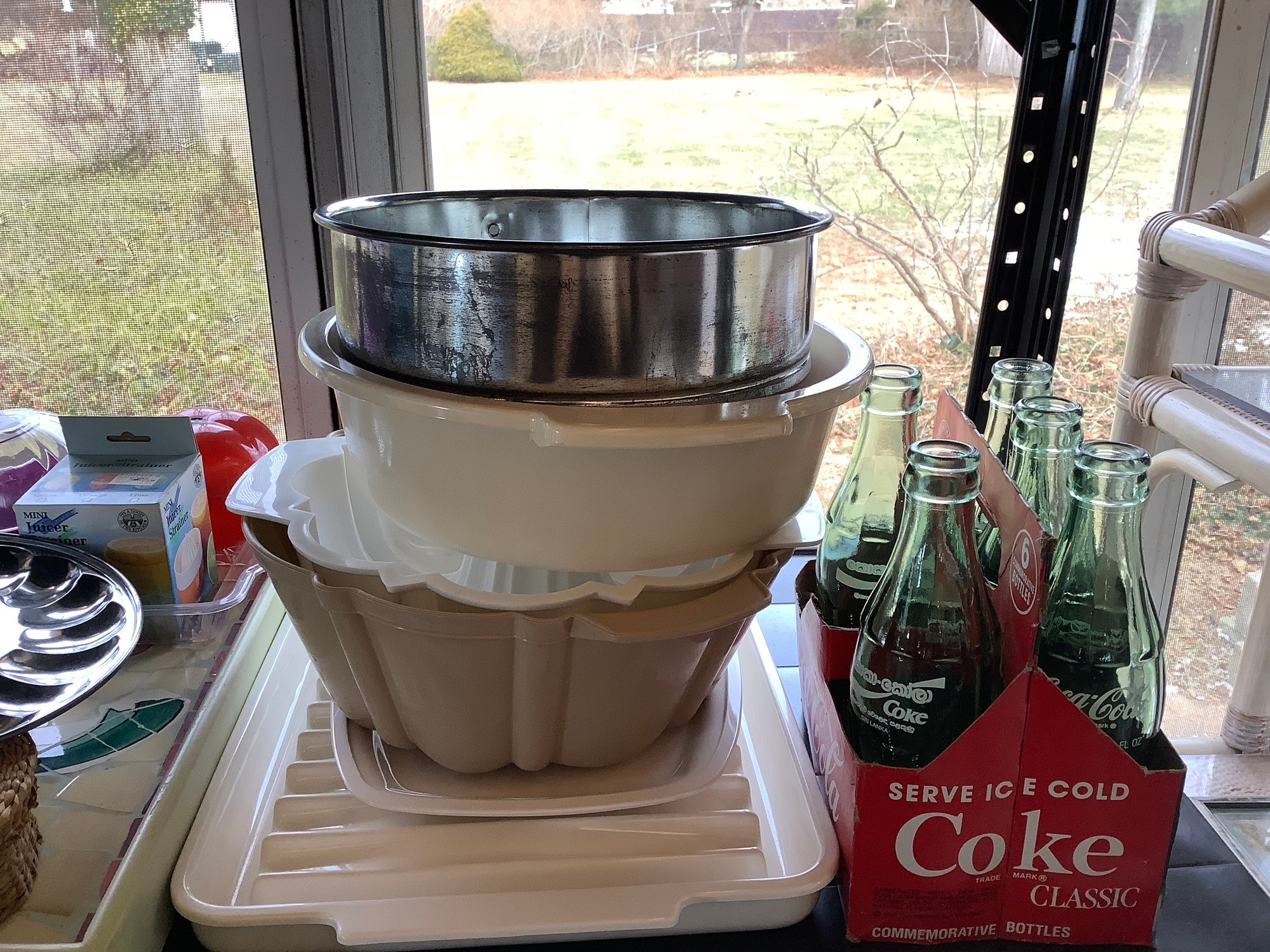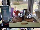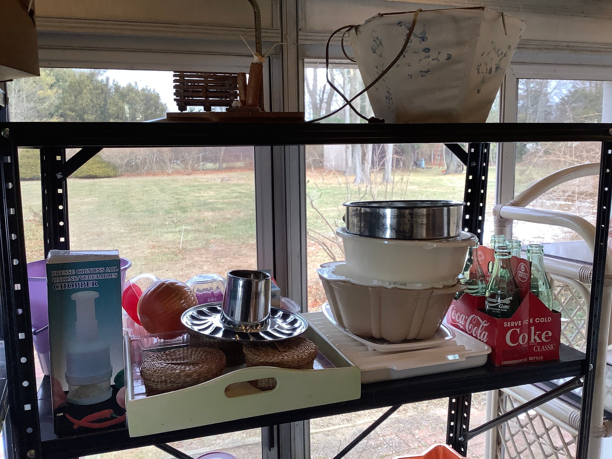 2 shelves Cookware and decor. Includes Lamp, chopper, spring form pan, coke bottles and more. Photos are part of the description. Preowned. NO SHIPPING.