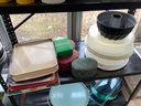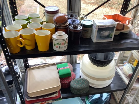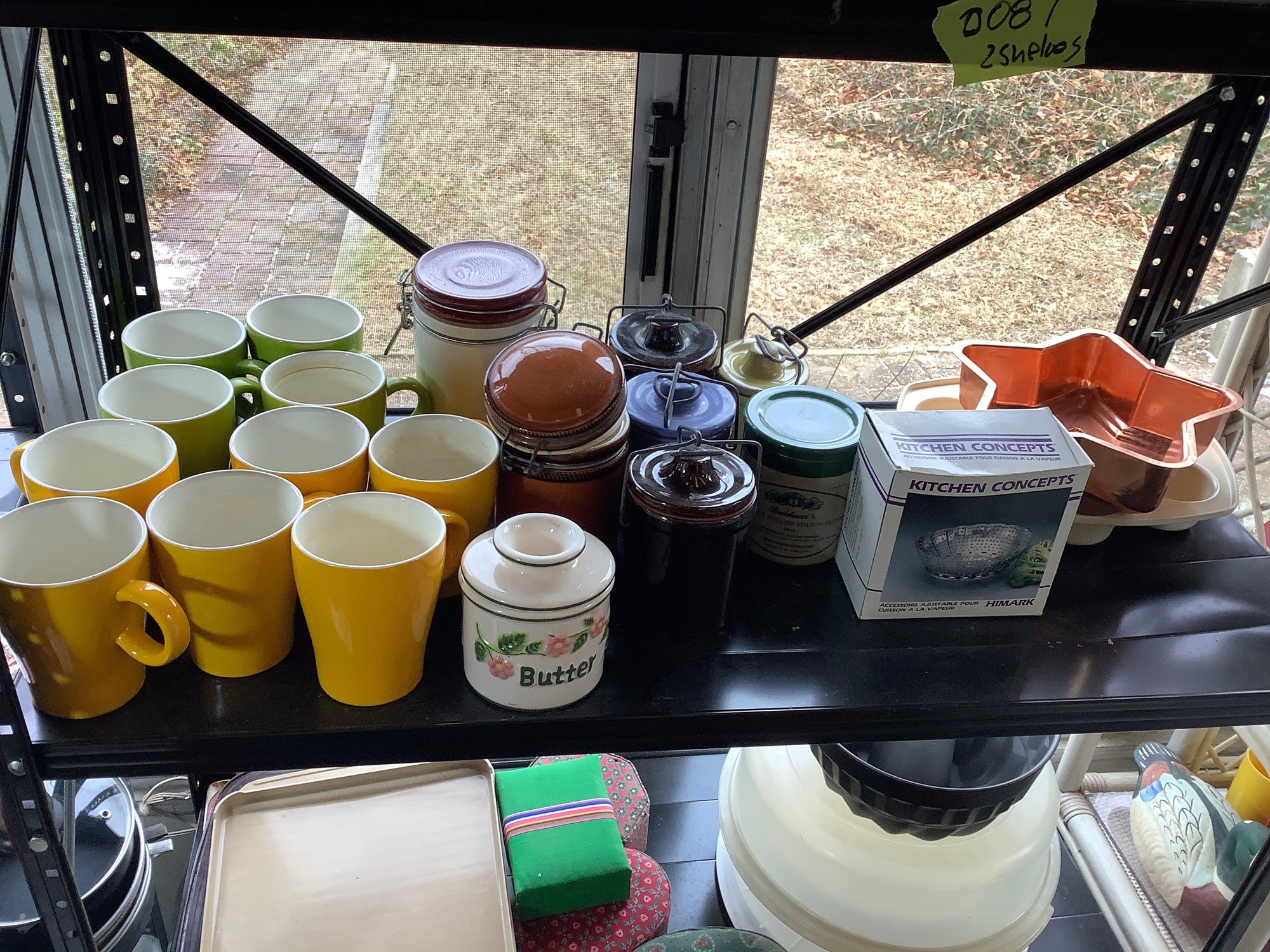 2 shelves Cookware and decor. Includes crocks, mugs, steamer, storage boxes and more. Photos are part of the description. Preowned. NO SHIPPING.