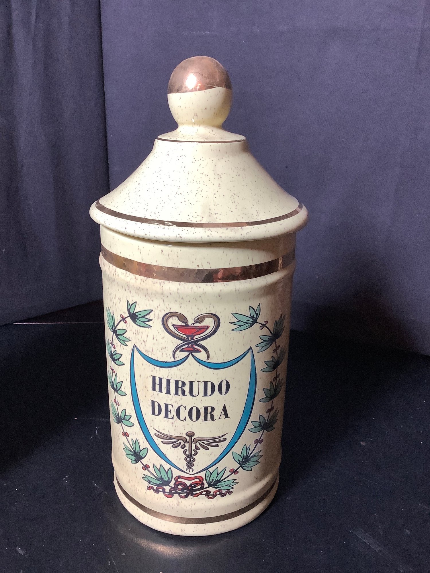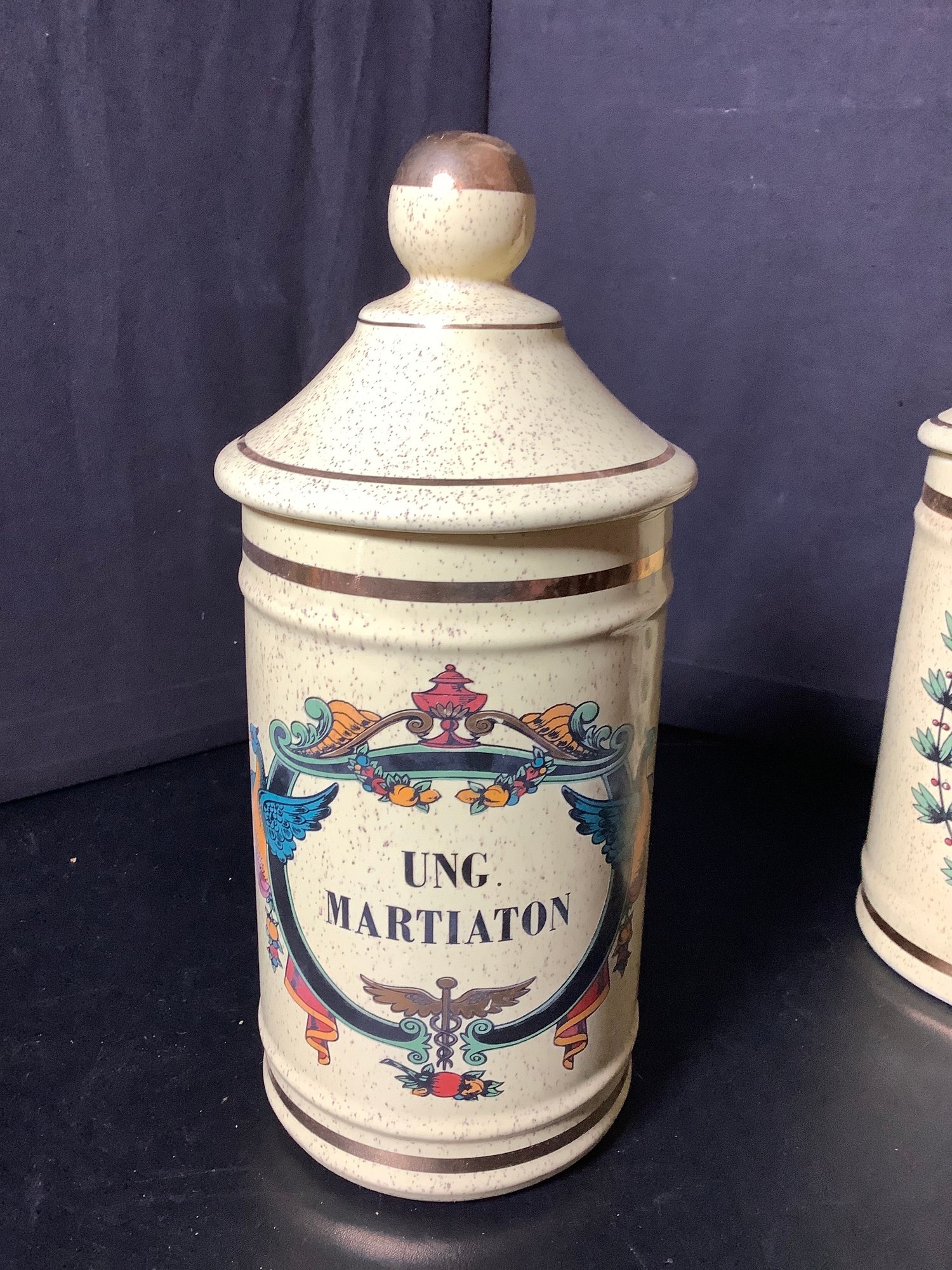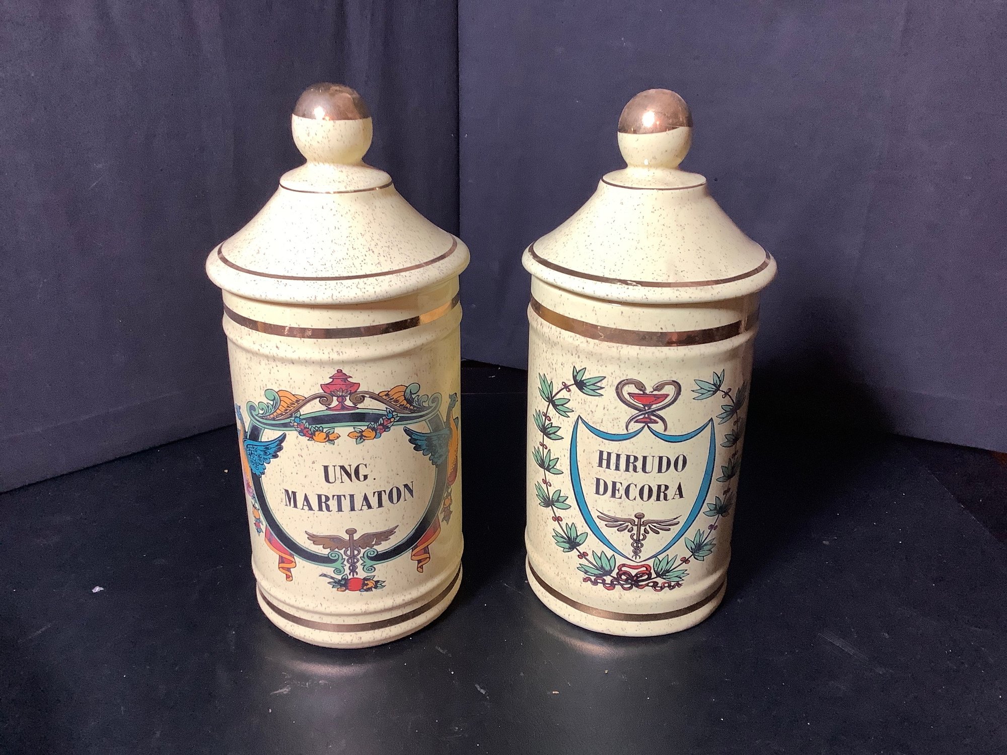 2 vintage Pharmacy / Apothecary jars. Includes UNG MARTIATON and HIRUDO DECORA. Size 11” tall. Preowned. Photos are part of the description. NO SHIPPING!!