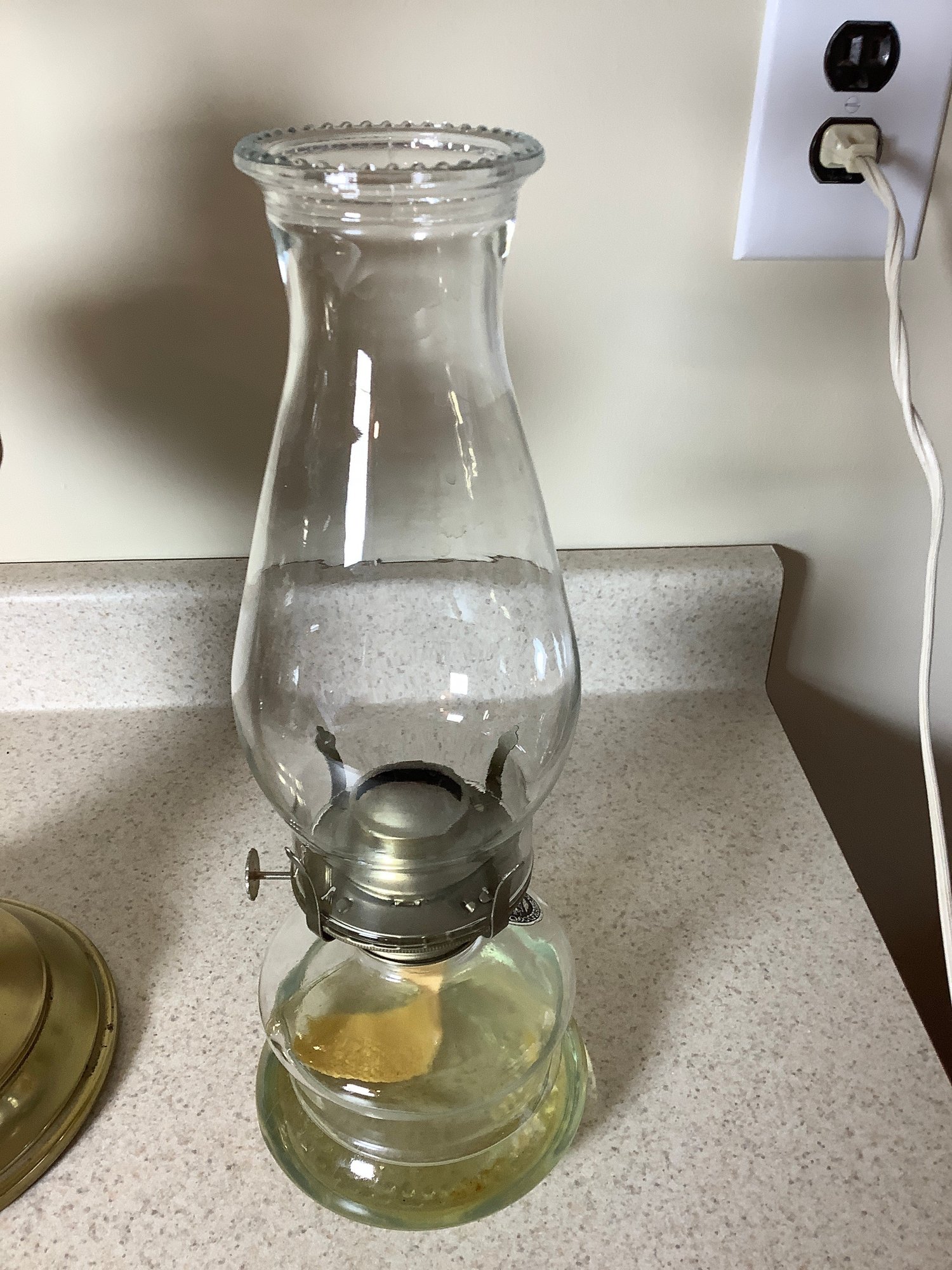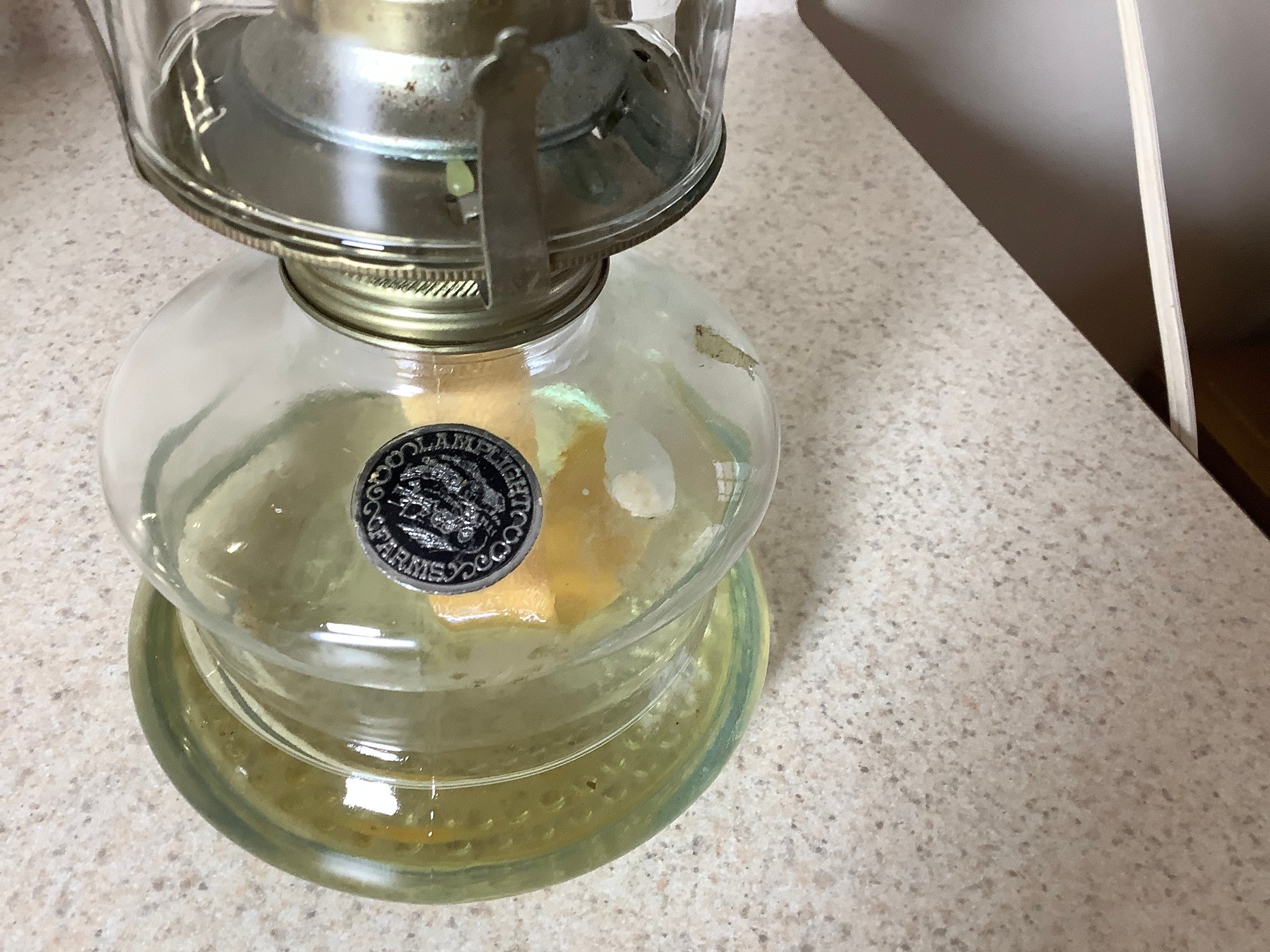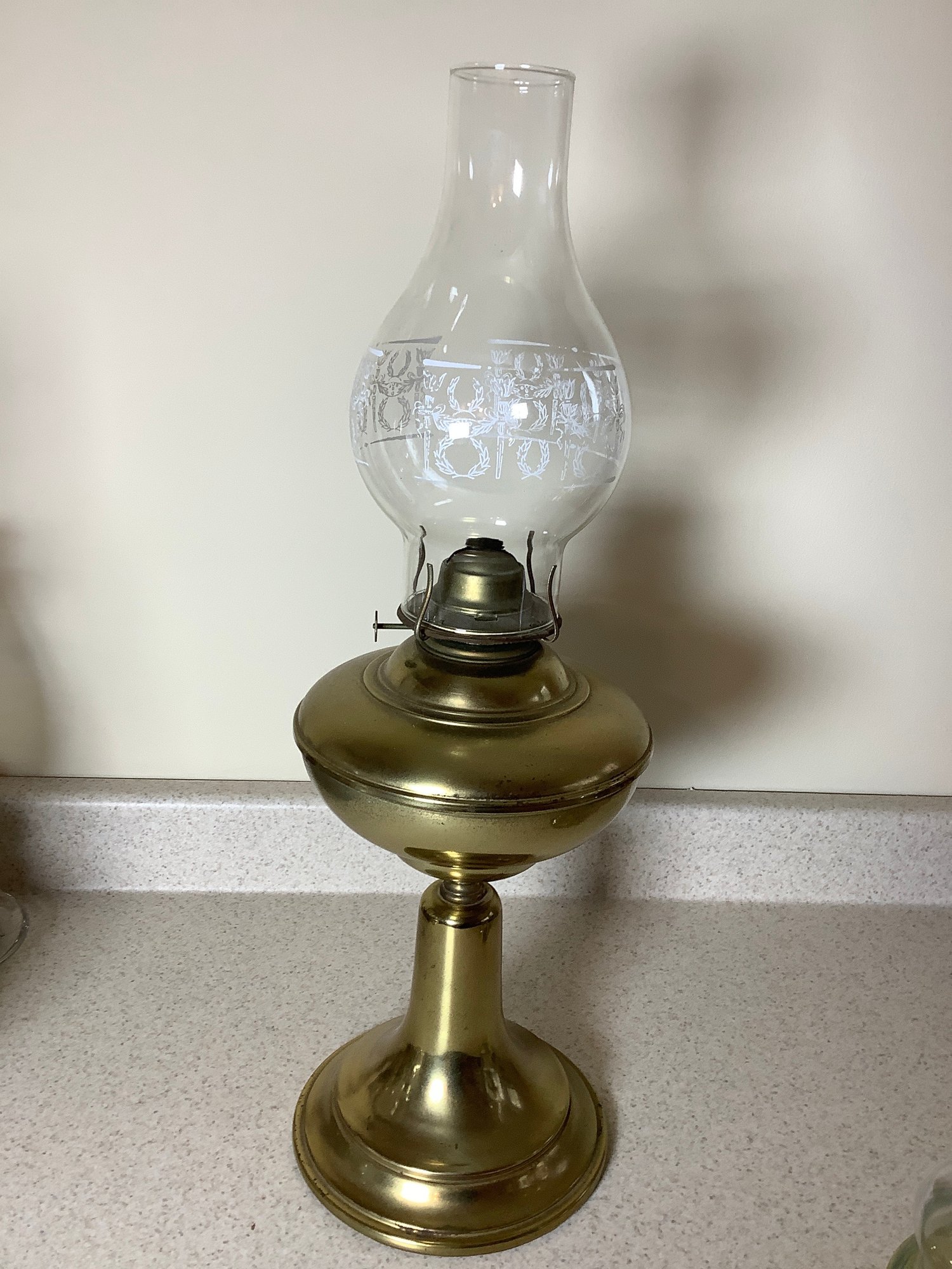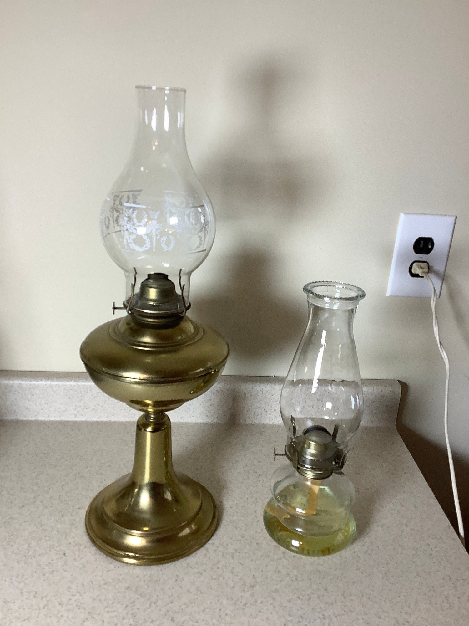2 vintage oil lamps. One is glass and the other is a metal base. Tallest is 21” with chimney. Photos are part of the description . Preowned. NO SHIPPING.