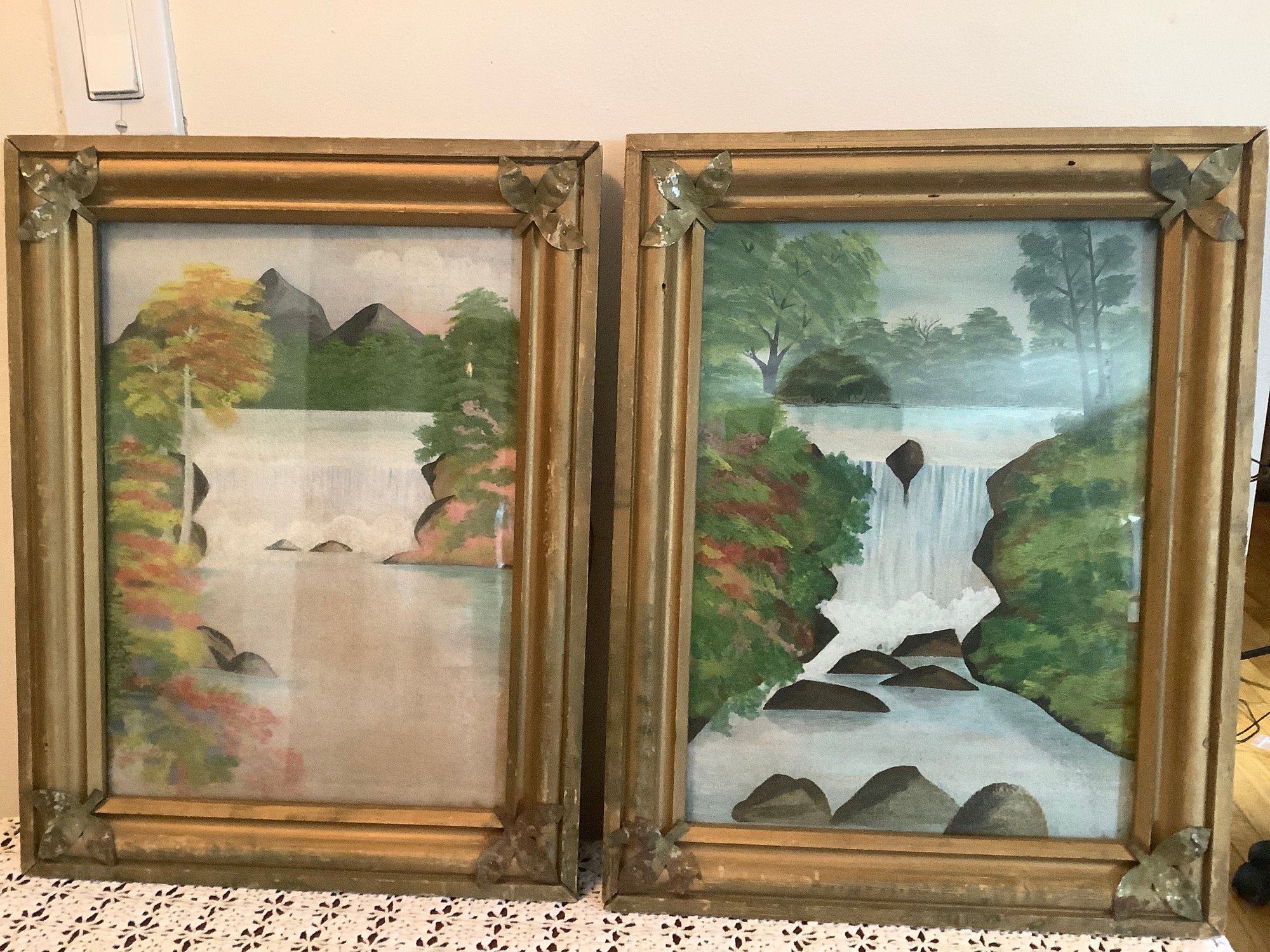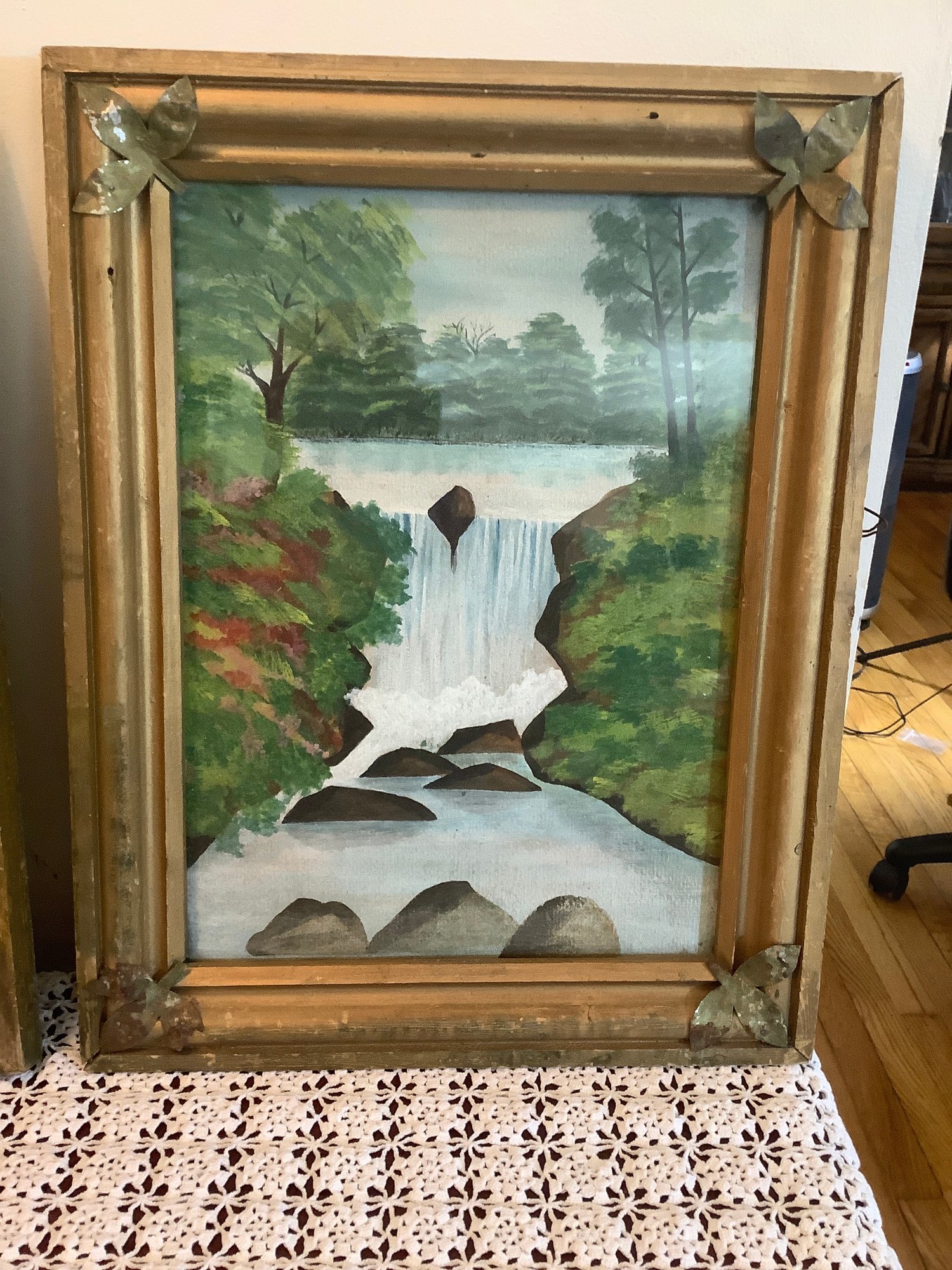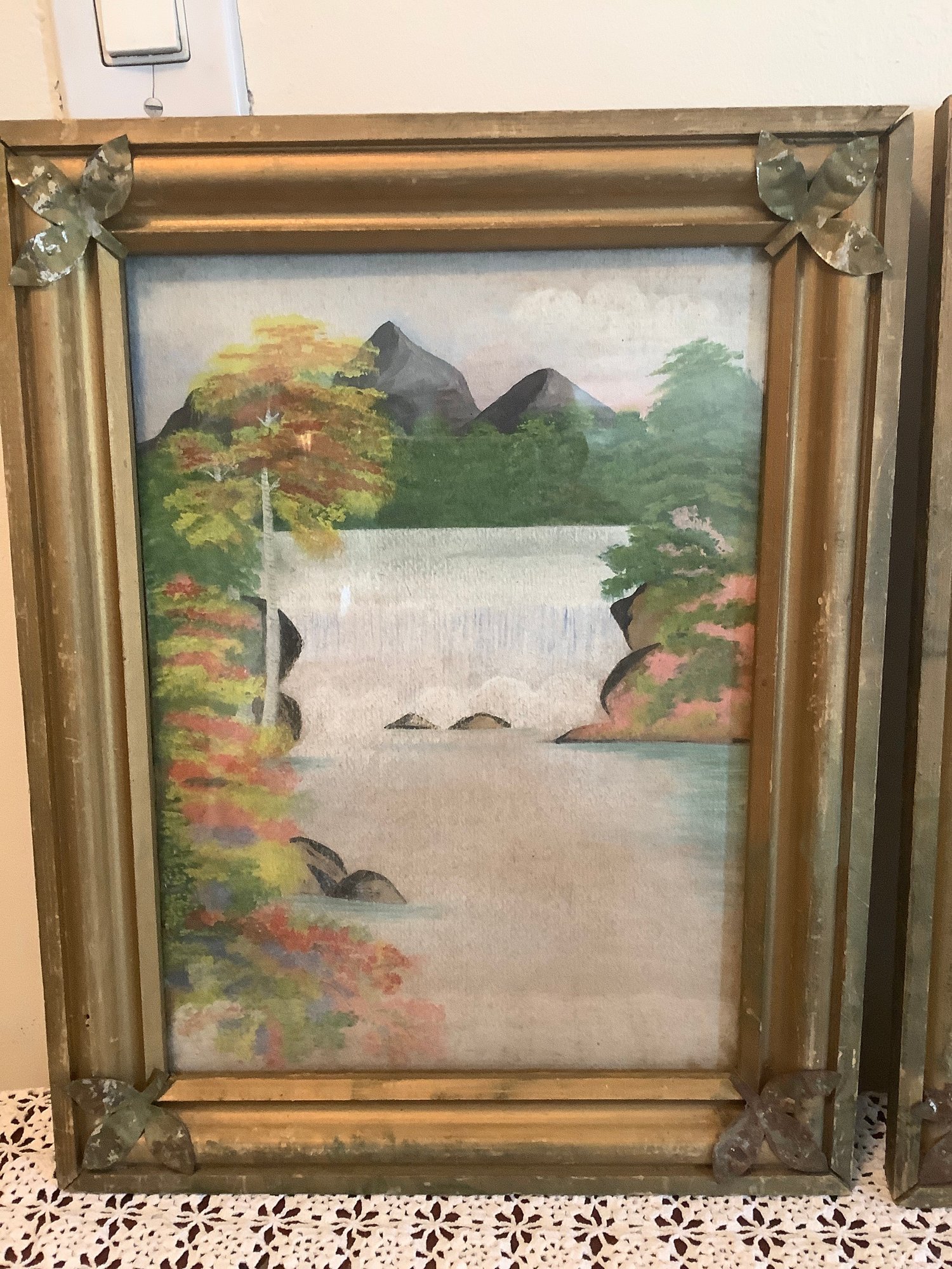 2 Framed watercolors on board. Circa 1928. Subject water falls . Size 13” x 17”. Preowned. Photos are part of the description. NO SHIPPING !!!!!!
