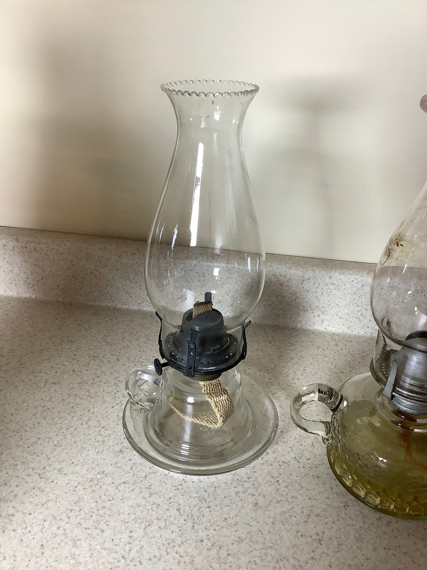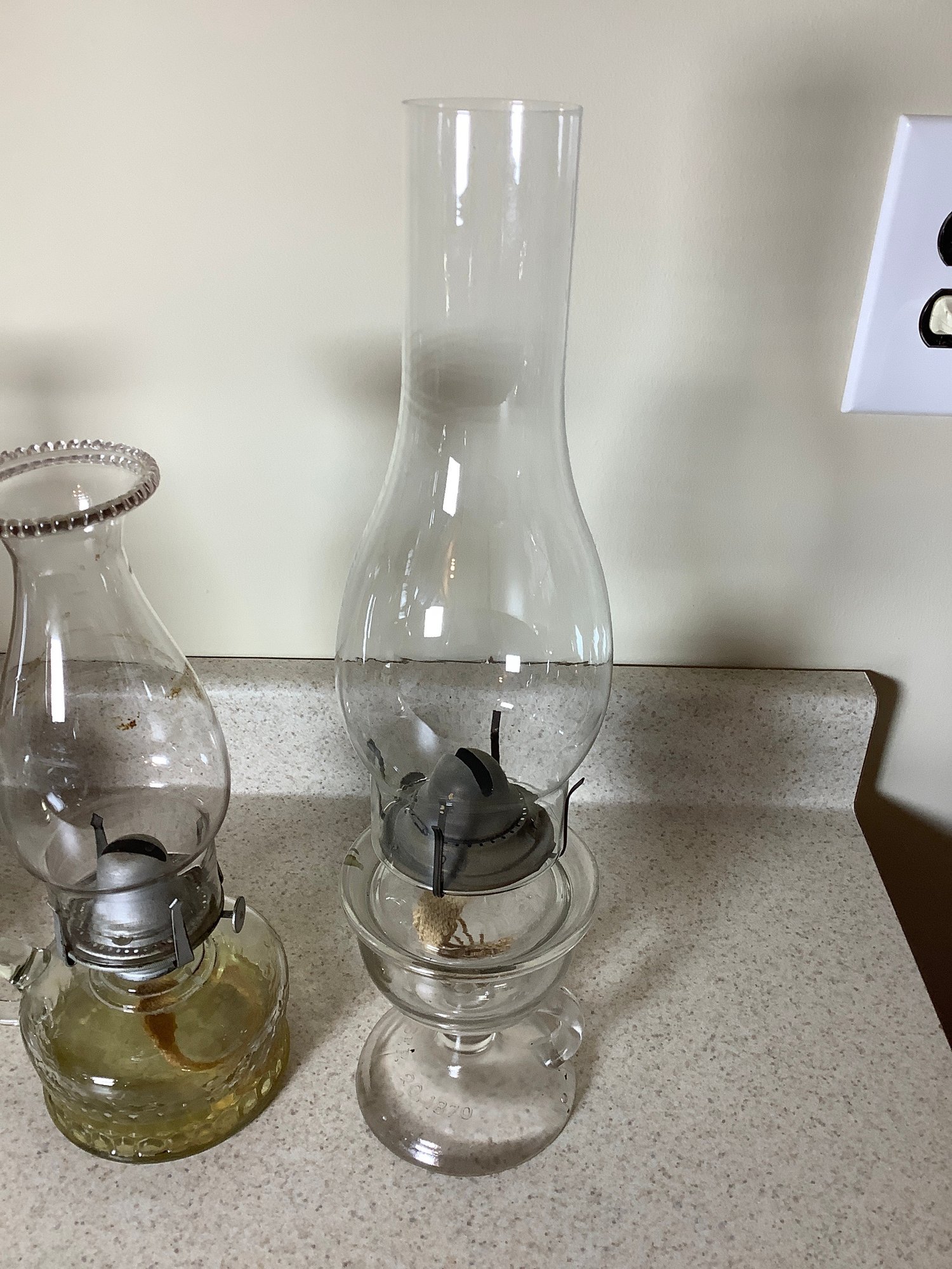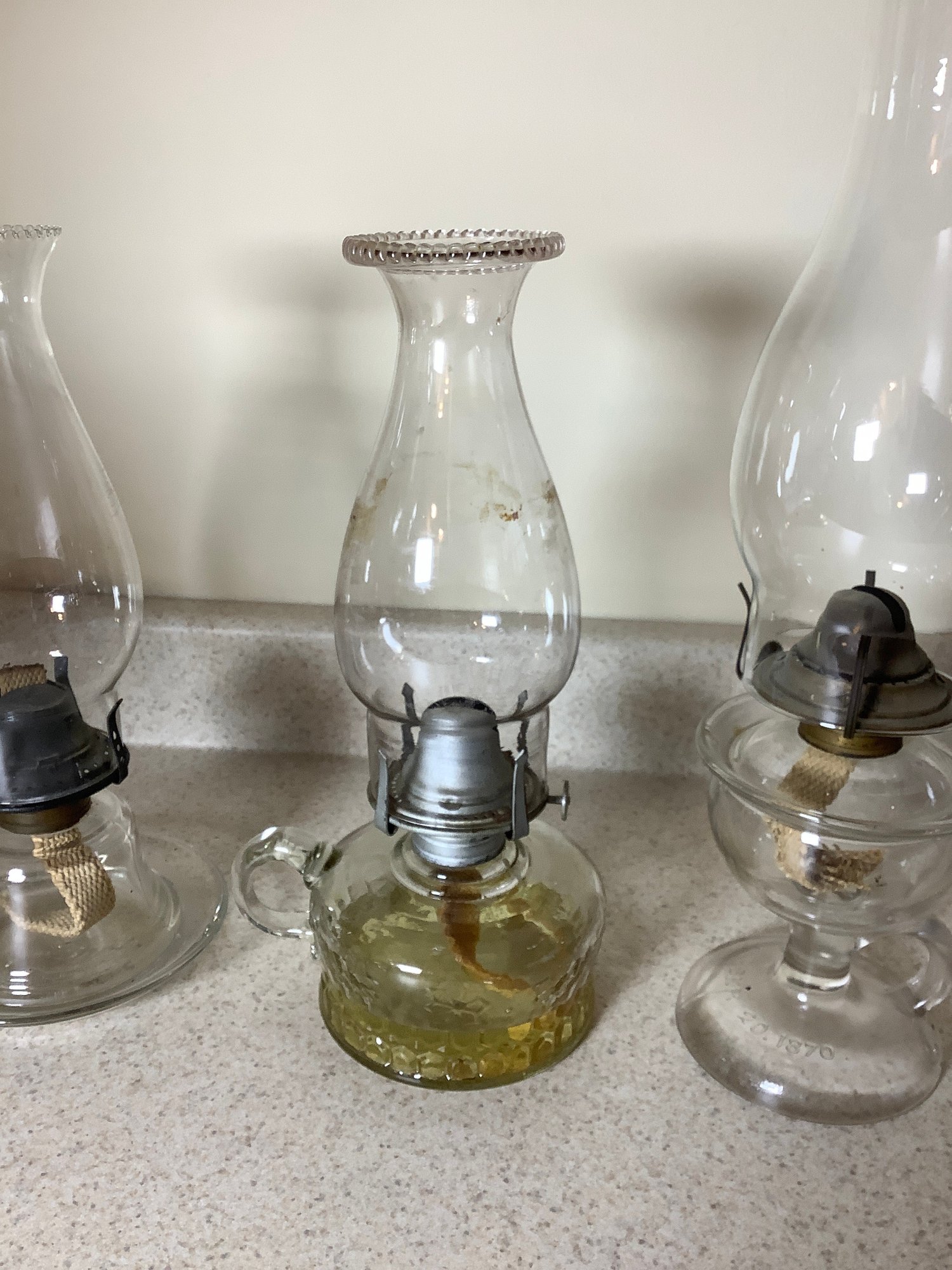 3 vintage oil lamps. All have a carry handle. Tallest is 16” with chimney. Photos are part of the description .