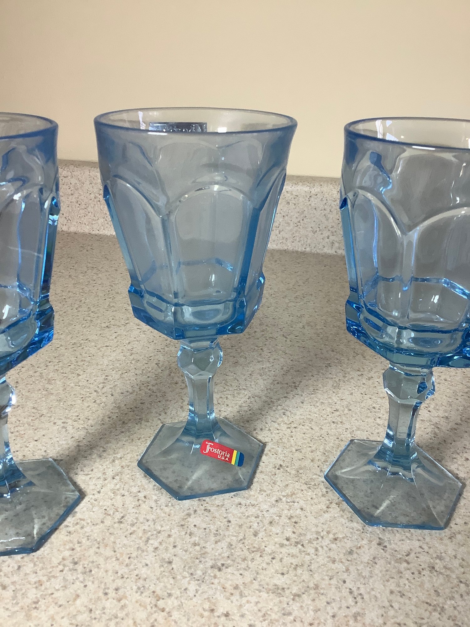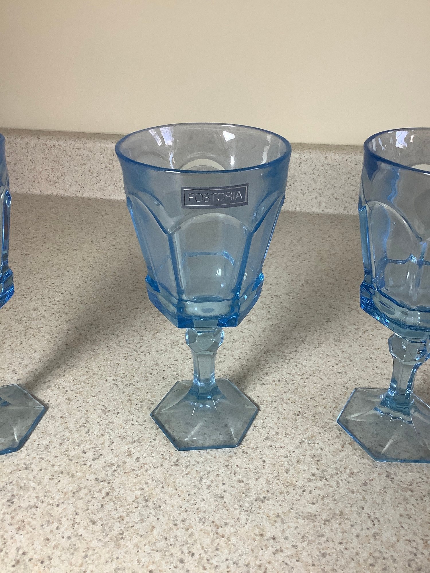 4 Fostoria blue wine glasses. Size 7” tall. Marked Fostoria . Photos are part of the description . Preowned. NO SHIPPING.