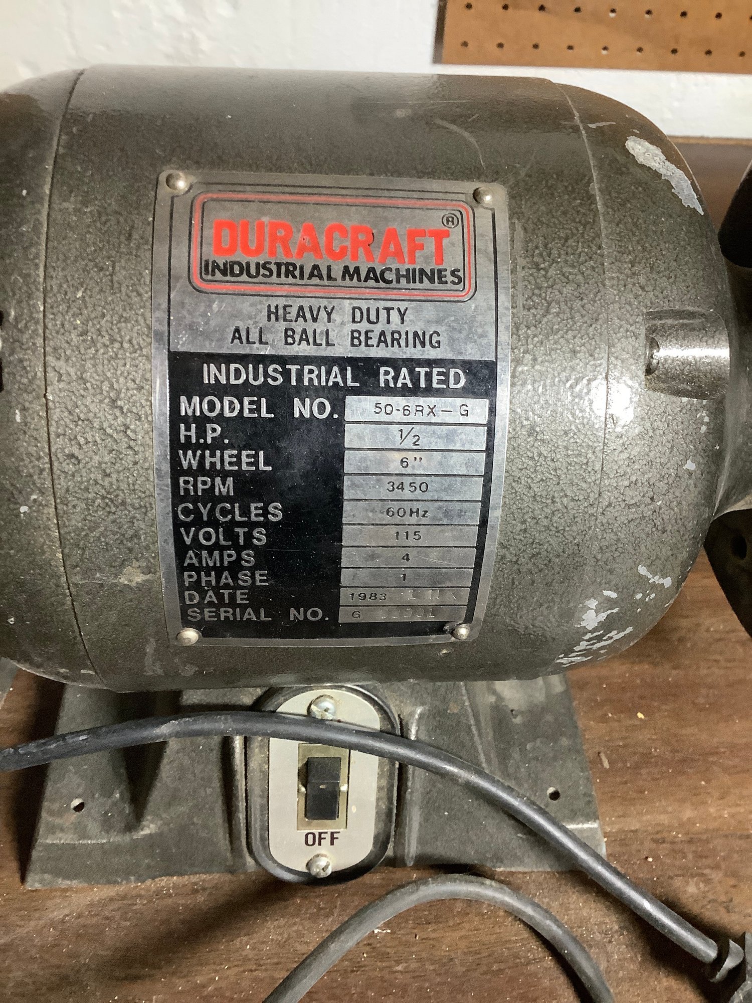 Duracraft 6” bench grinder. 1/2 HP , 3450 RPM. Model 50- 6RX- 6. 120/60. Photos are part of the description. Preowned. NO SHIPPING. Untested.
