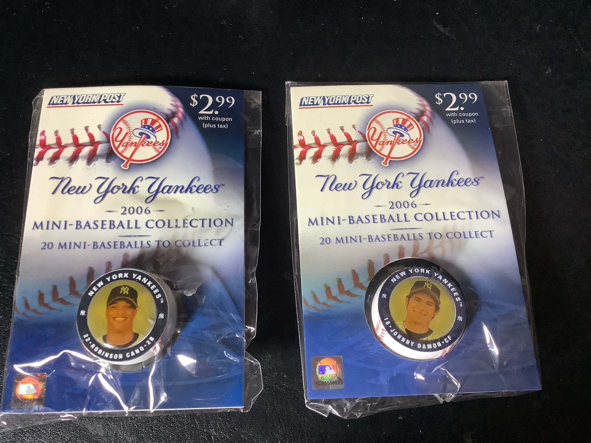 Groups of 6 NY Yankees Mini-baseball 2006 collection. Promotion by the NY Post. In sealed packages. Includes players like Robinson Cano, Johnny Damon, Hideki Matsui and more. Photos part of the description.