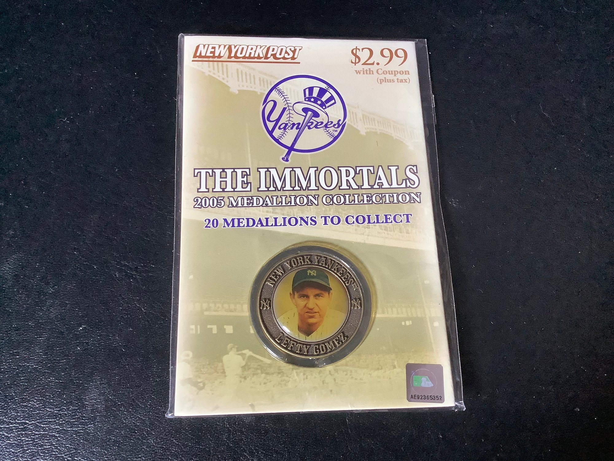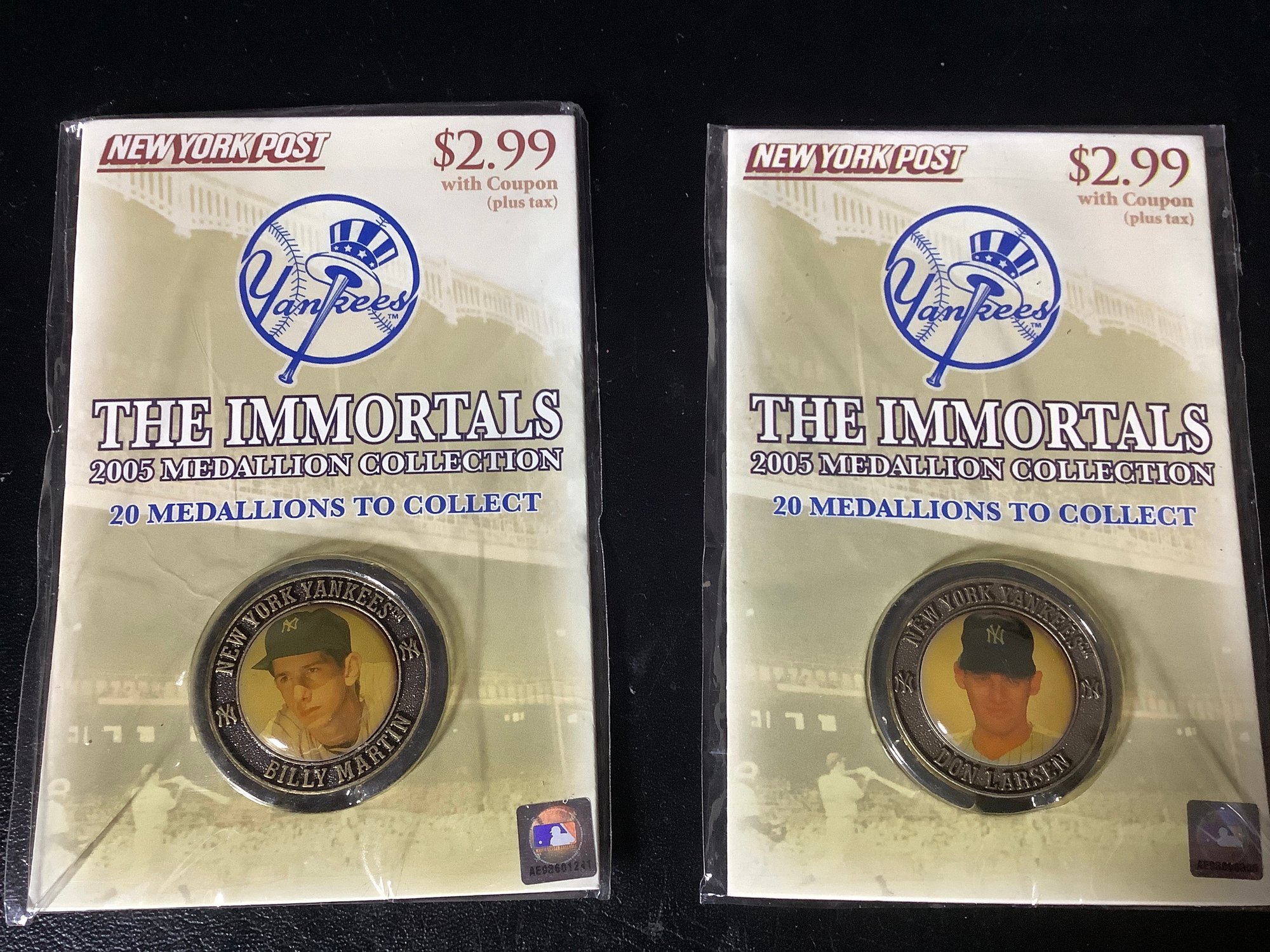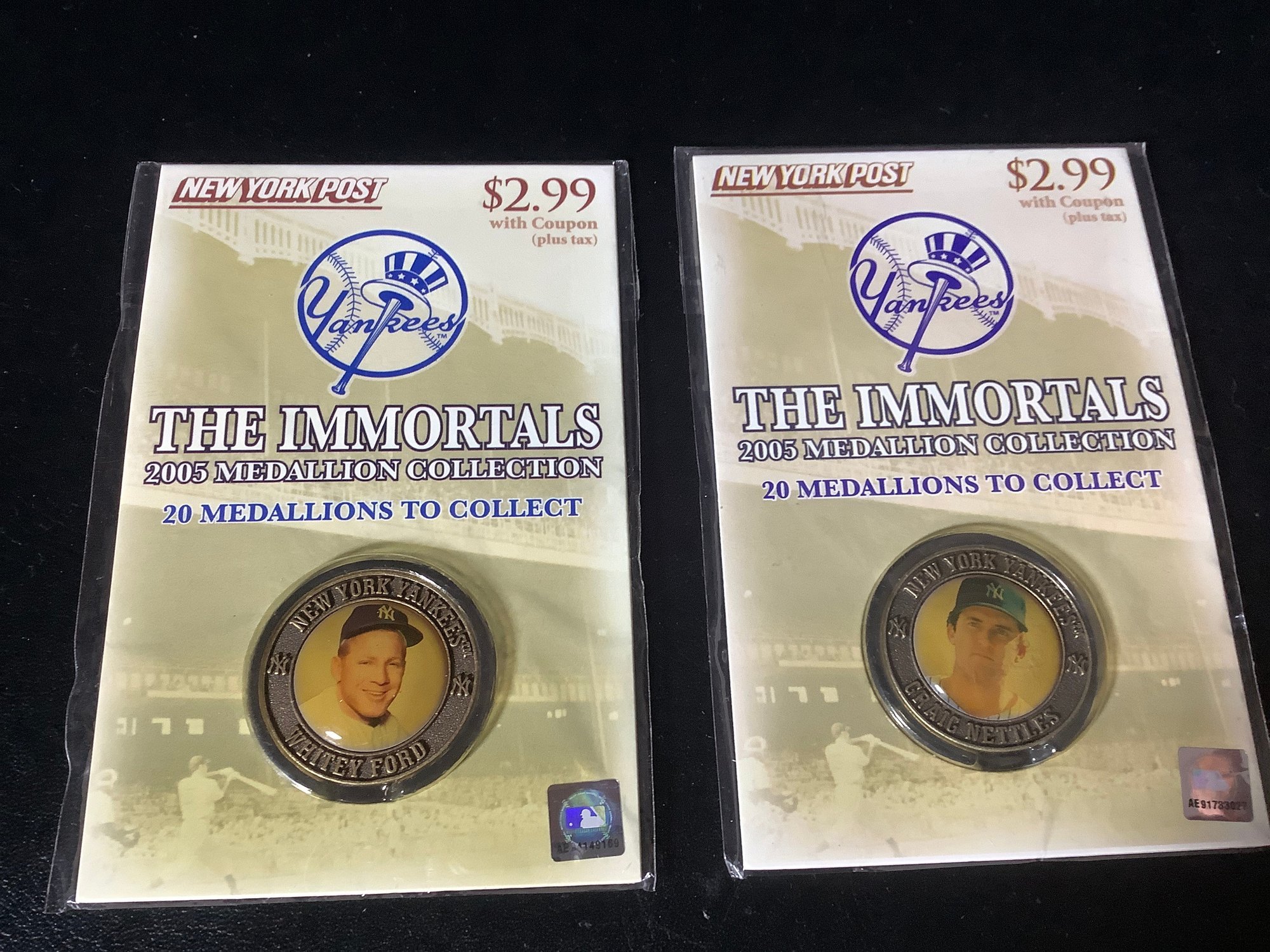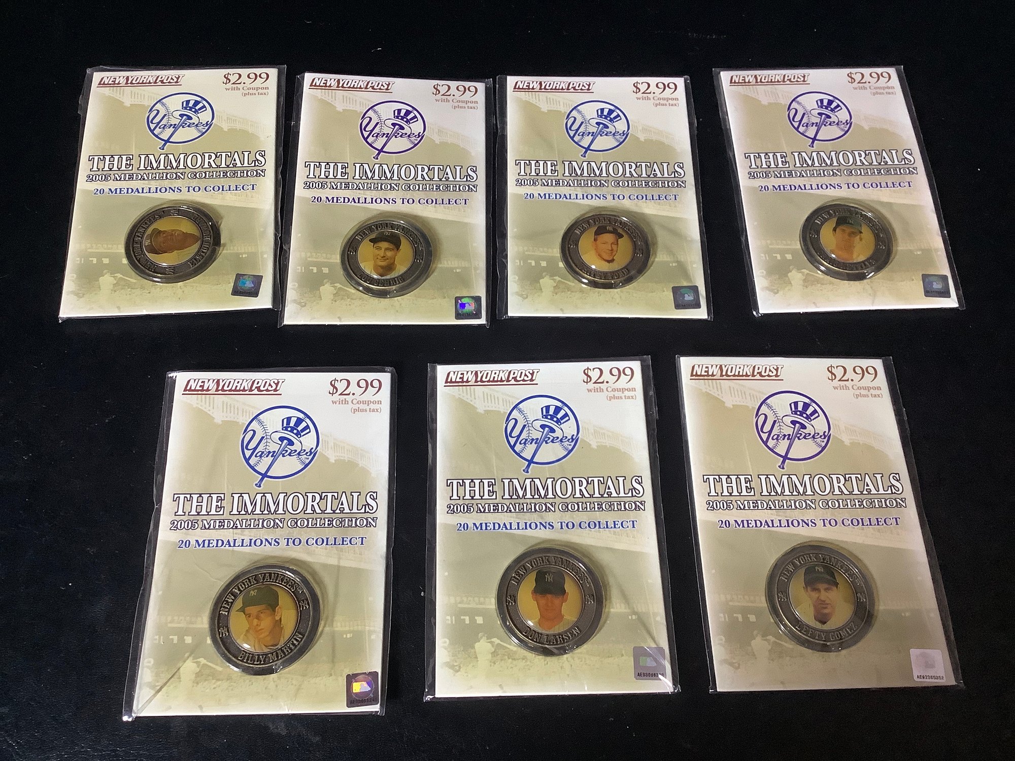 Groups of 7 Yankees “ The Immortals” 2005 medallion collection. promotion by the NY Post. In sealed packages. Includes players like Lefty Gomez, White Ford, Lou Gehrig, Billy Martin and more. Photos part of the description.