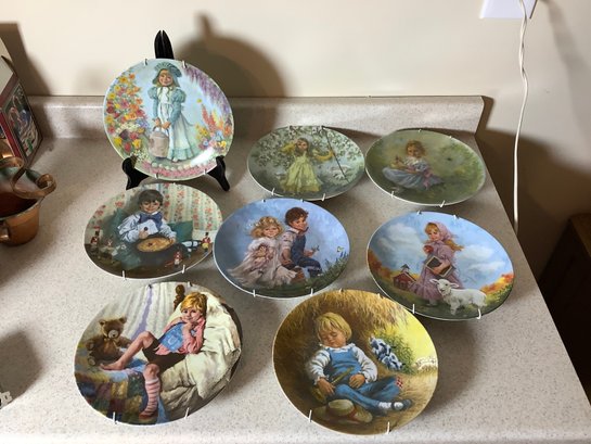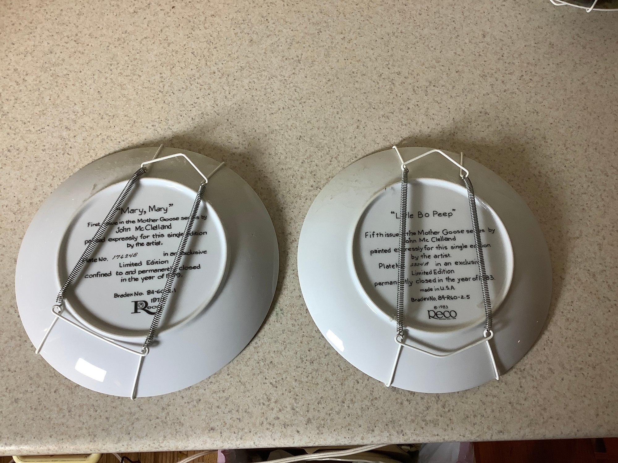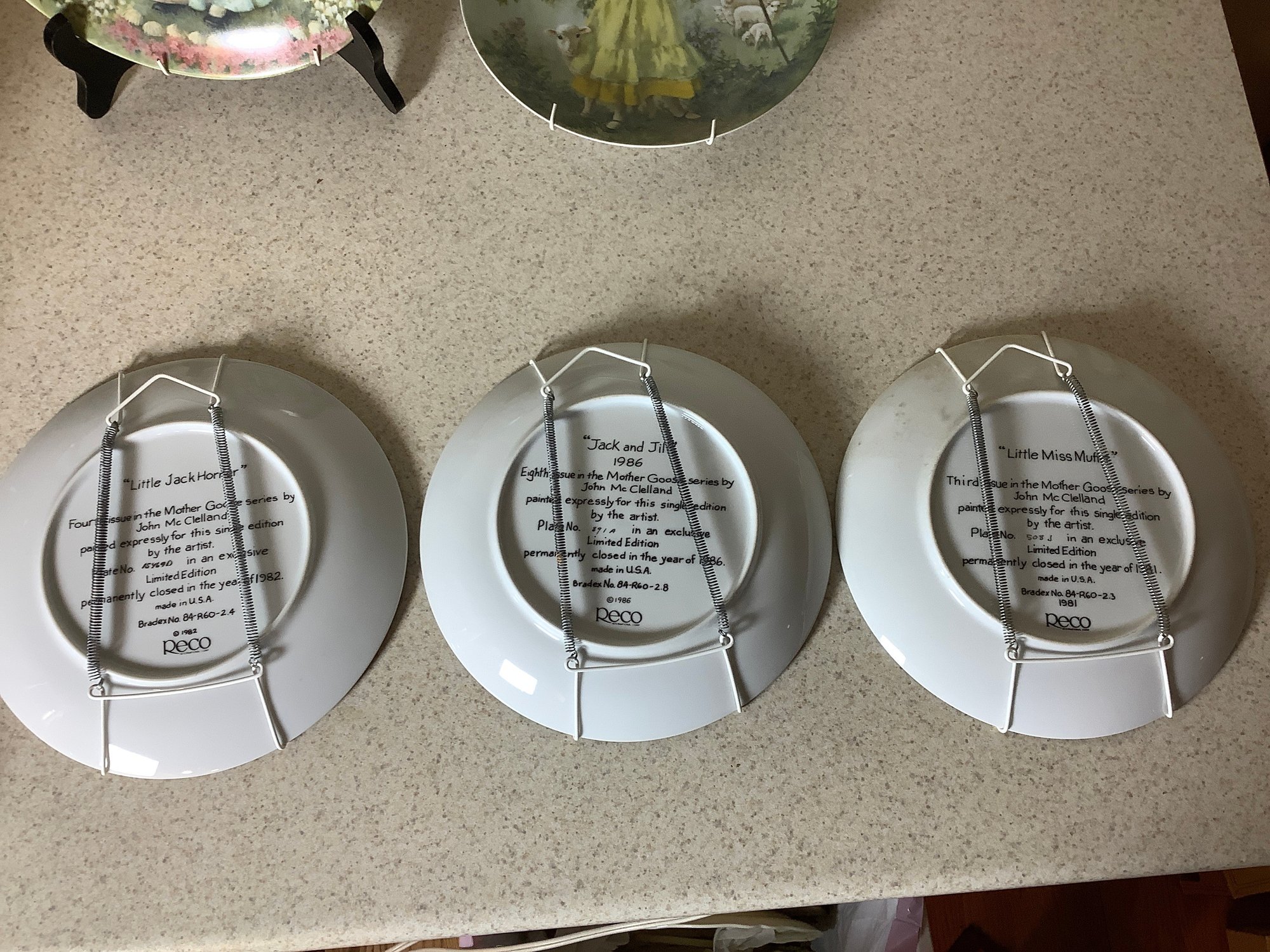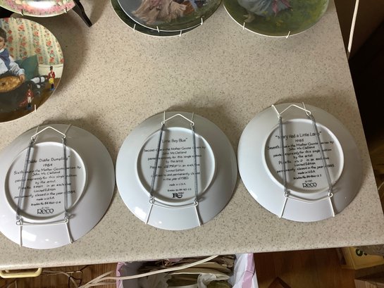 8 Mother Goose 8-1/2” Reco plates. Includes Little Bo Peep, Mary,Mary, Little Boy Blue, Little Miss Muffet and more. Comes with wall hangers. Photos are part of the description . Preowned. NO SHIPPING.