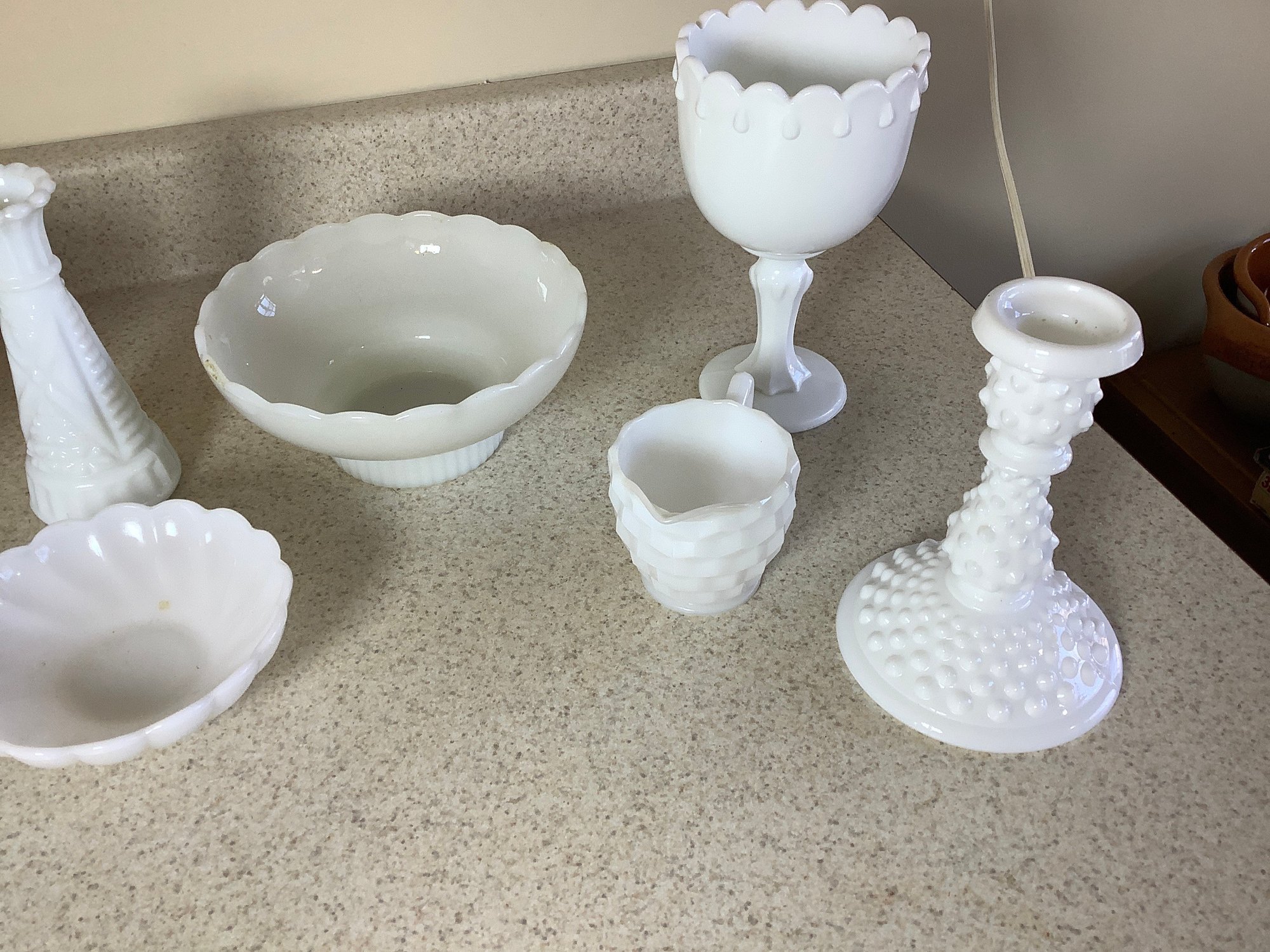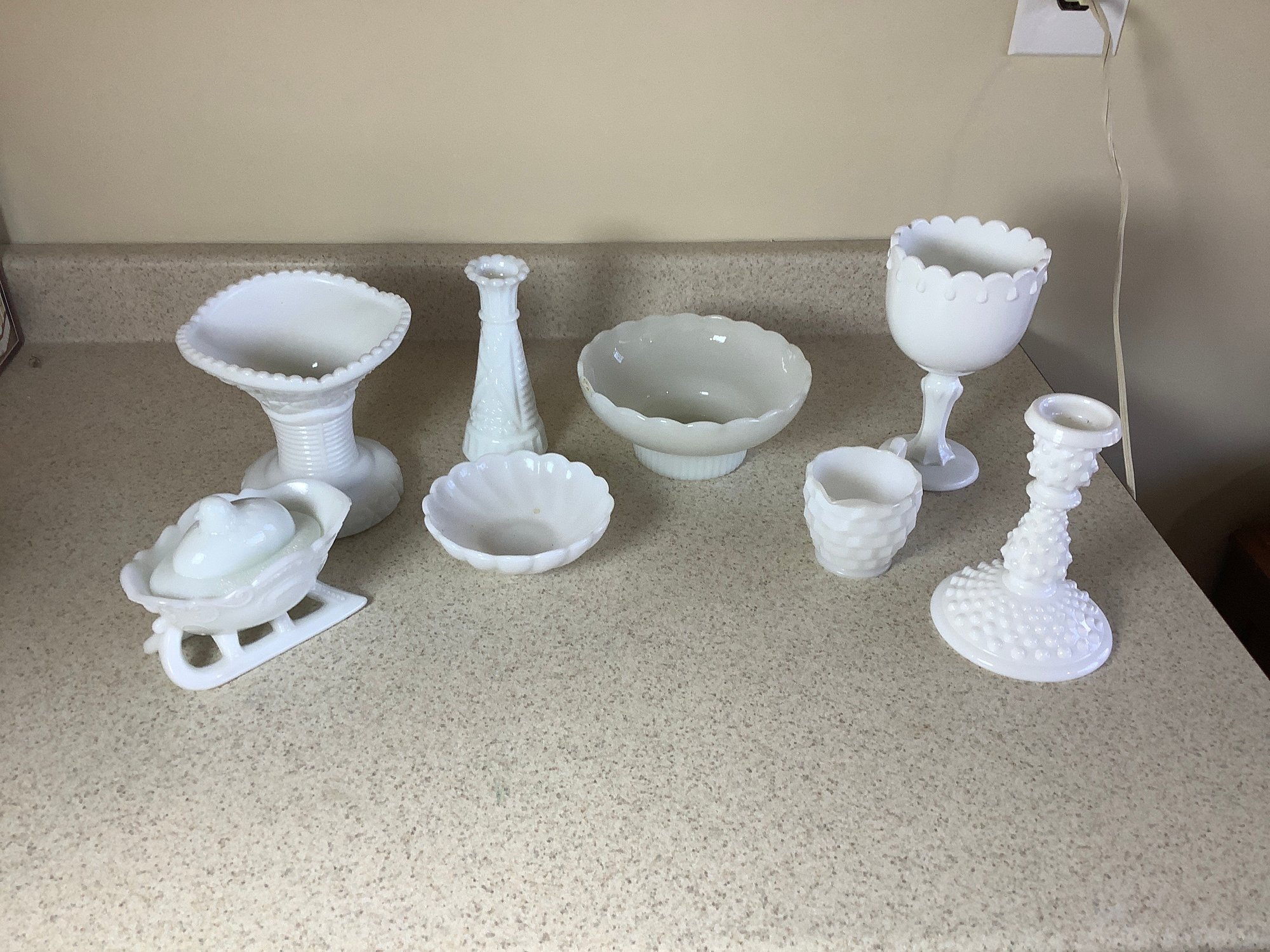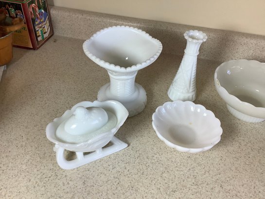 8 pieces of white milk glass. Includes West Moreland candle stick, Brody dish, bud vase , creamer and more. Photos are part off the description . Preowned. NO SHIPPING.