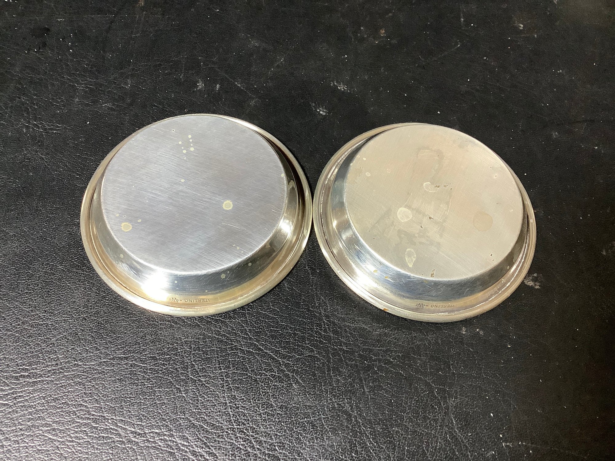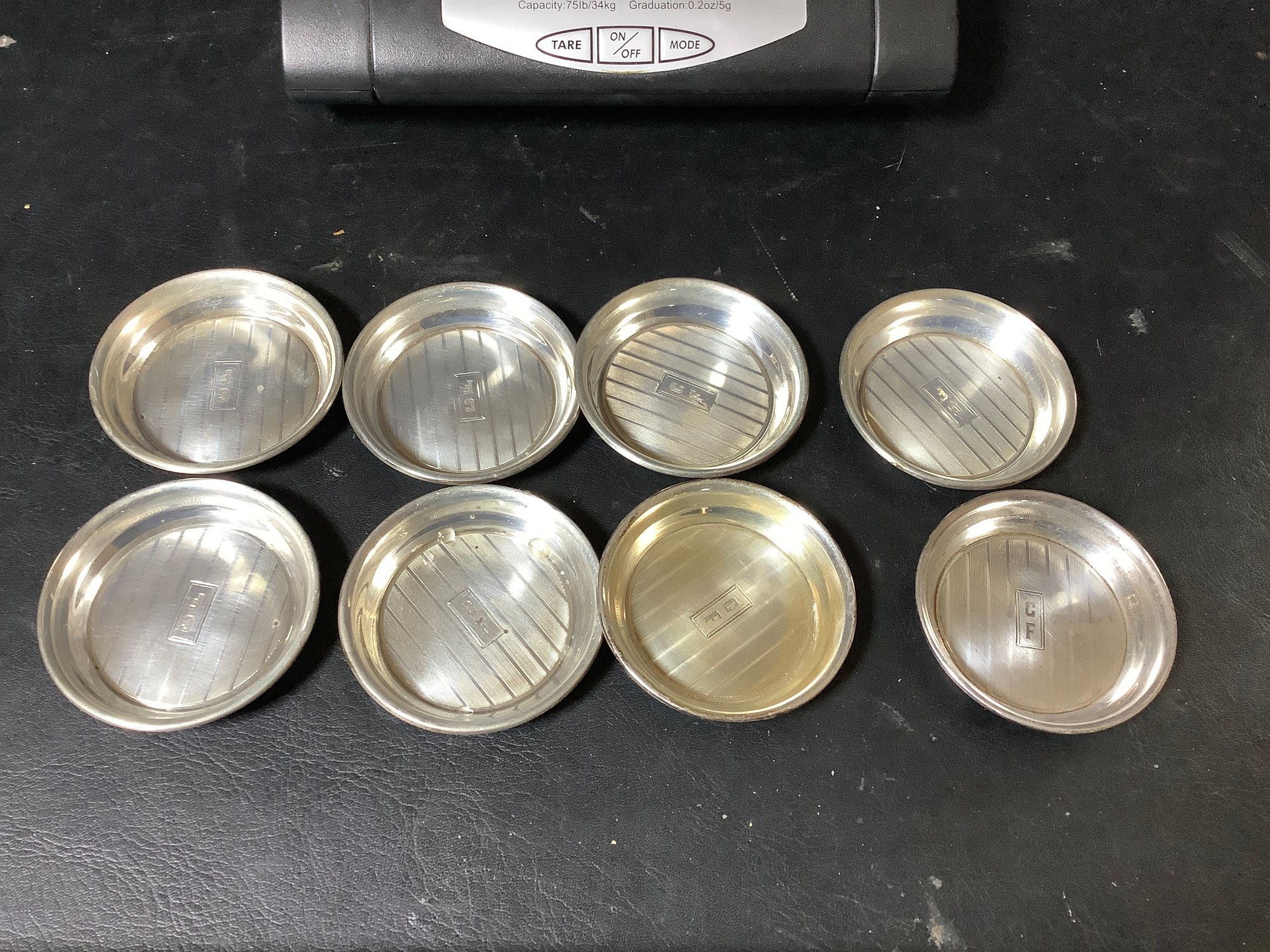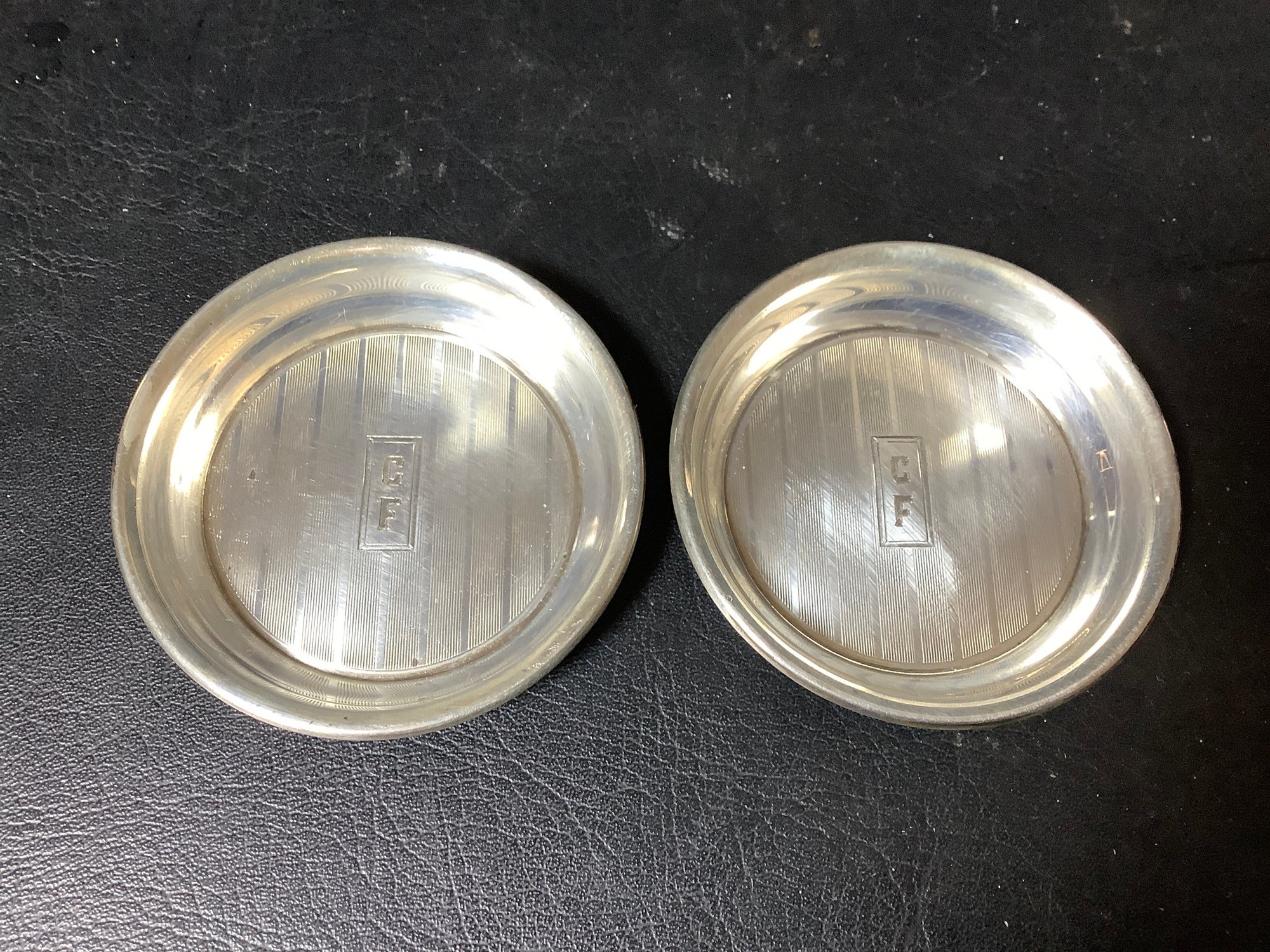 8 sterling silver coasters. Total weight approximately 4.6 ounces. Marked with a W. 2-1/2” diameter. Has monogram CF. Photos are part of the description. Preowned.