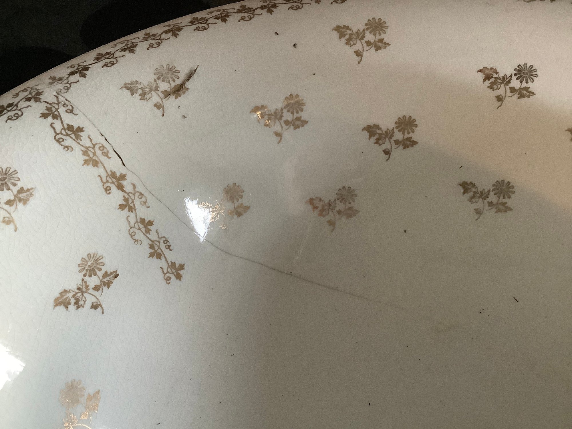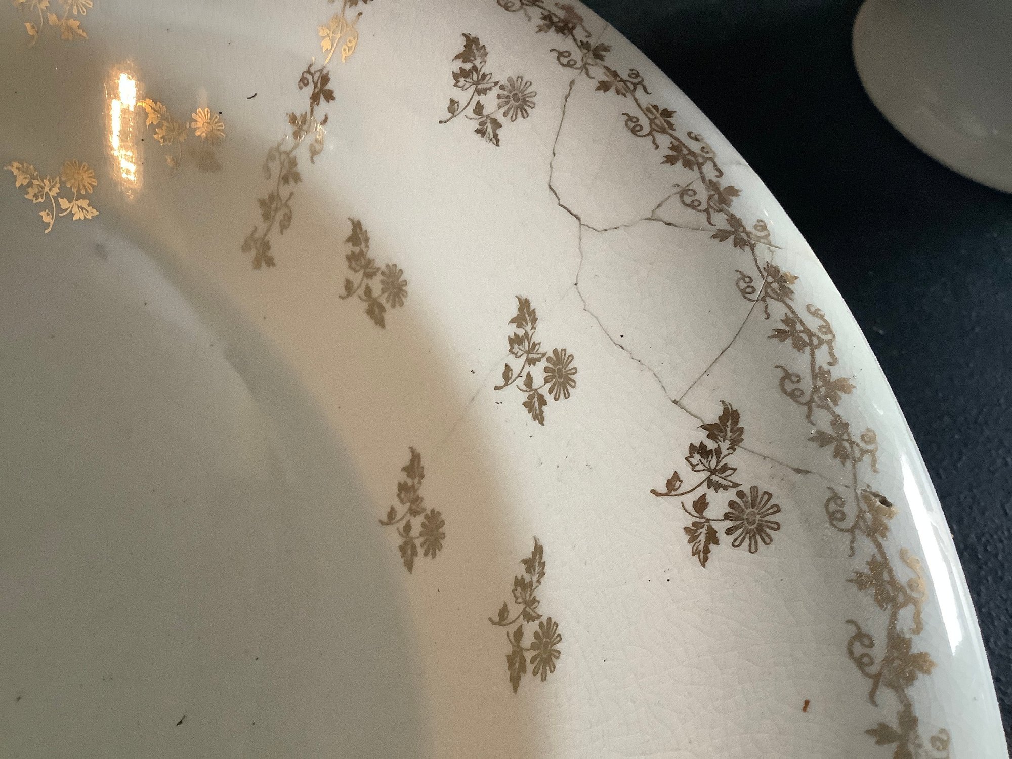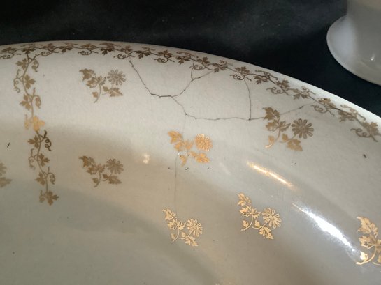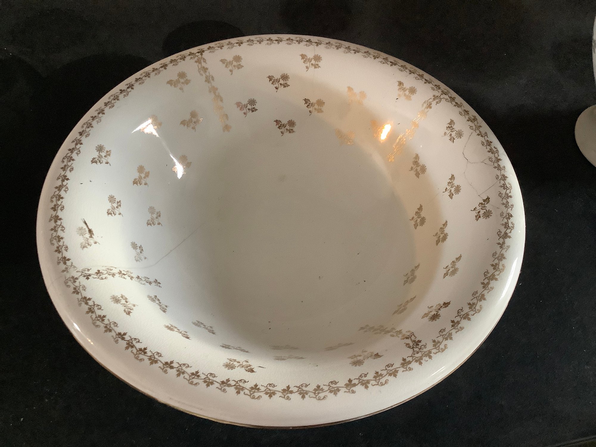 This is an antique with a white background and gold flowers surrounded by gold vines. This is a beautiful piece. It is very attractive surround by gold accents on the handles and rims along with a base that offers gold vines completely around its rim.