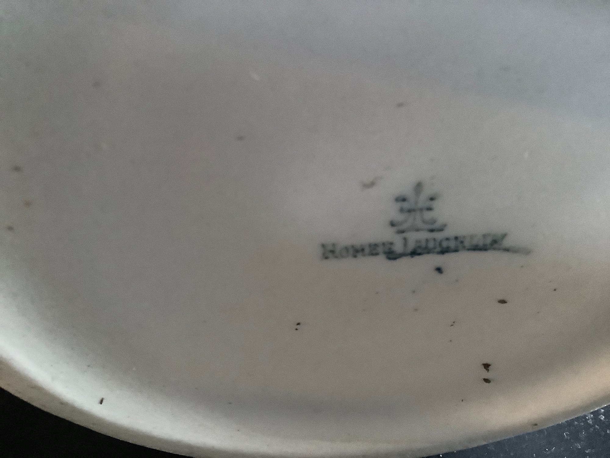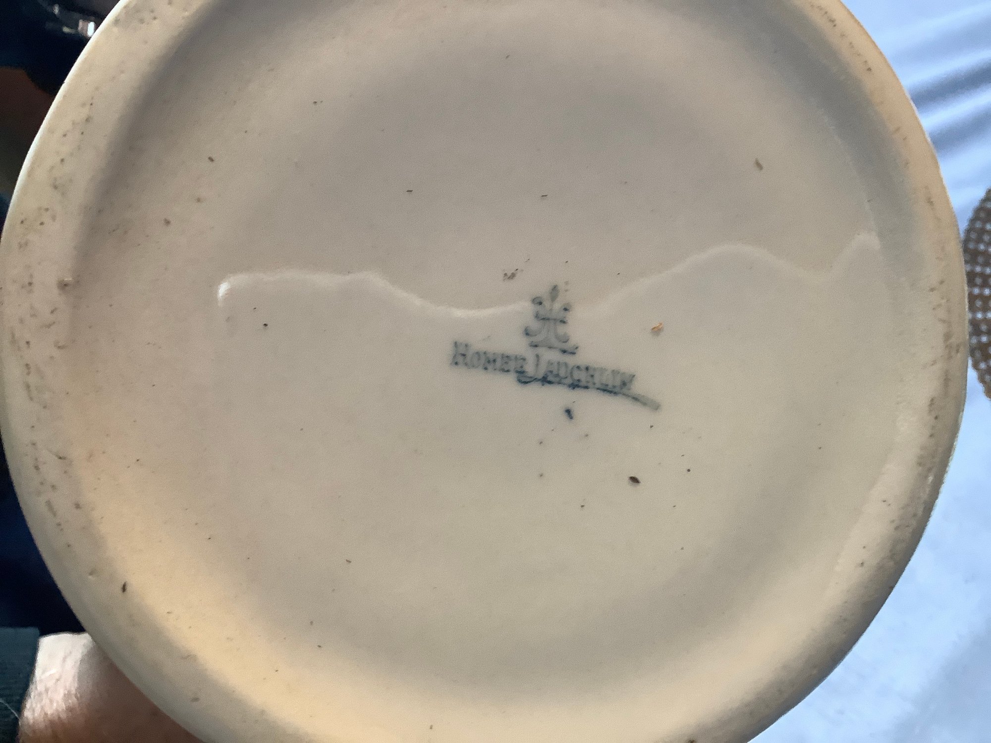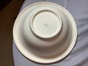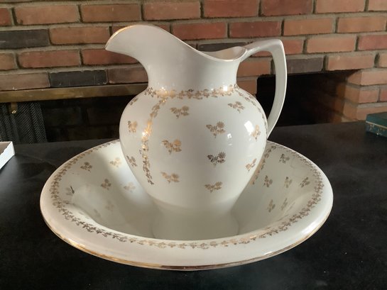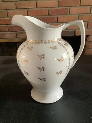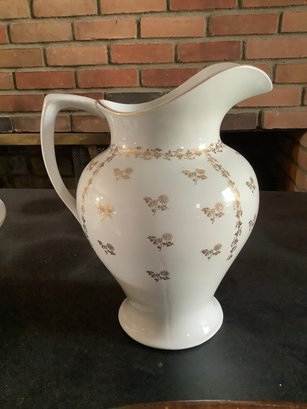 This is an antique with a white background and gold flowers surrounded by gold vines. This is a beautiful piece. It is very attractive surround by gold accents on the handles and rims along with a base that offers gold vines completely around its rim.