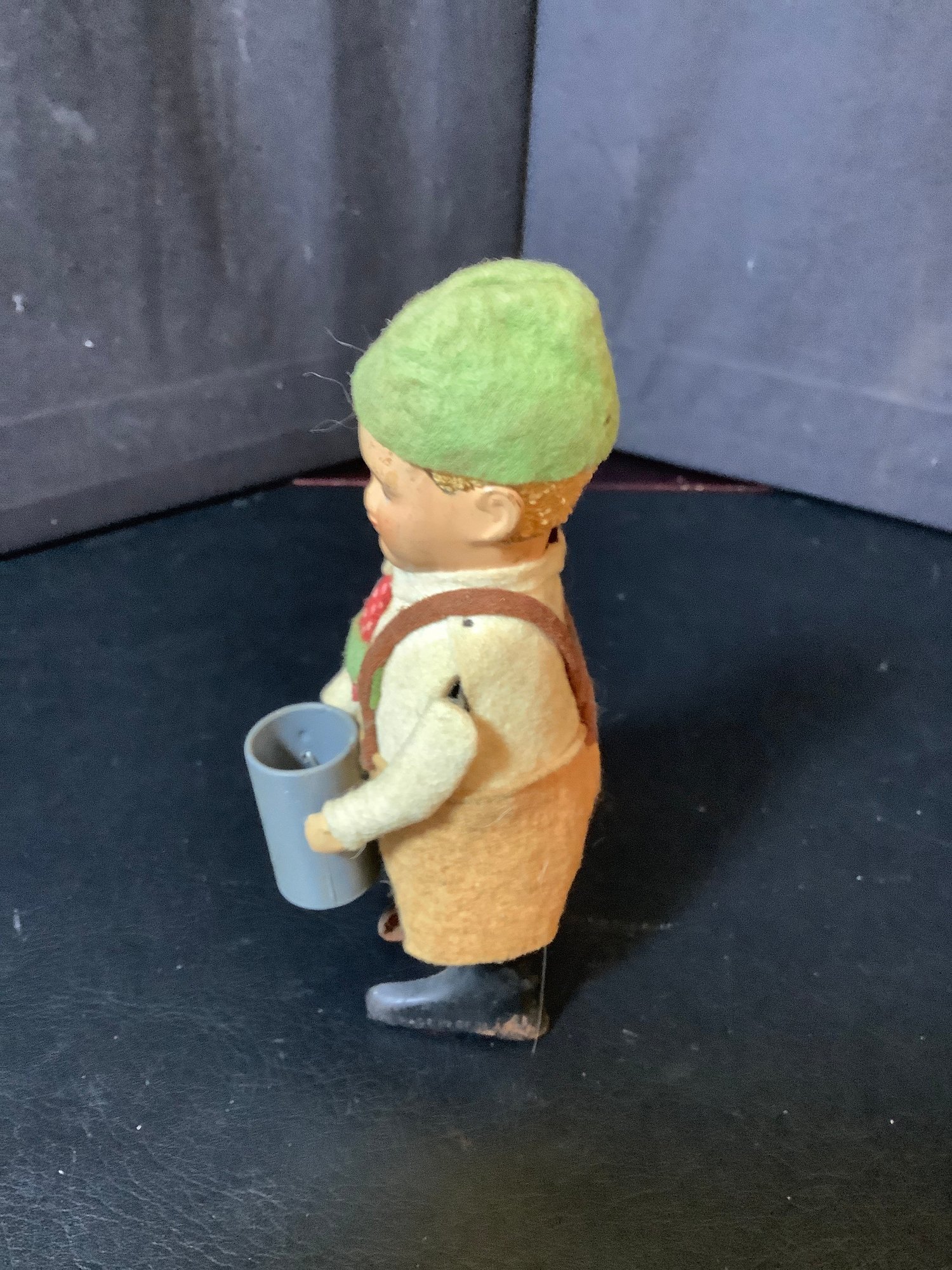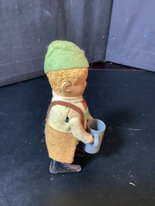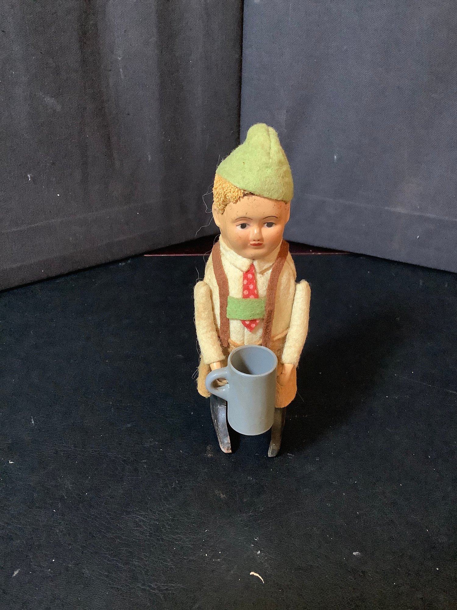 Antique Schuco windup toy boy with mug. No key, untested. Stands 5” tall. Felt clothing. Photos are part of the description.