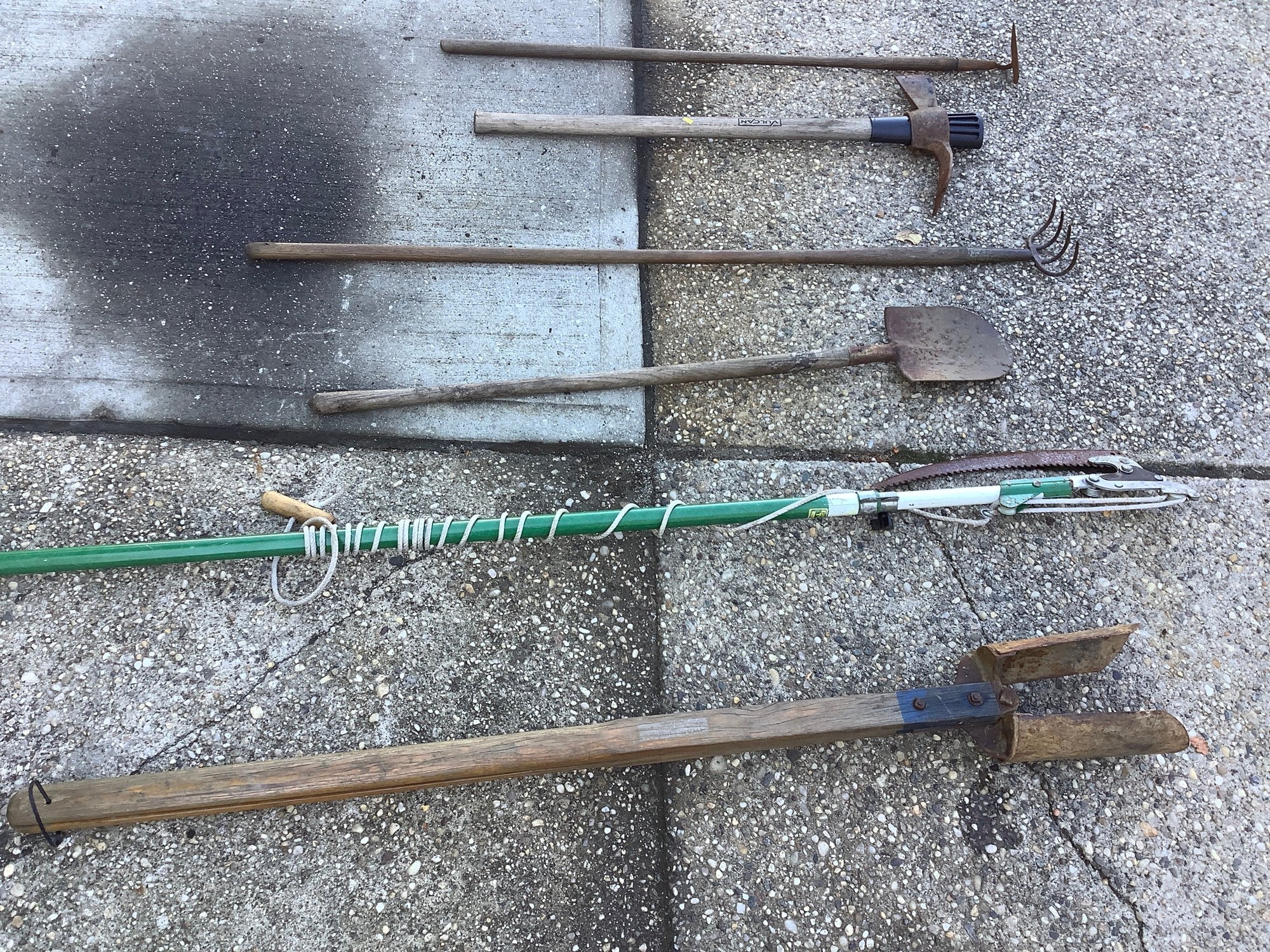 Pole saw, shovel, cultivator, hoe, pick, post hole digger.