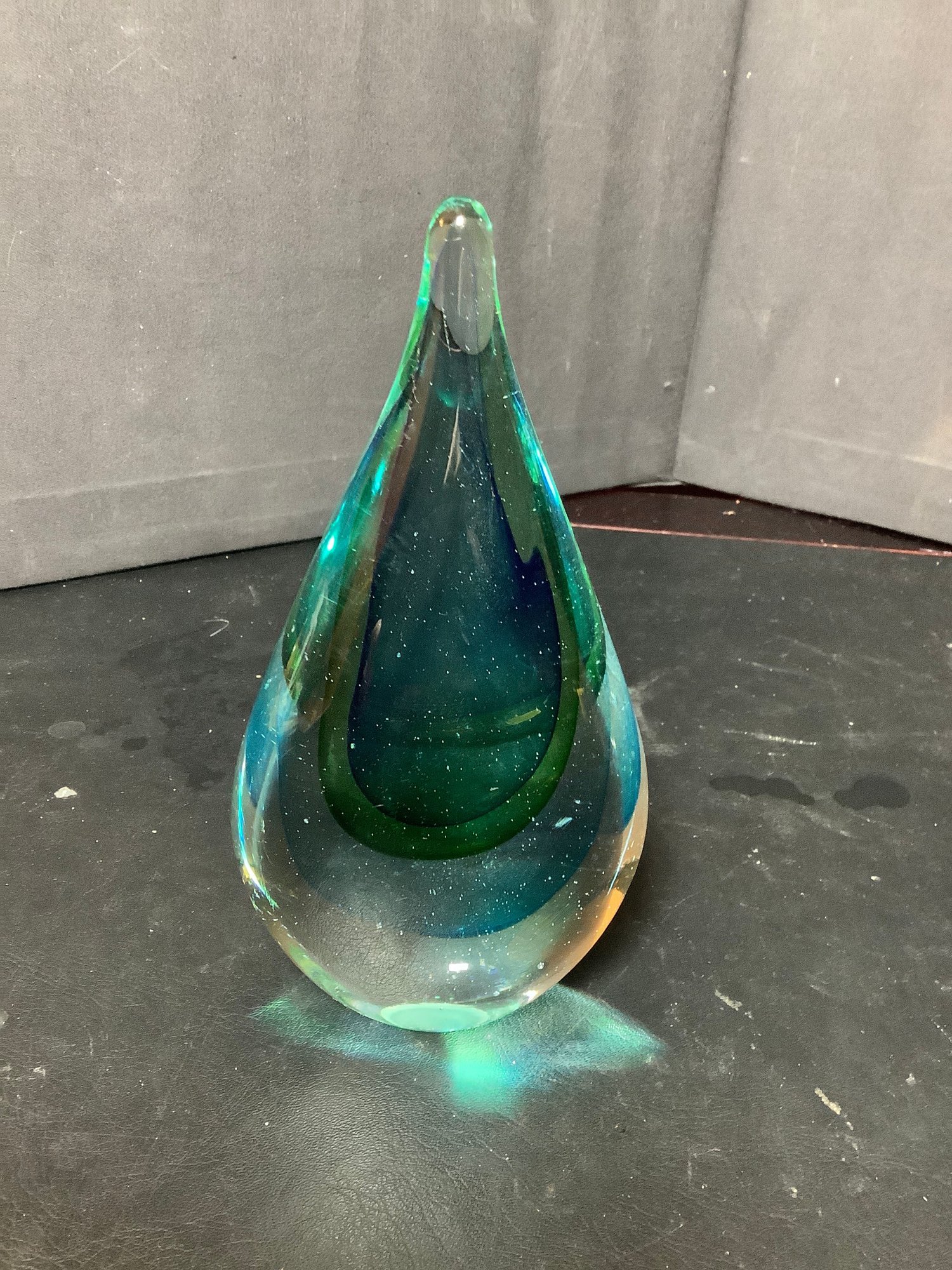 2 pieces art glass. The vase is 10” tall and the tear drop is 7-1/2” tall. Photos are part of the description.. Pre-owned. NO SHIPPING!!