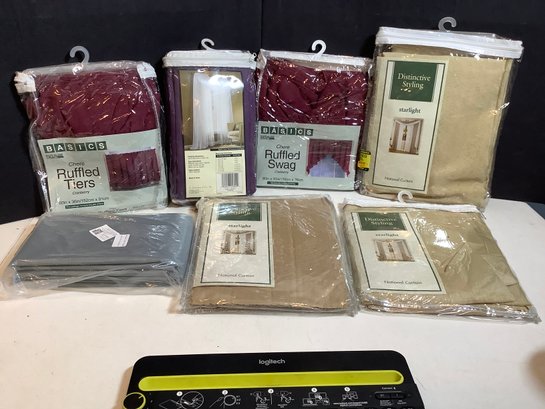 Assorted curtains and bench cover. Includes 3 star lite panels, Cranberry Ruffled tier and swag, purple scarf and bench cover. All in plastic packages. Photos are part of the description.