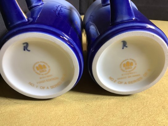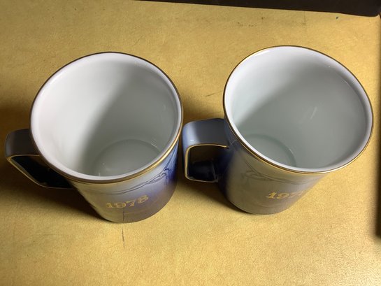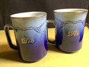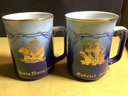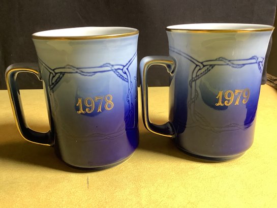 Gorgeous Cobalt Blue Tall Handled Mugs with Gold rums and gold accents on the handles.