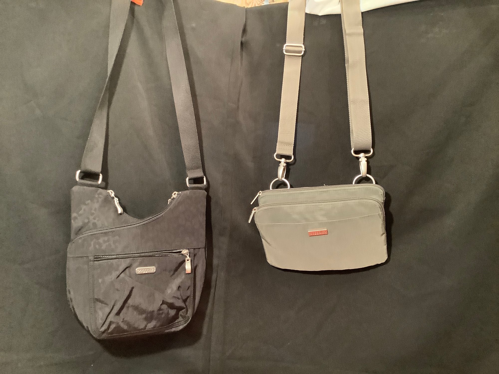 1.) Gray bag with lots of zippered compartments making it easy to get to what you need. Nice long adjustable straps.