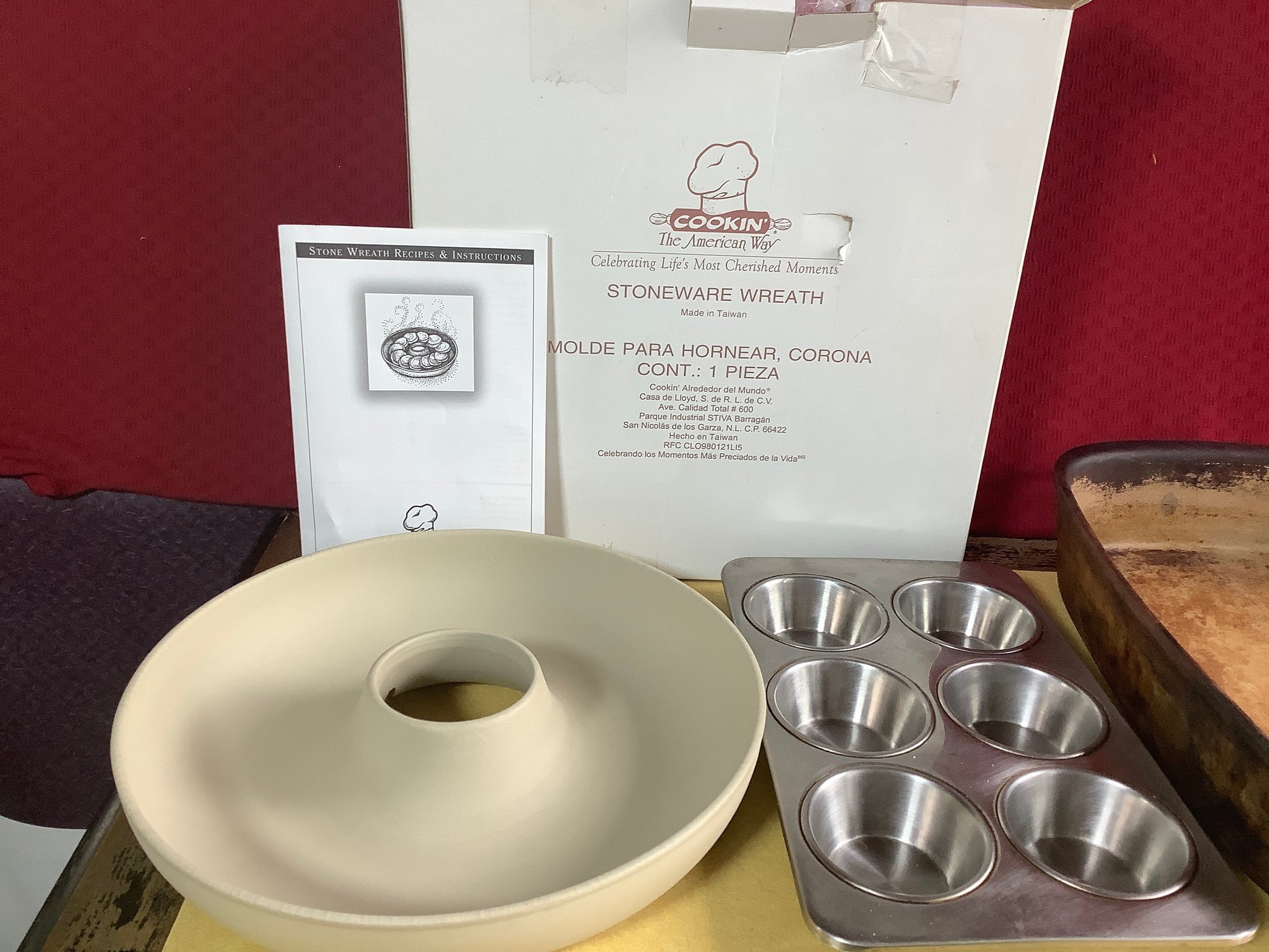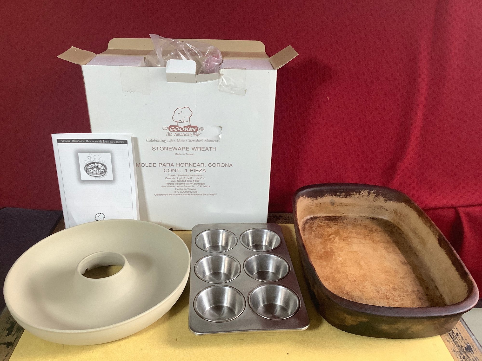 3 pieces baking ware. Includes new Stoneware Wreath, 6 cup muffin pan and Pampered chef casserole pan 14” x 9-1/2”. Photos are part of the description. NO SHIPPING