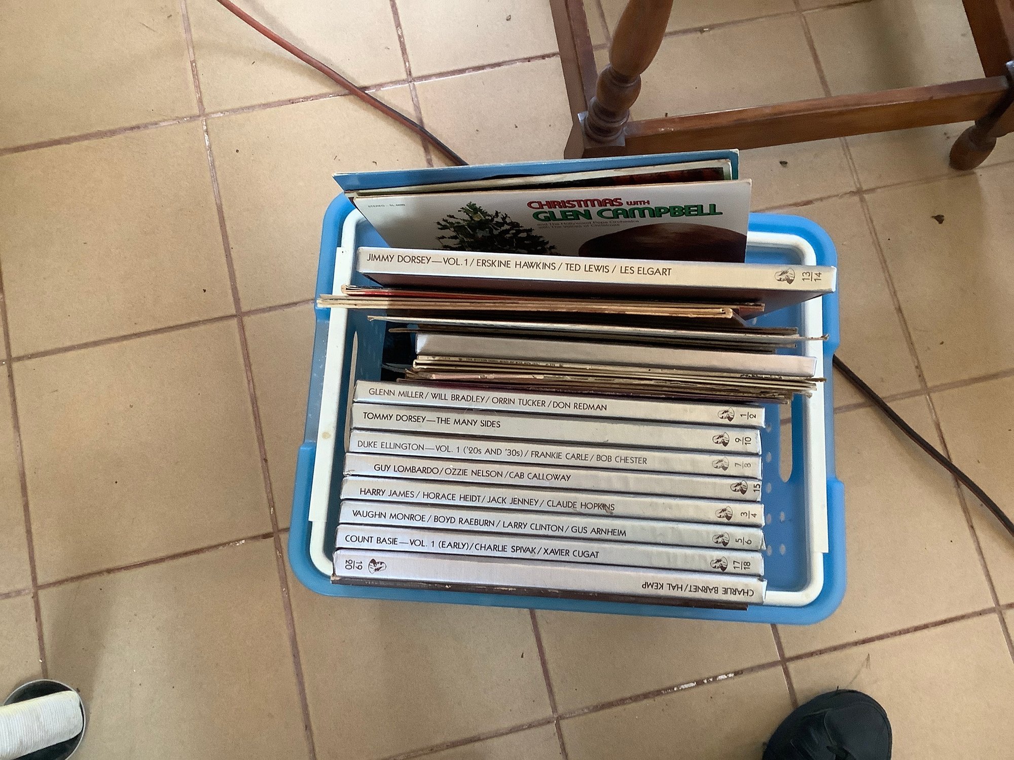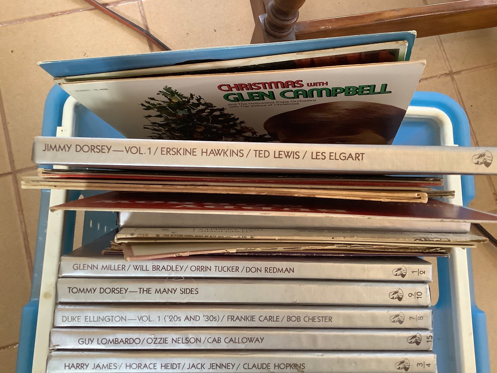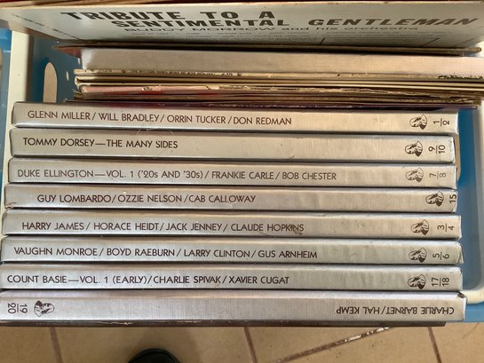 Basket of records. Includes artist Ted Lewis, Jack Jenny, Guy Lombardo, Willie Nelson, Glen Cambell and more. Photos are part of the description. Preowned. NO SHIPPING.