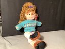 She is dressed in a turoquoise sweater with off white corduroy slacks and shoes.