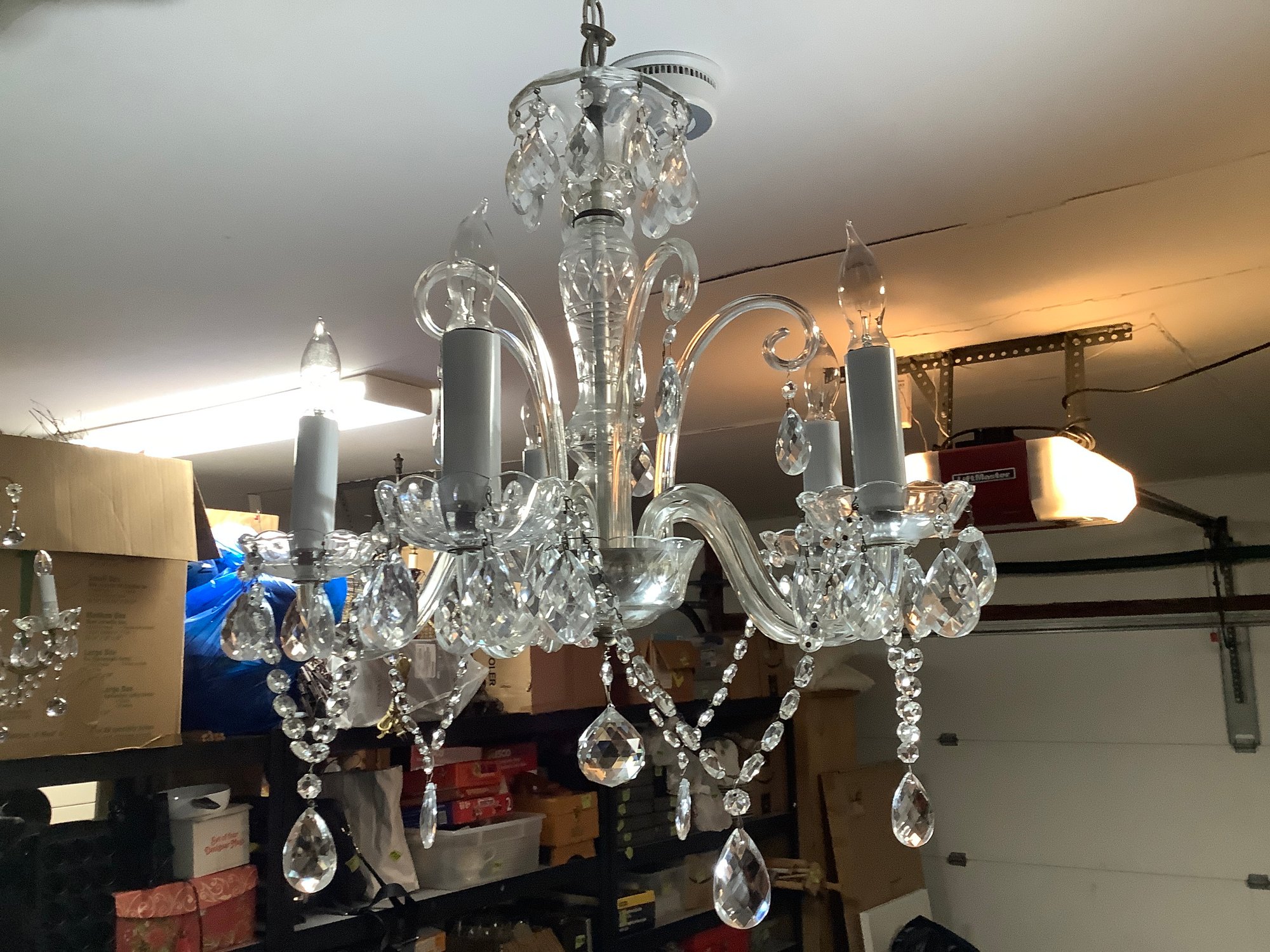 Crystals are strung along each arm. In addition, there are brilliantly cut crystals hung between. The strung crystals. Each arm of the Chandlier is surrounded by matching tear drop crystals. There are well over 50 crystals on this beauty.