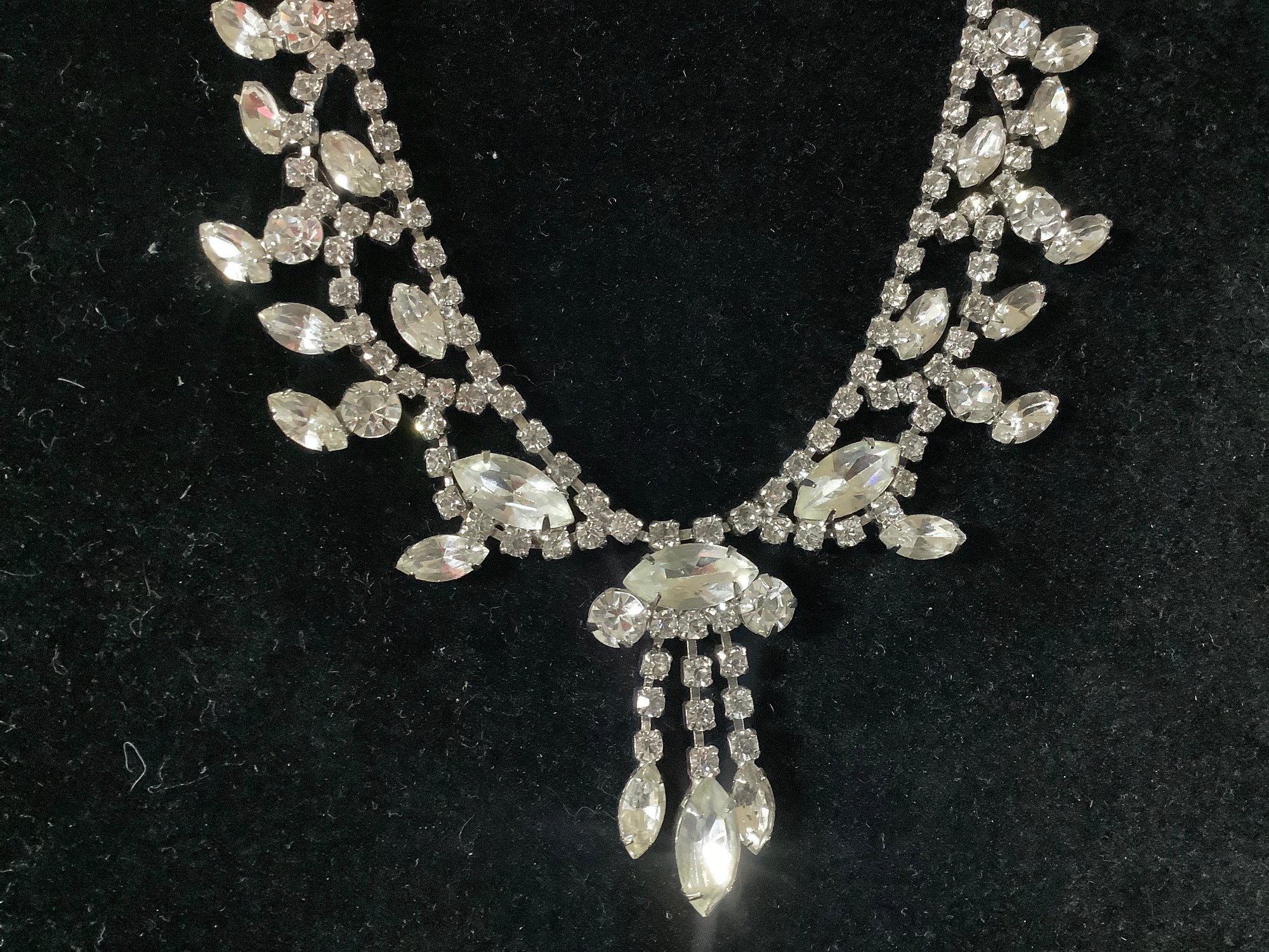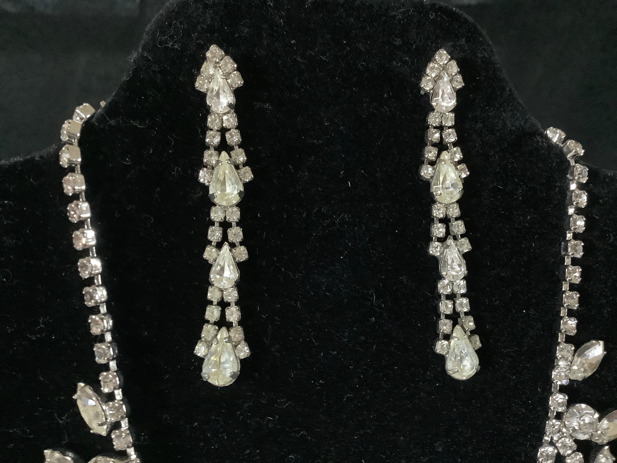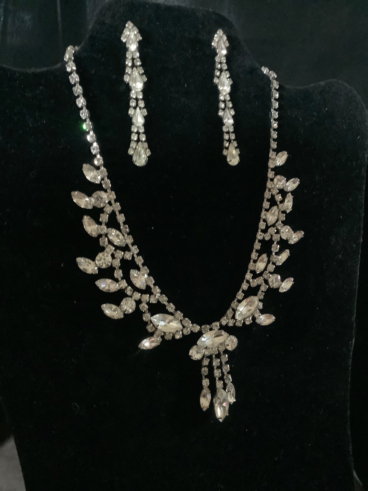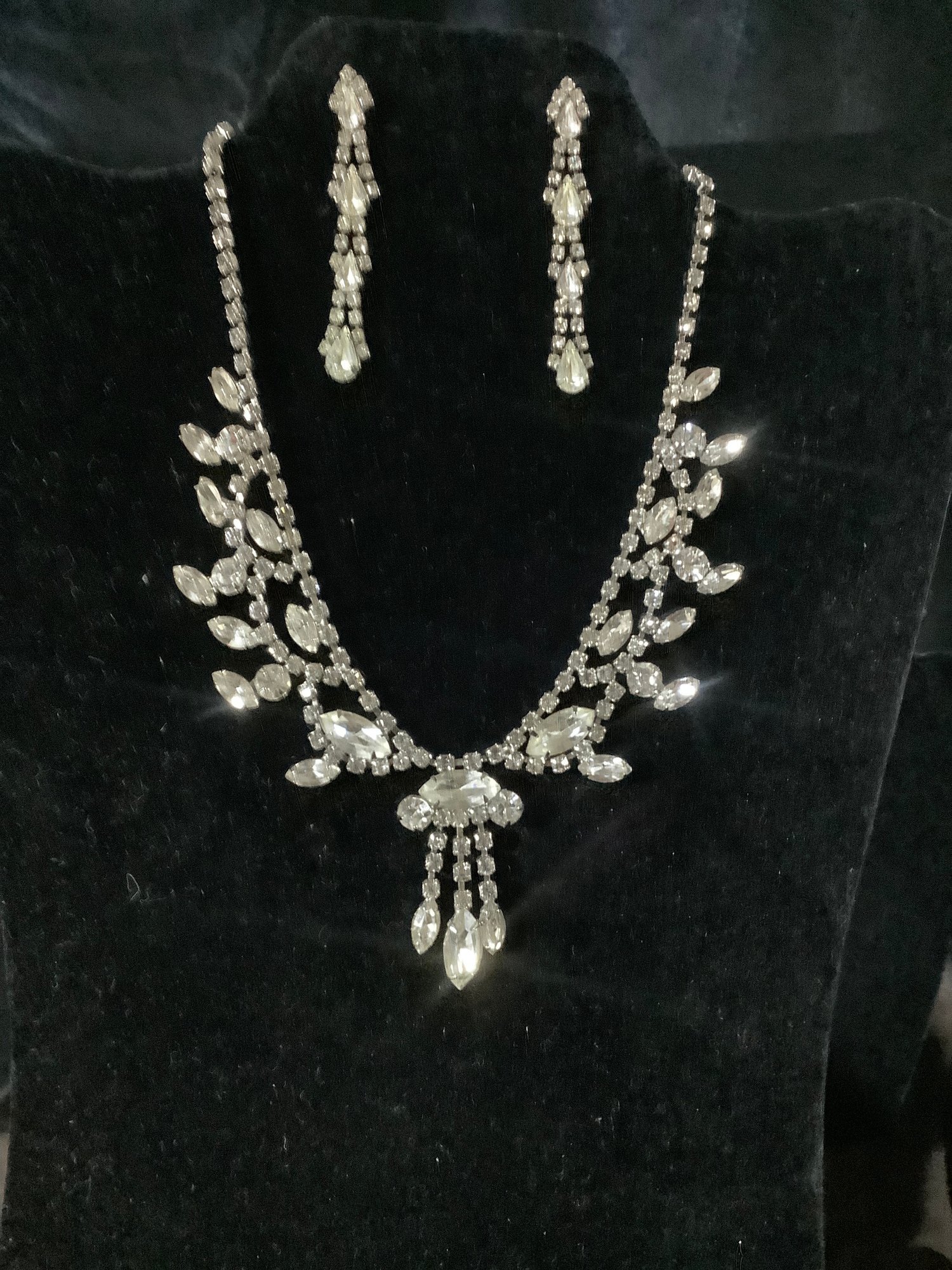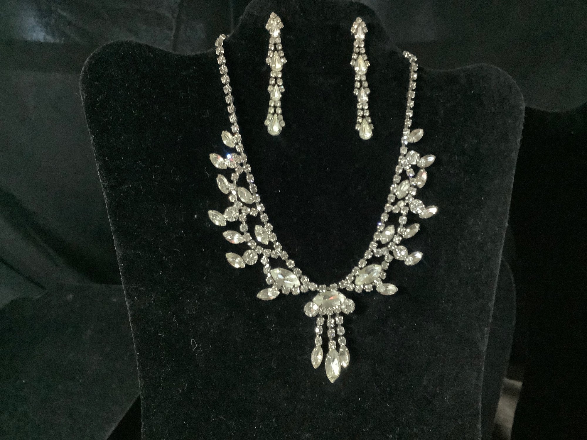 This is a very glitzy necklace. It offers large faux crystals that extend beyond the main necklace. Some are brilliant round shaped and others are marquis shaped. The pierced earrings complement the necklace and together you will receive complements galore.