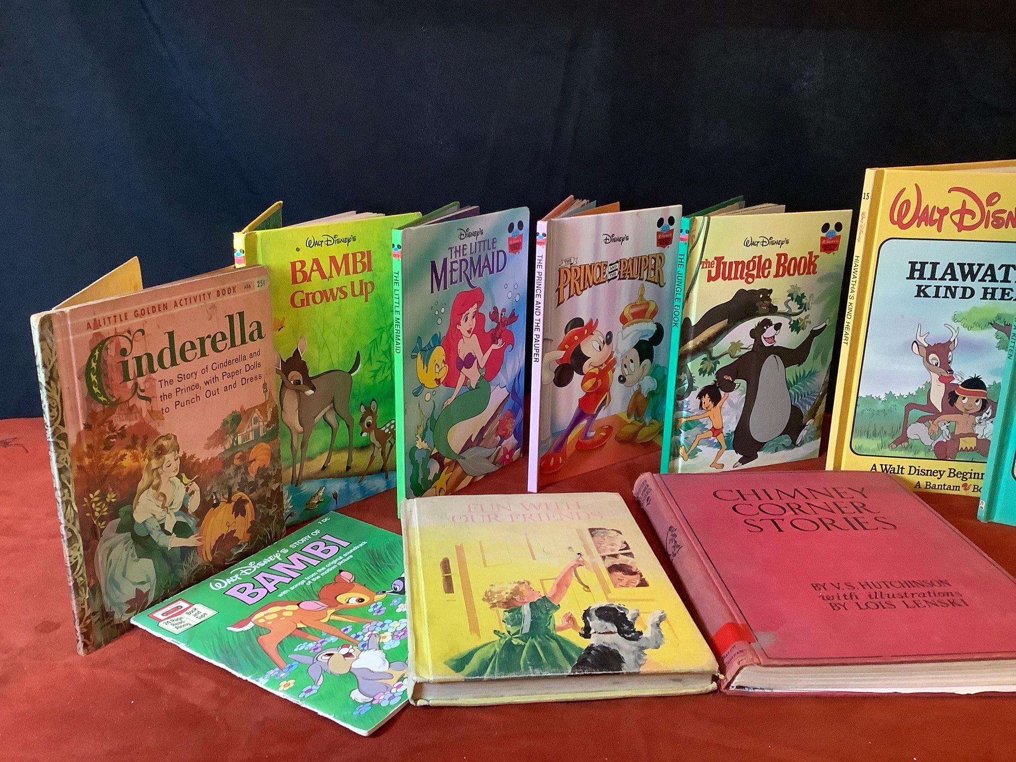 Walt Disney mickey Finds a Kitten, Hiawatha, The Jungle Book, Princess and the Pauper, The Little Mermaid, Bambi Grows Up, Cinderella, are all hard cover Books.