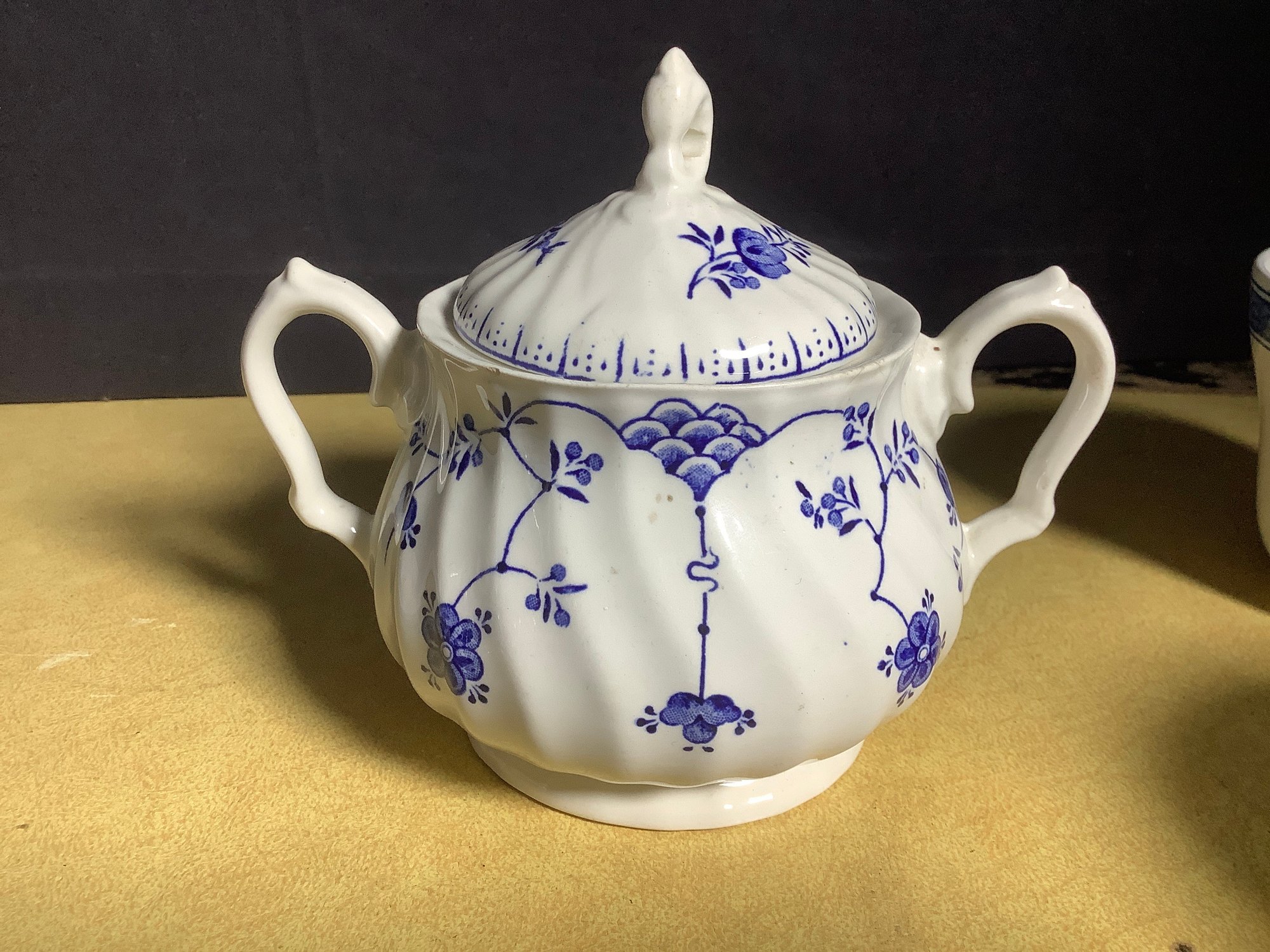 Sugar bowl is lidded and has handles on each end.