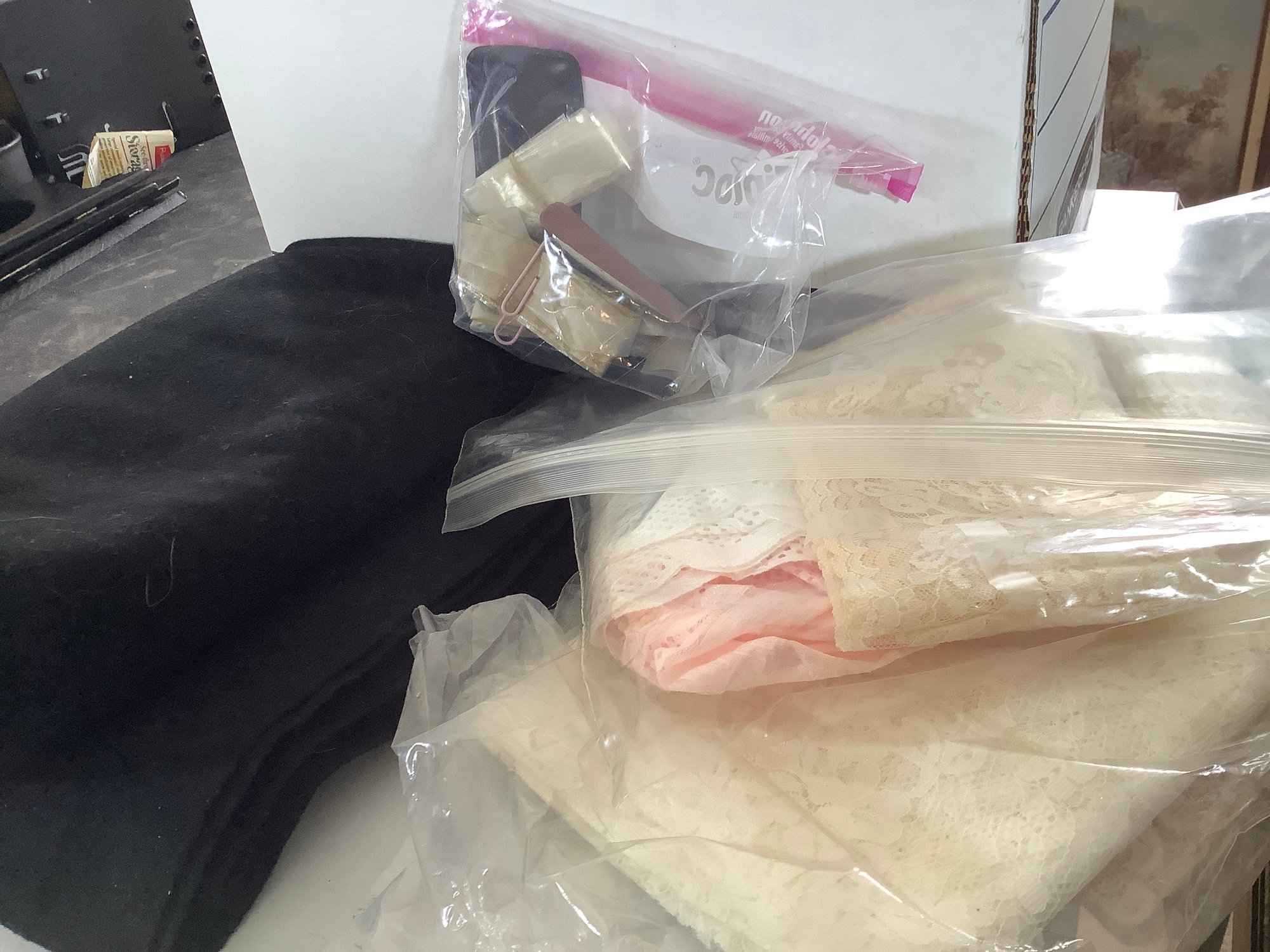 Includes, mini iron, tape measures, Marking pencils, assorted groups of lace, pin cushions, fabric, ribbon and more