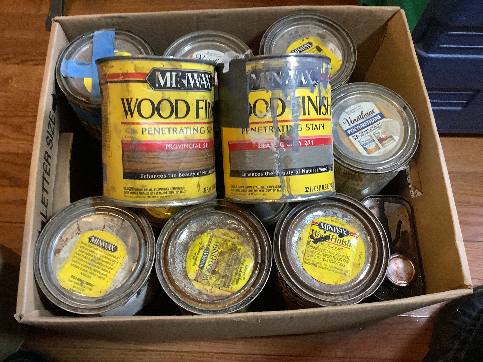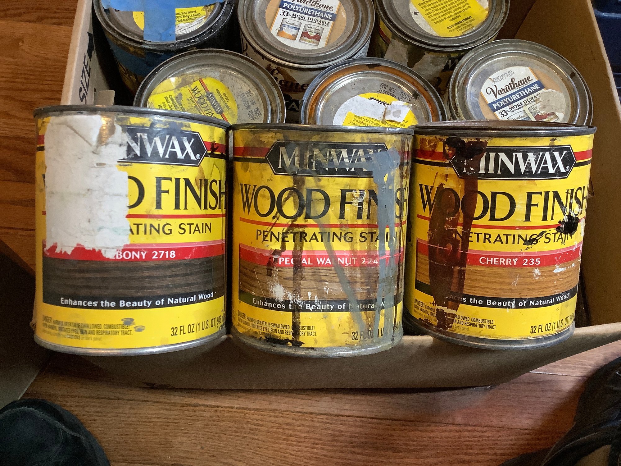 Box of wood stains. Cans are opened with various amounts in each can. 18 cans in this box. The Photos are part of the description. Preowned. Unchecked for completeness. NO SHIPPING!!!!!!