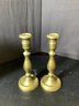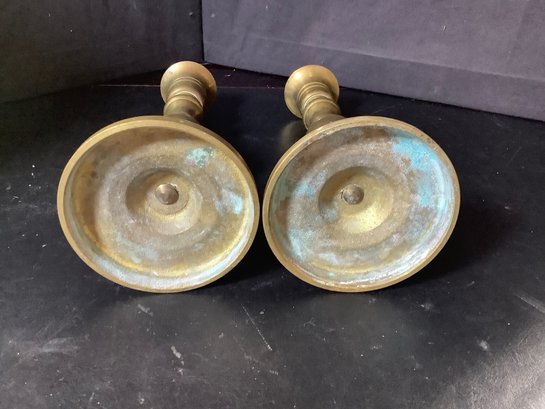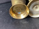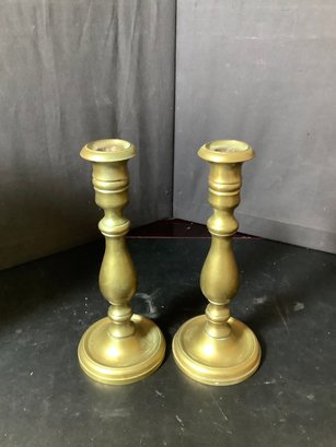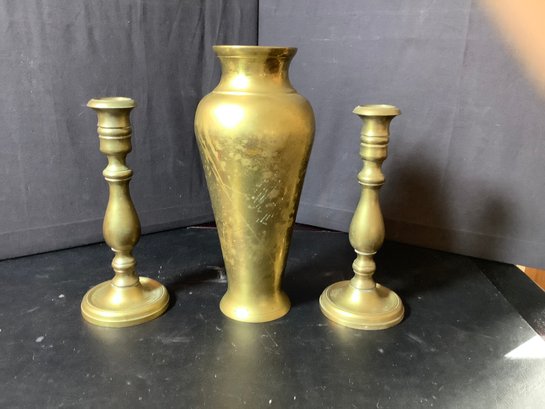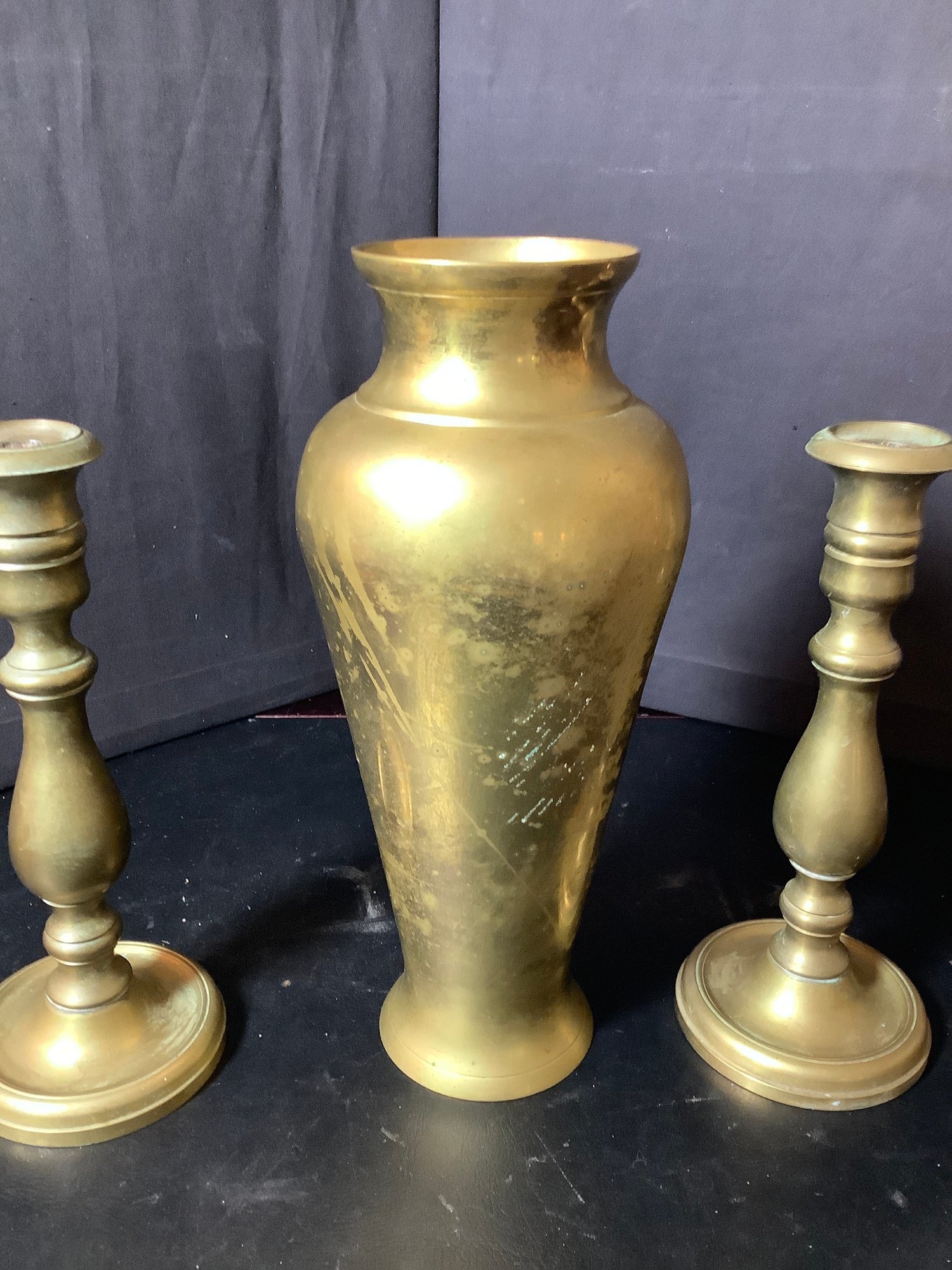 2 Heavy brass candle holders and brass vase. The candle holders are 9-1/2” tall and the vase is 12” tall. Photos are part of the description. Preowned. NO SHIPPING>