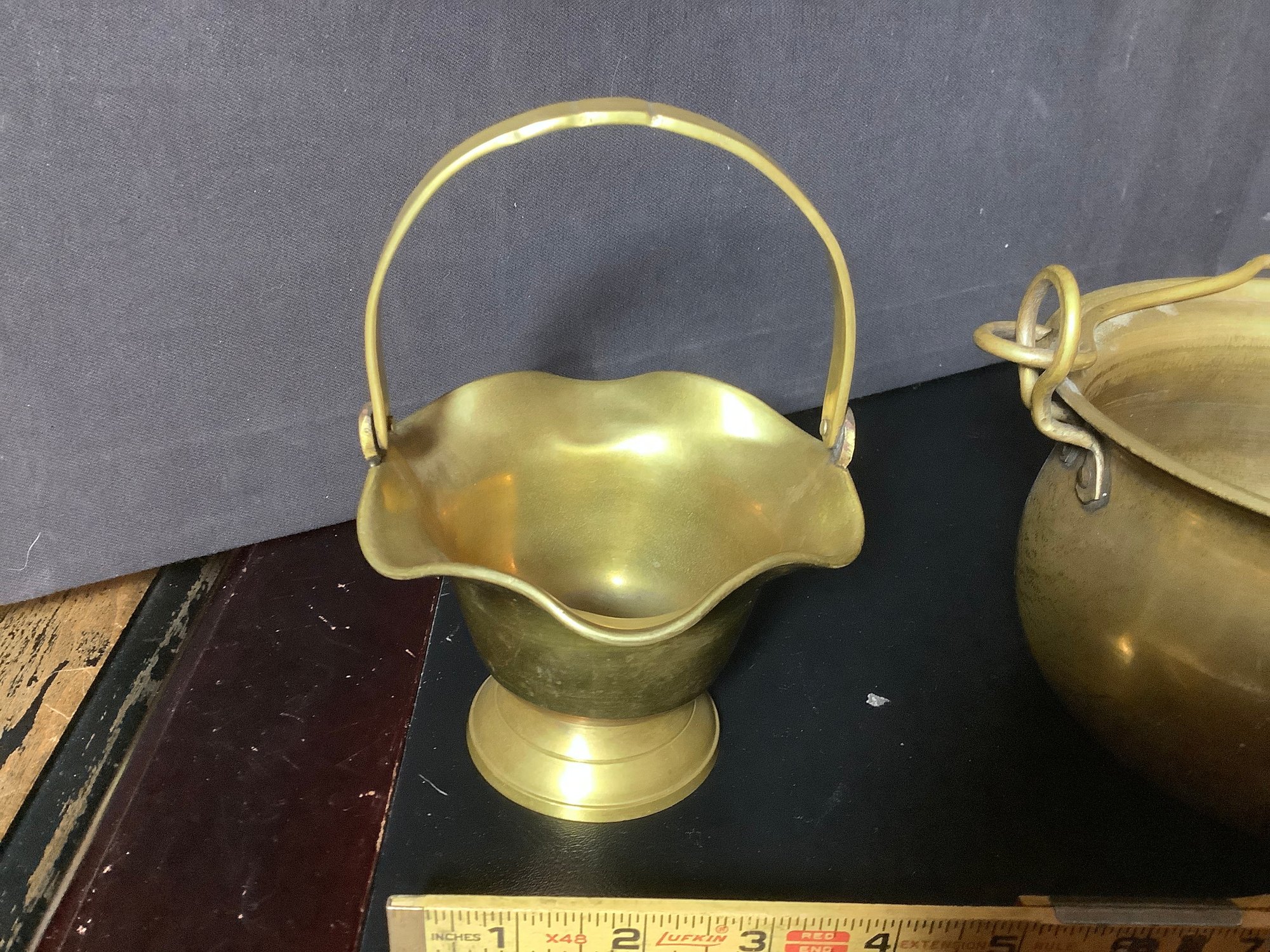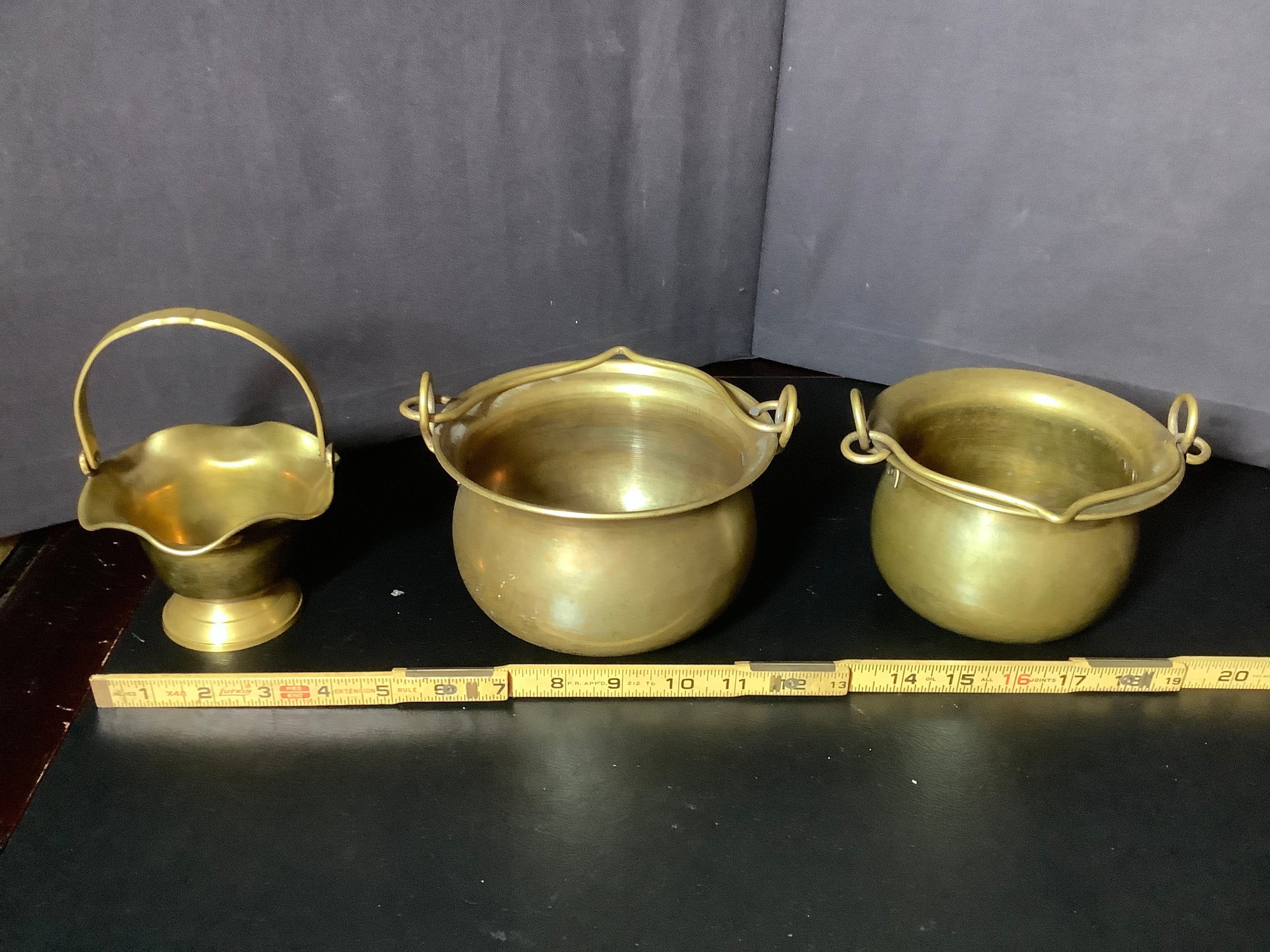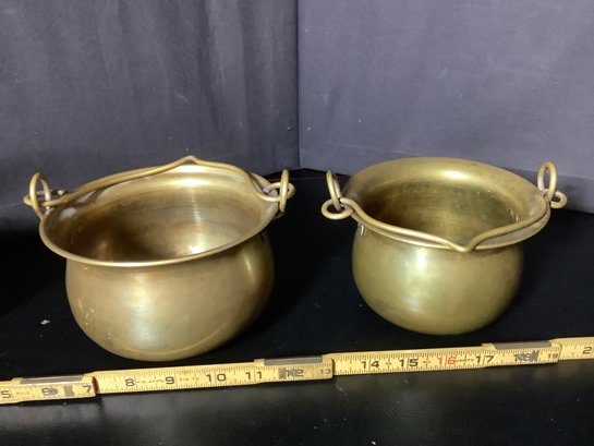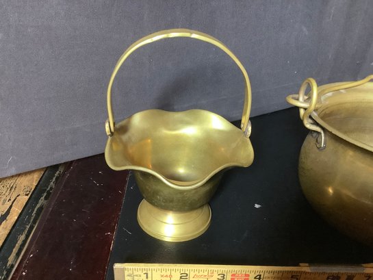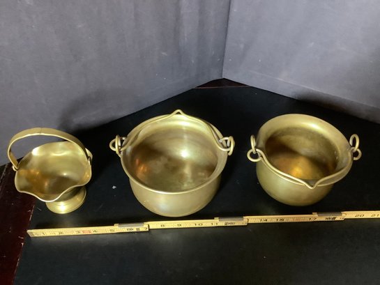 Brass Handled pots and basket. Size pots 6” x 6” x 4” tall and 5-1/2” x 5-1/2” x 4”tall and basket 4-1/2’ x4-1/2” x 3”. Great decor pieces. Photos are part of the description. Pre-owned.