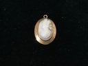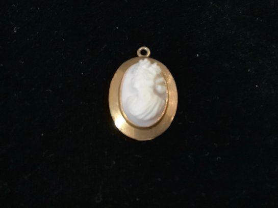 It was acid tested to be 14 kt. Surrounding a cameo in the center.