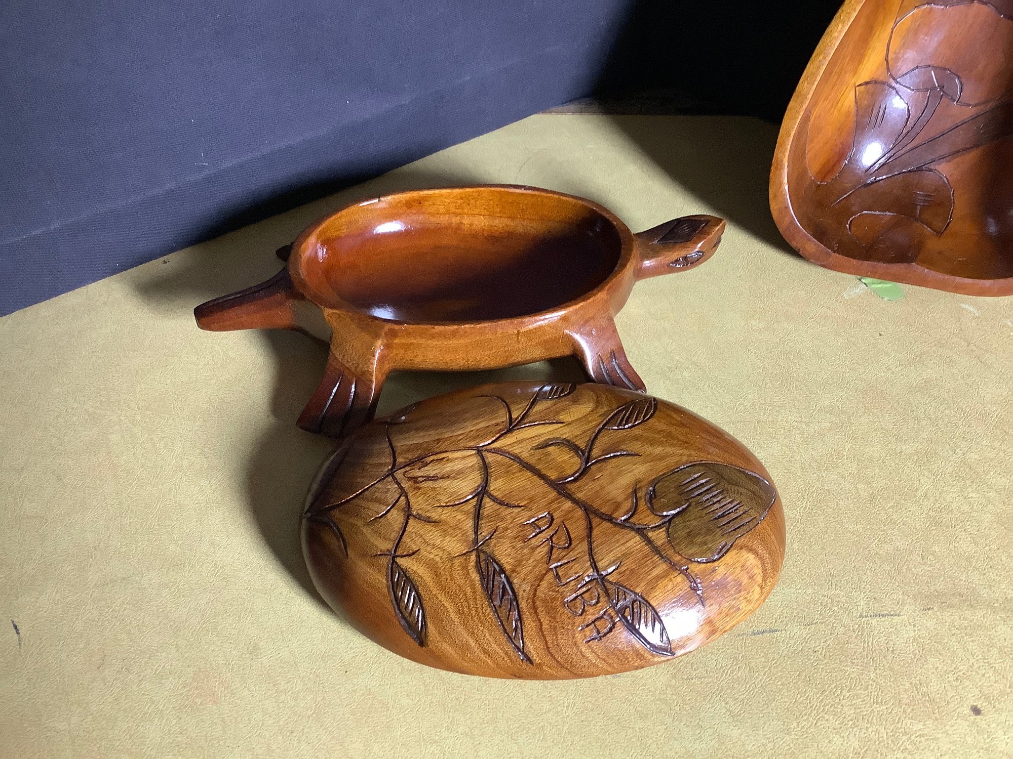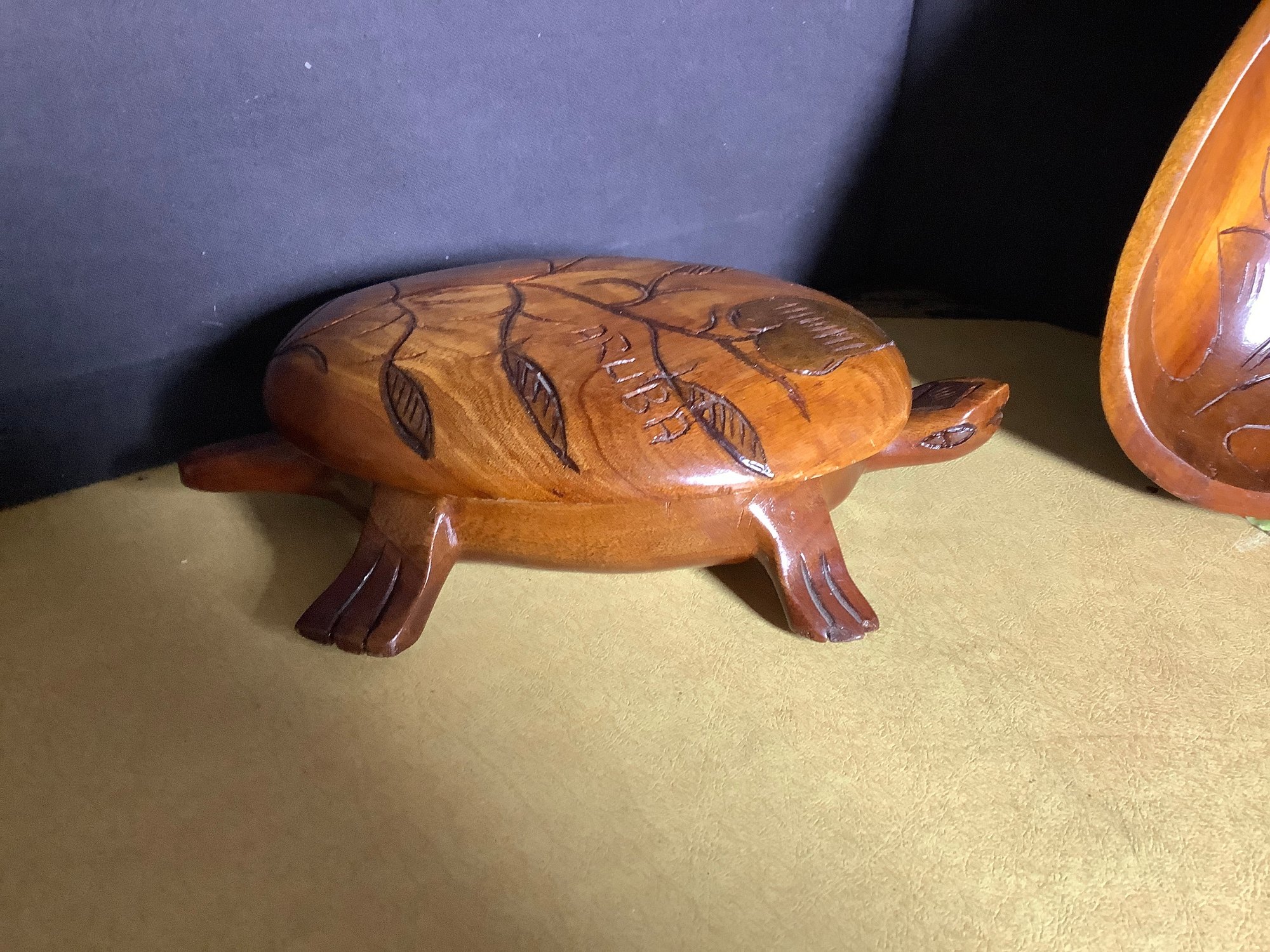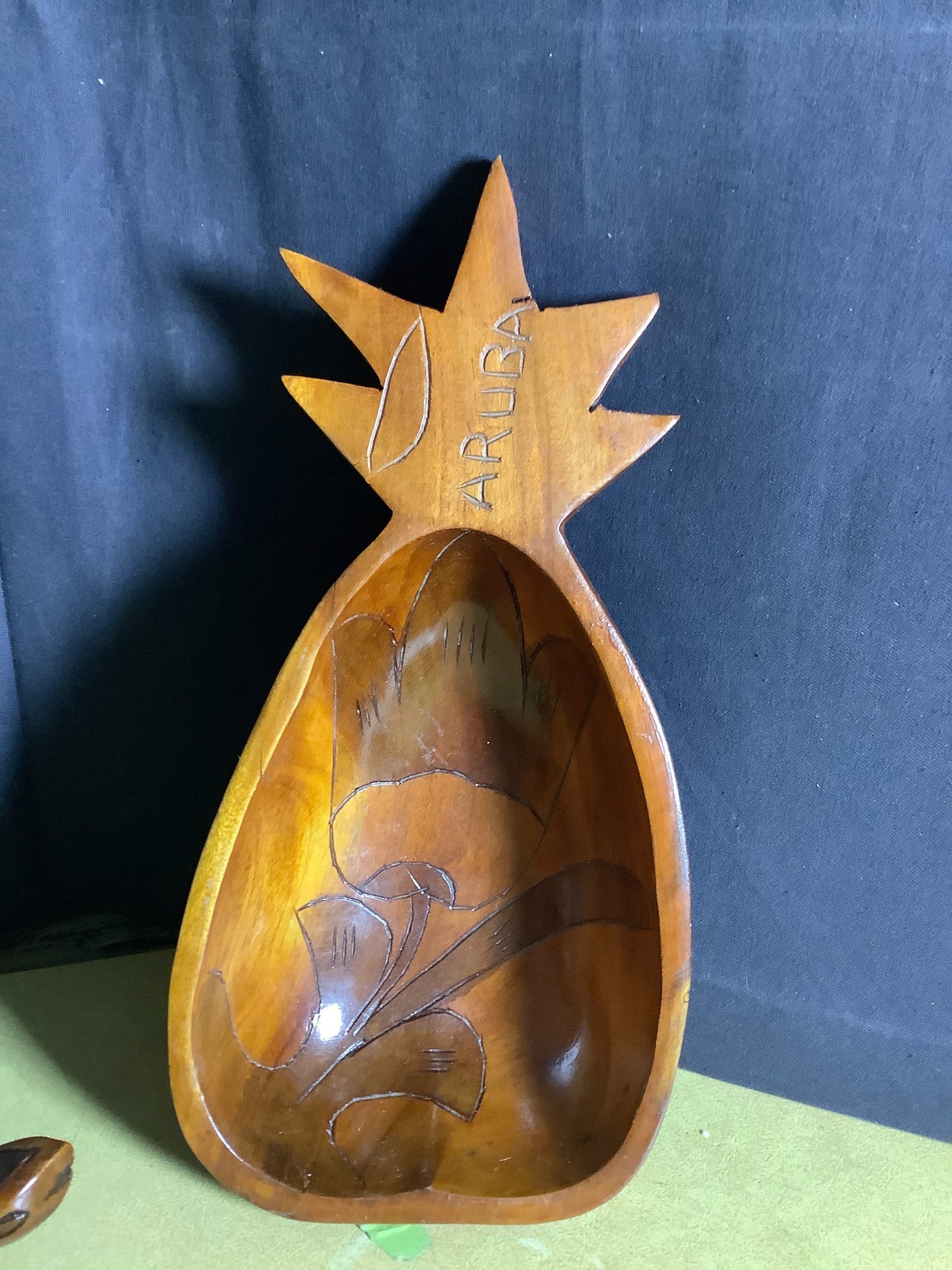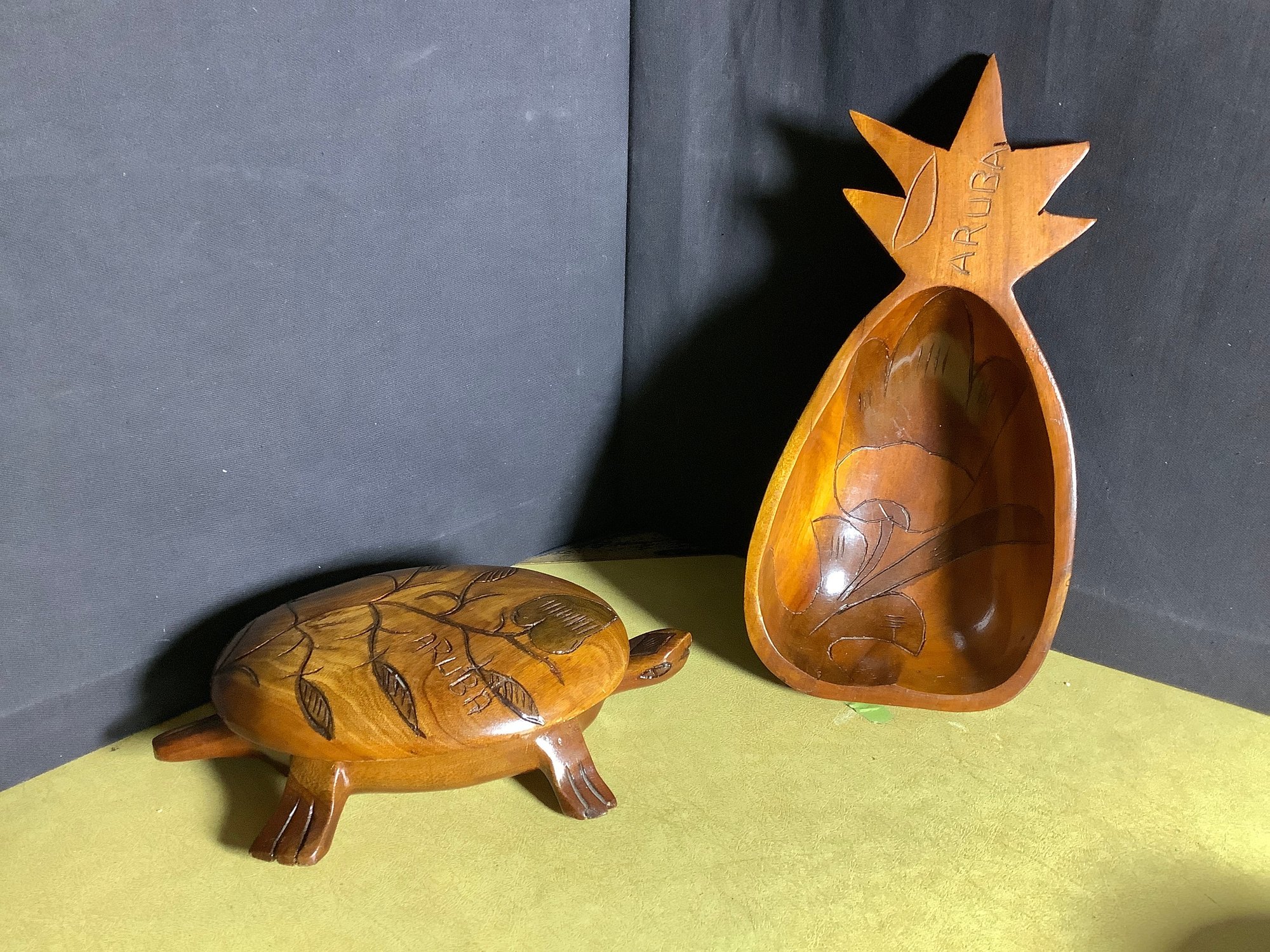 Carved wood Aruba Pineapple Bowl 11-1/2” x 5-1/2” x 2-1/2” tall. Carved wood Aruba turtle trinket dish 9” x 5-1/2” x 2-1/2” tall. Photos are part of the description. Preowned.