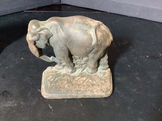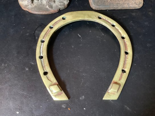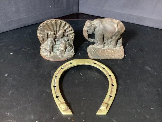 Cast Iron book ends and brass horse shoe. The elephant is marked Bronmet. Photos are part of the description. Pre-owned.