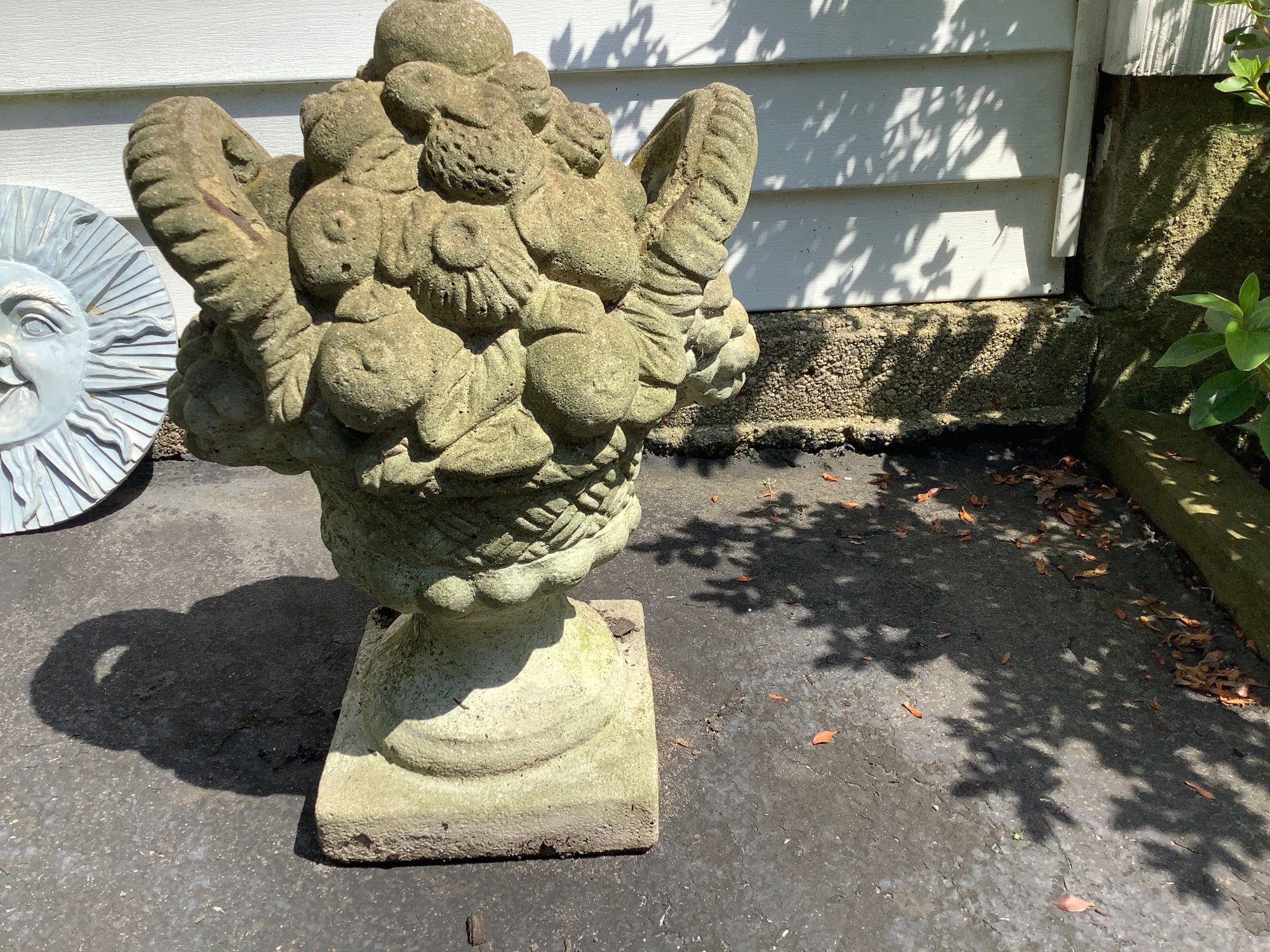 Cement Fruit Basket. Size 17” tall. Heavy bring help to move!!!Located in back yard. Photos are part of the description. Preowned . NO SHIPPING.