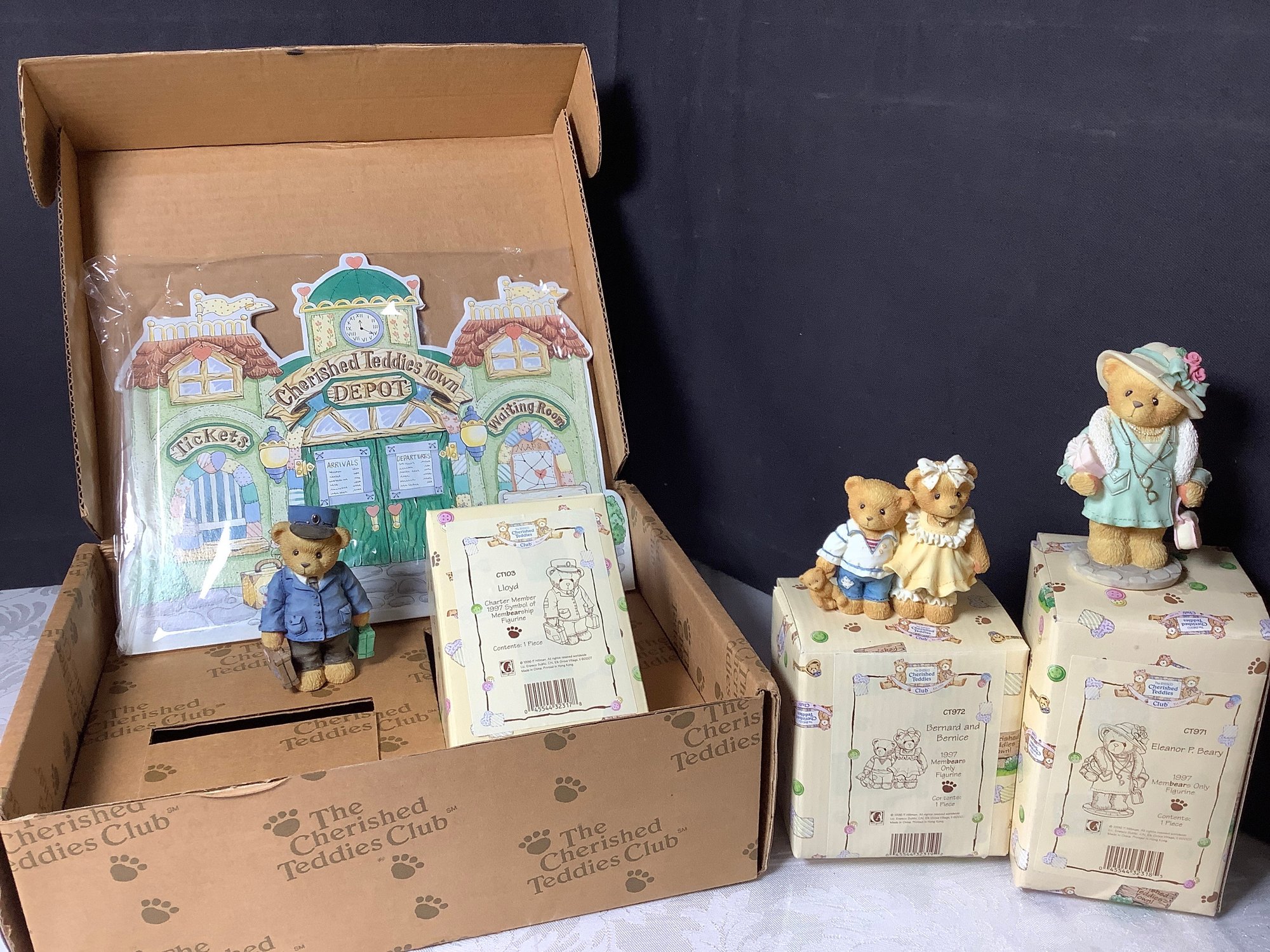 Pictured is the Cherished Teddies Town Depot with LLoyd the Conductor. Included is the village and Lloyd but the pin is missing.