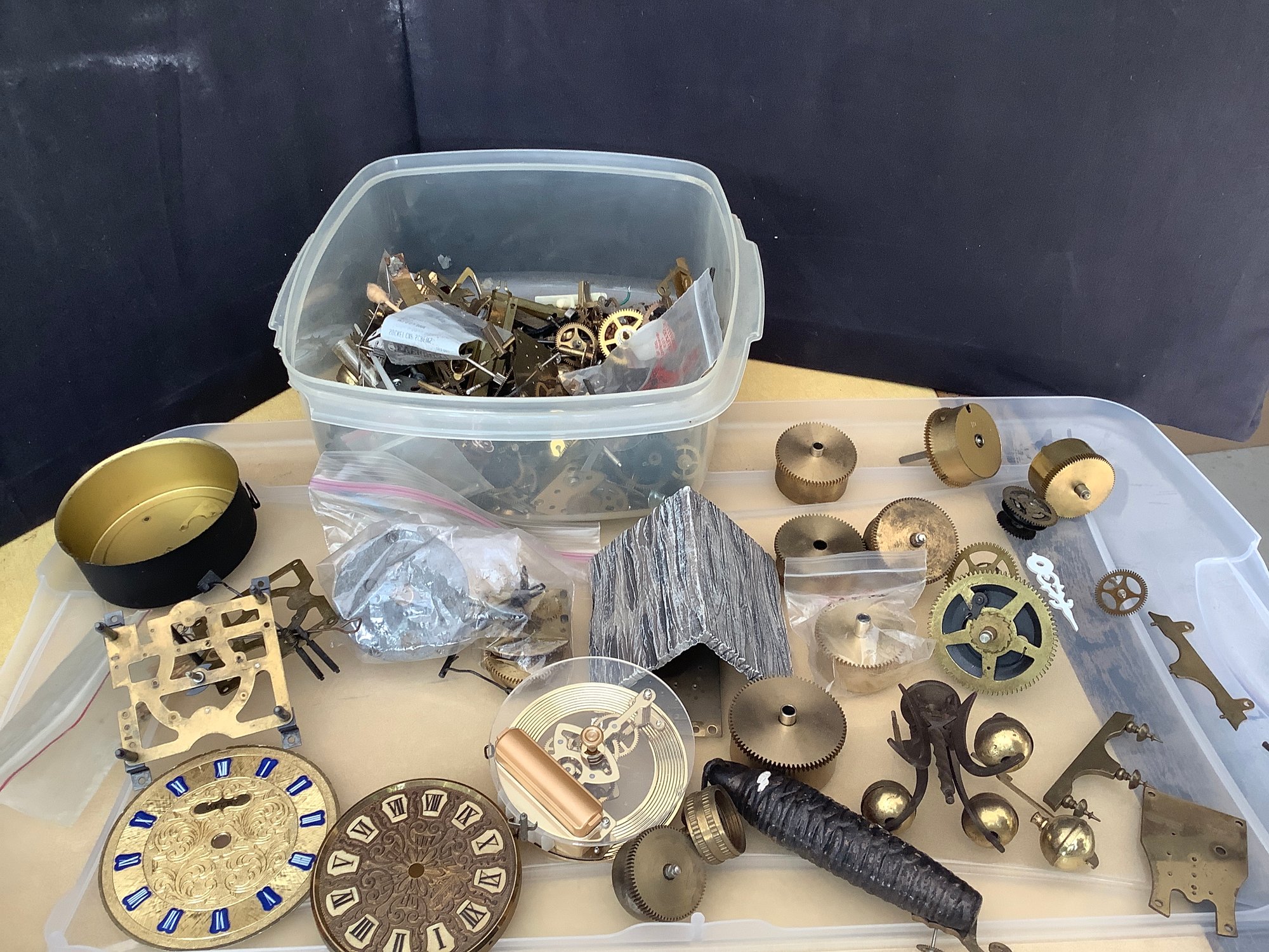 Dial faces, springs, Pendulum , gears and lots of small parts for repairing clocks.