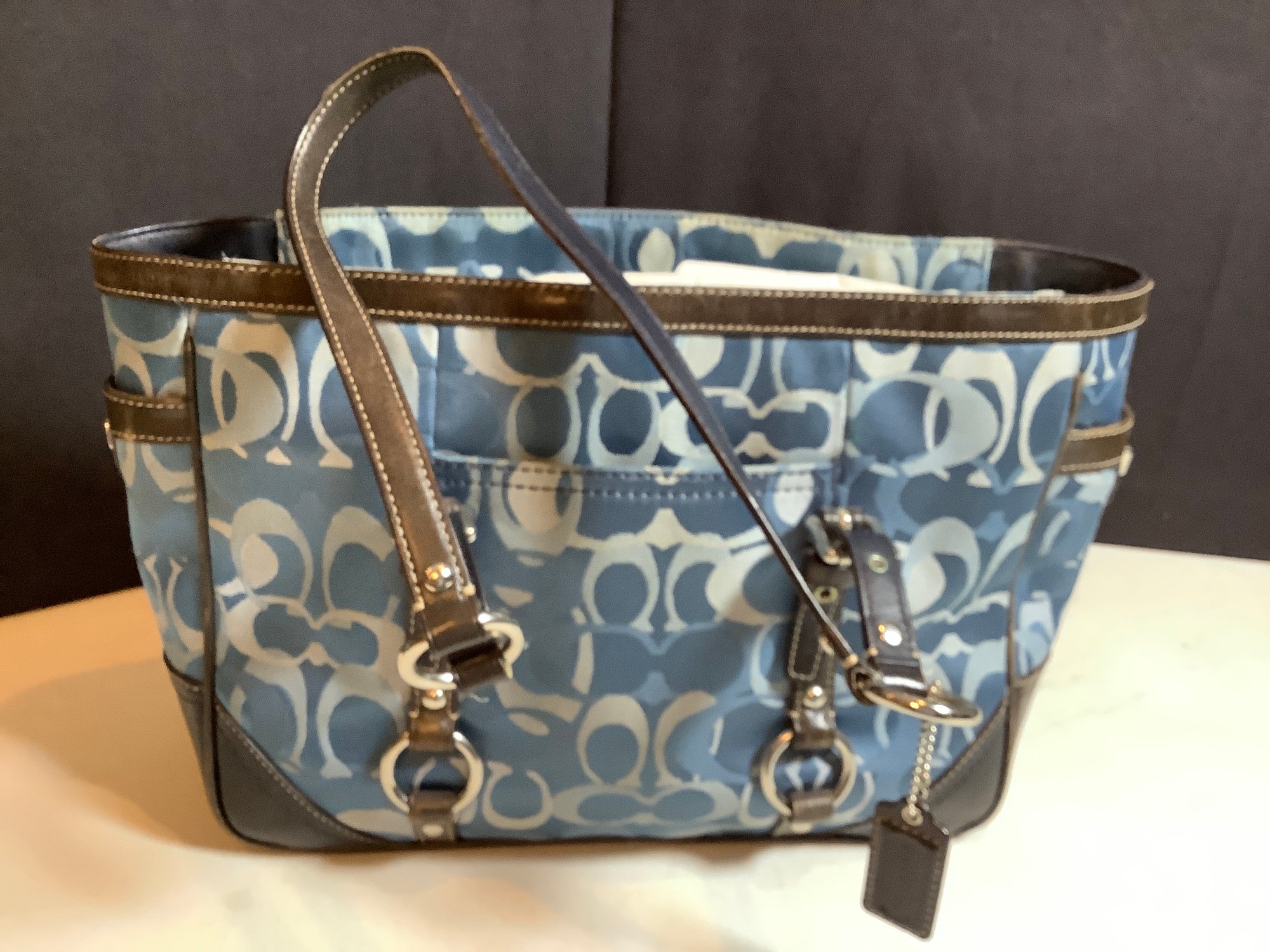 Coach hand bag. Size approximately 12” wide and 9” tall does not include handles. Very clean inside. Photos are part of the description. Color Blue. Preowned