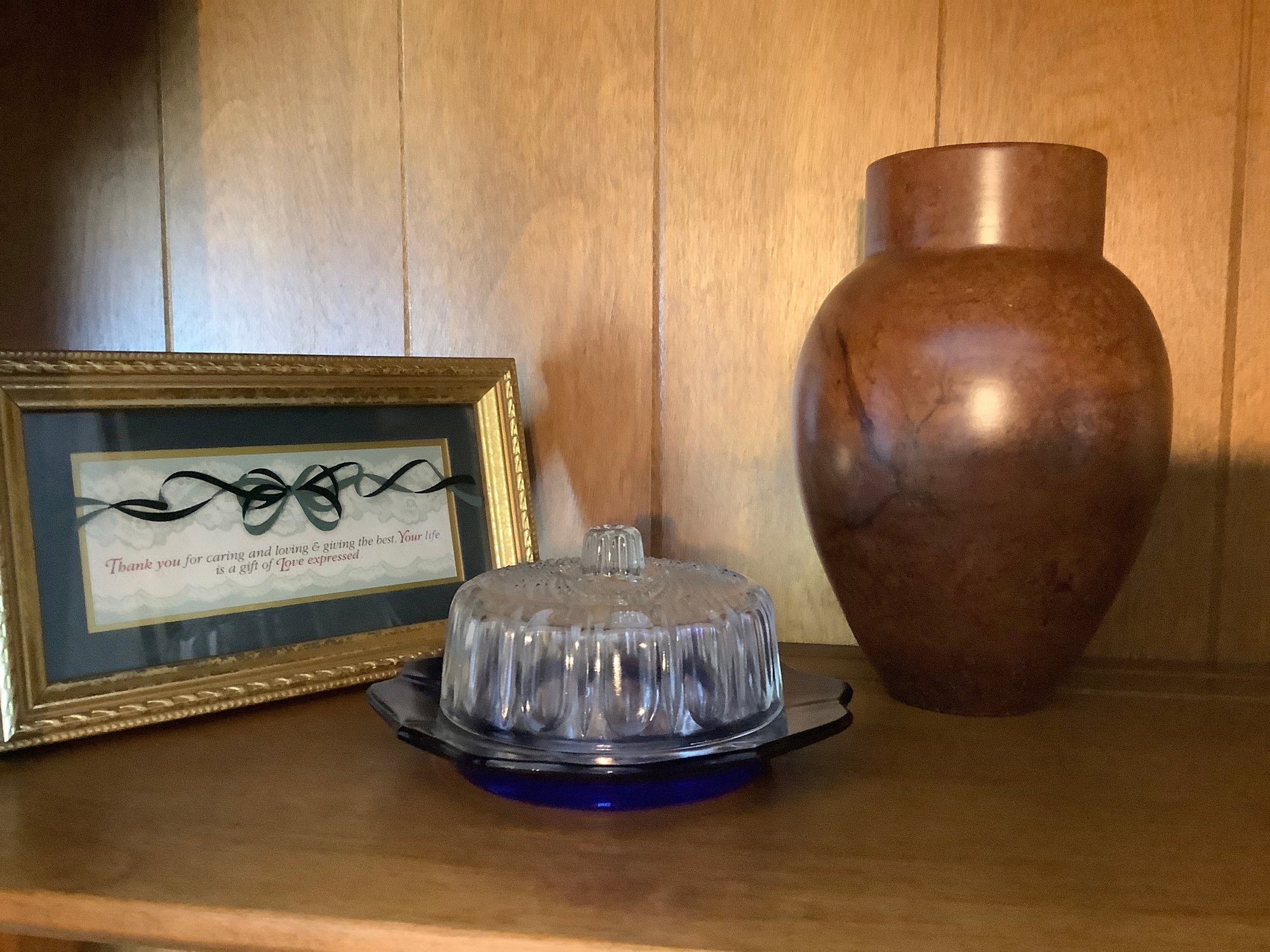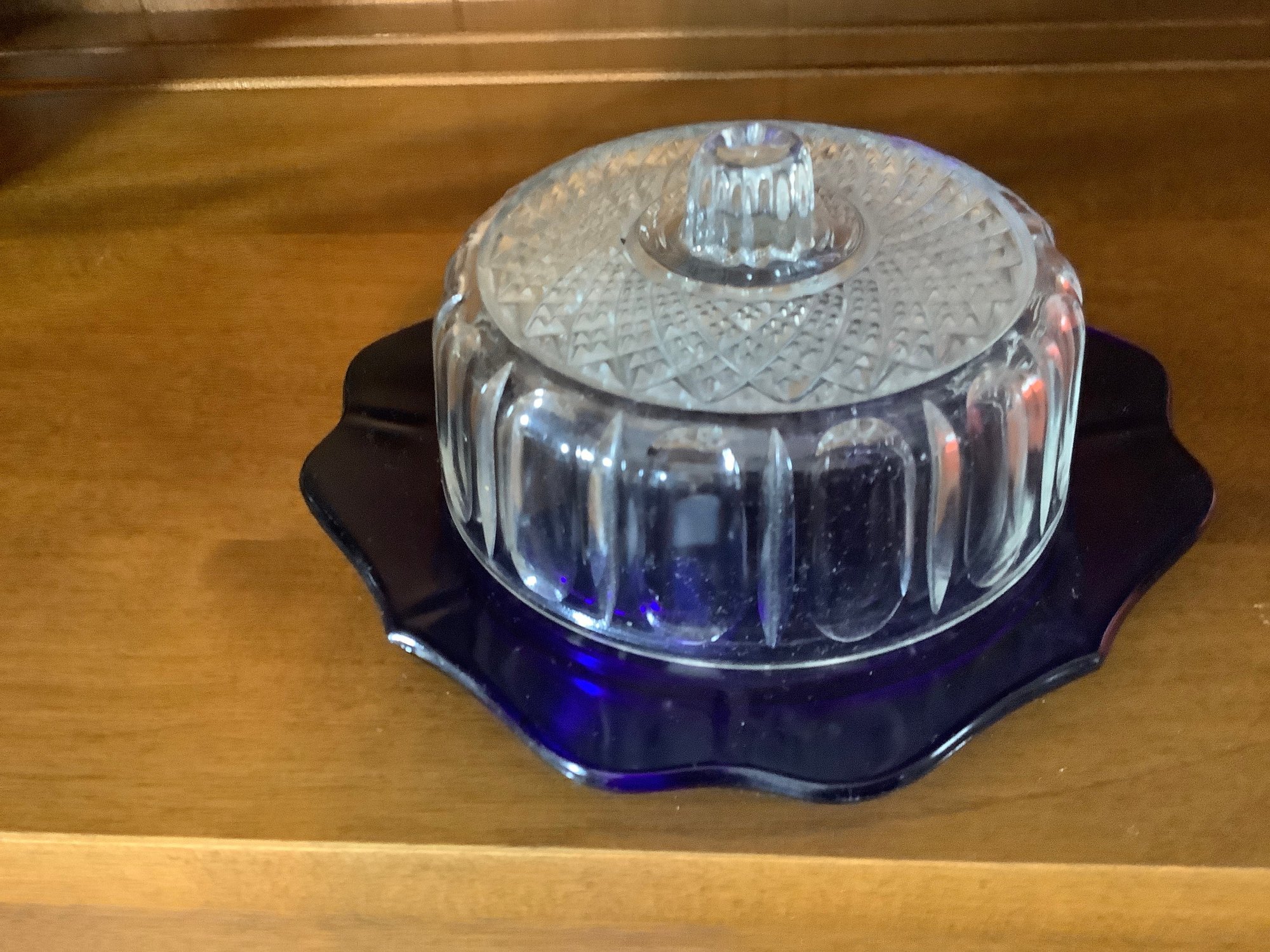 2.) Additionally, we have a beautiful cobalt blue colored glass base with a matching clear Lid by The Imperial Glass Co. This piece may be used for butter or cheese.