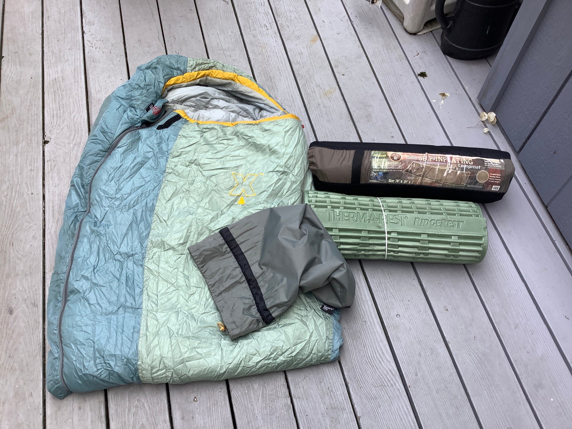 Coleman sleeping bag rated 15 degrees with stuff sack. Two ground mats. Photos are part of the description . Pre-owned. NO SHIPPING.