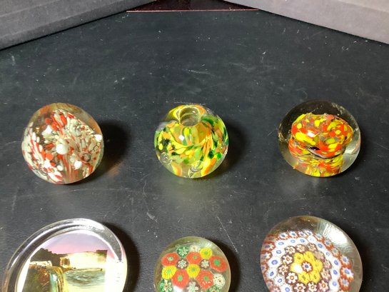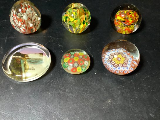 Collection of 6 paperweights. The tallest is 2-1/2”. Photos are part of the description. Preowned. NO SHIPPING.