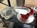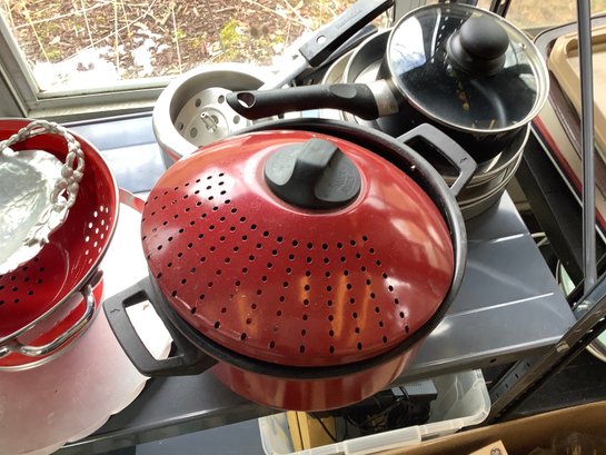Cookware shelf lot. Includes pots, strainers and aluminum ware. Photos are part of the description. Preowned. NO SHIPPING.