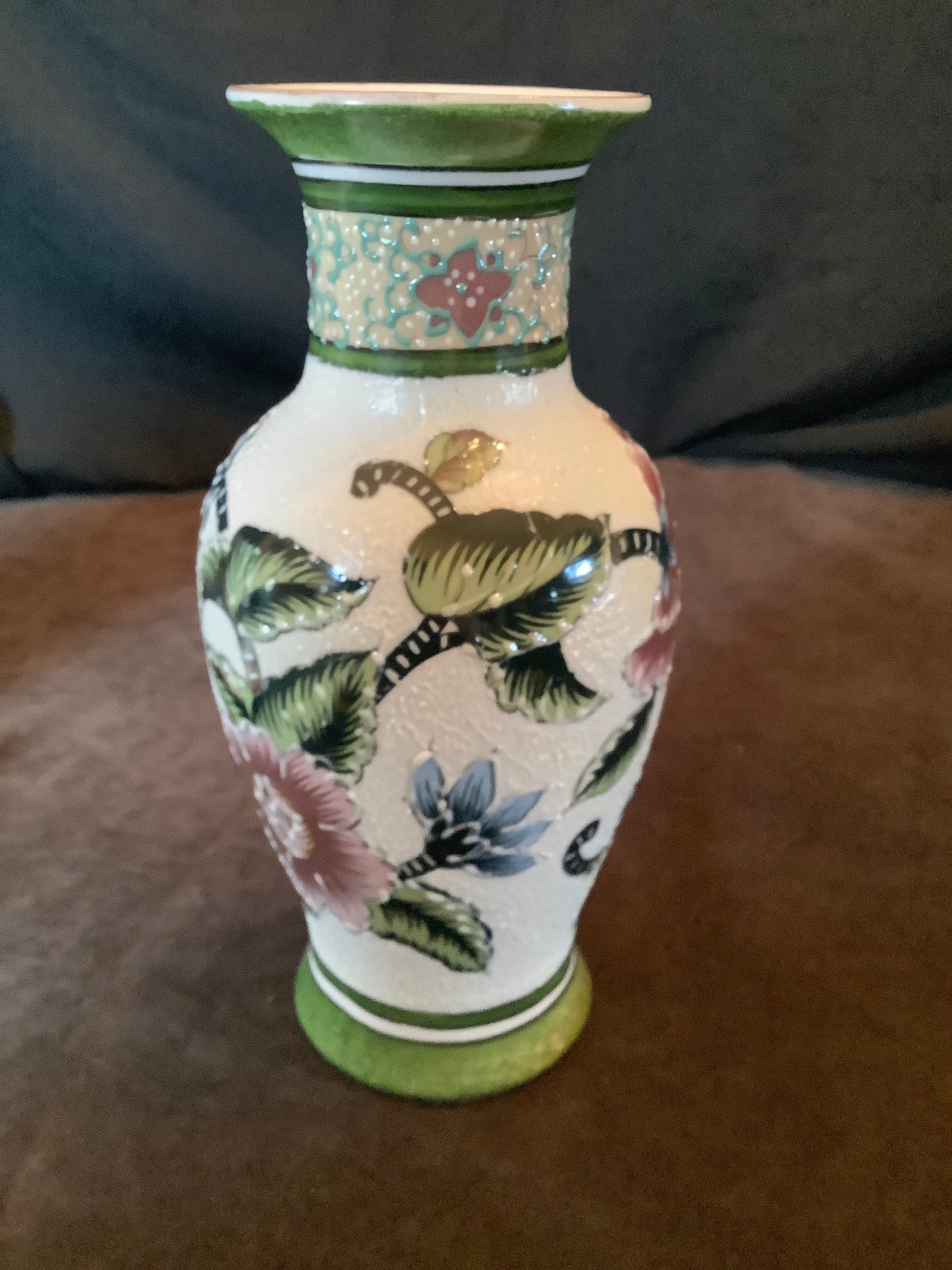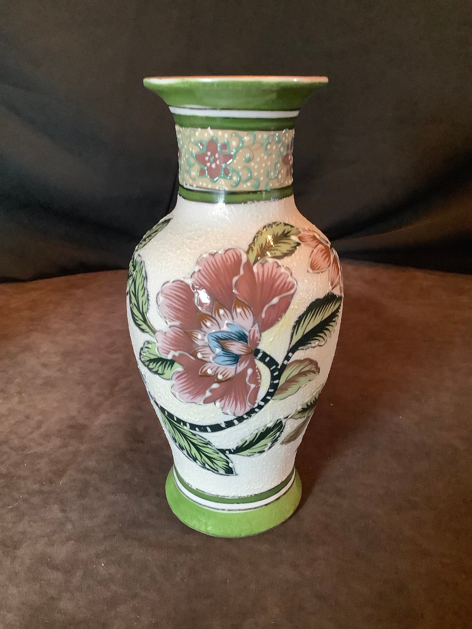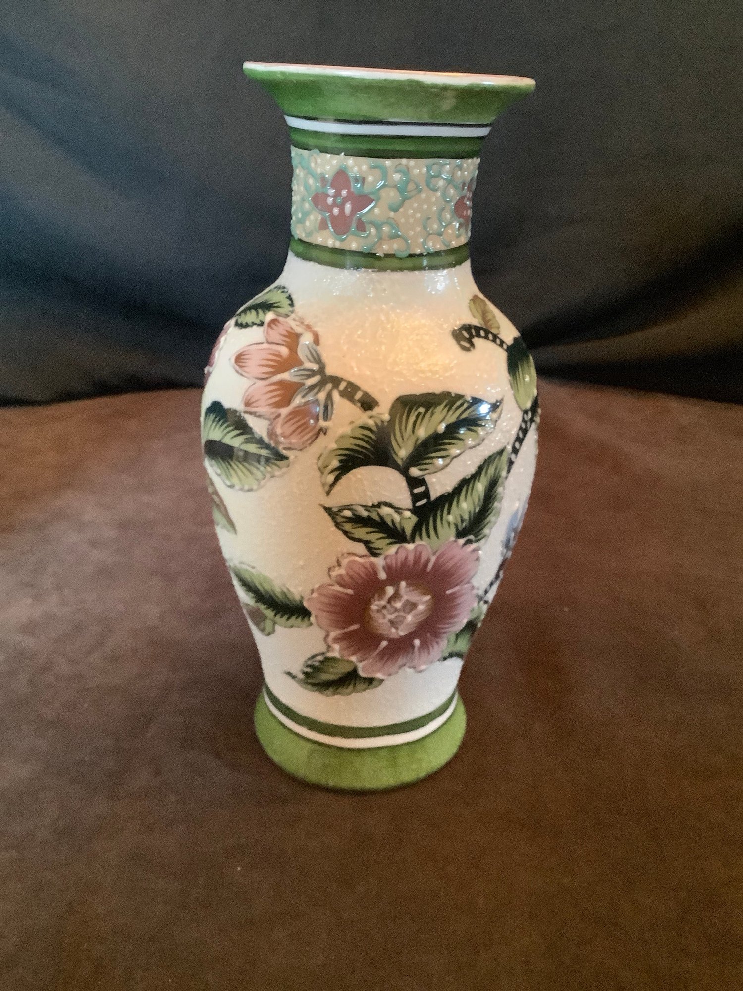 It ‘s hand painted flower are crimson and blue colored . Each one has defined edges accented with white beading which is a special technique added during glazing. This unique style is carried out around the leaves as well.